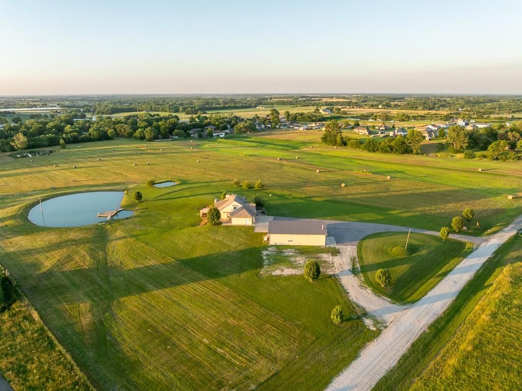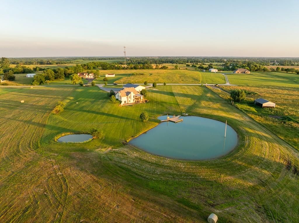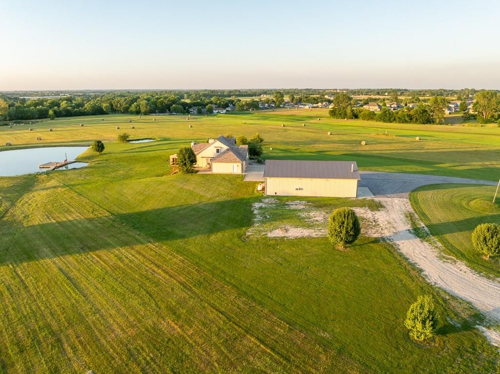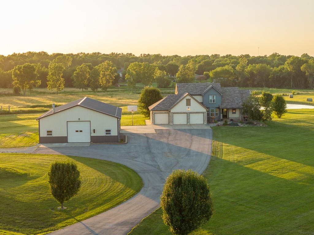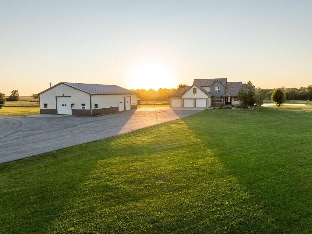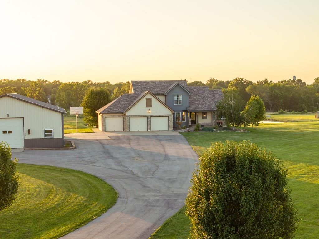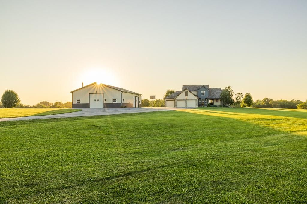 Luxury living awaits on this stunning 10-acre estate! Secluded on a paved deadend road on the south side of Garden City in Southeast Cass County, the move-in-ready, 1.5-story home boasts 3,794 square feet of high-quality living space, featuring 4 bedrooms and 3.5 baths. Premium finishes throughout include granite countertops, rich hardwood floors, new carpet, fresh paint, wide crown molding, and choice light fixtures. Ideal for entertaining, the floorplan contains dining space off the kitchen, a massive great room with 10' ceiling, large fireplace, and surround sound, an elegant formal dining room, as well as a covered deck with an outdoor fireplace and spectacular views. The gorgeous kitchen offers a large island with a gas cooktop and elevated seating, extensive cabinet space, and stainless appliances, including dual ovens. The main-level master suite has vaulted ceilings, a gas fireplace, spacious bathroom with his & her sinks, oversized soaking tub, large walk-in shower, and extensive closet space with laundry. Additional laundry hookups are located in the laundry and/or mudroom between the kitchen and garage. The second floor contains two large bedrooms, a full bath, and large walk-in closet. The finished walkout basement offers a premium bar with sink, game area, living room, fourth bedroom, full bath, and storage space.The exterior of the home has stone accents, a newer roof, charming landscaping, and a large back patio. The 40x60 shop building is loaded with features. The insulated building has a concrete floor, three overhead doors, power, water, heating & cooling, a bathroom, and windows. The grounds feature beautiful scenery, a paved driveway, well-maintained lawn, stocked -acre pond with a dock, and a firepit. The property is located within the Sherwood School District, and is just 40 minutes from the Kansas City metro. The Seller will consider offers on additional acreage.