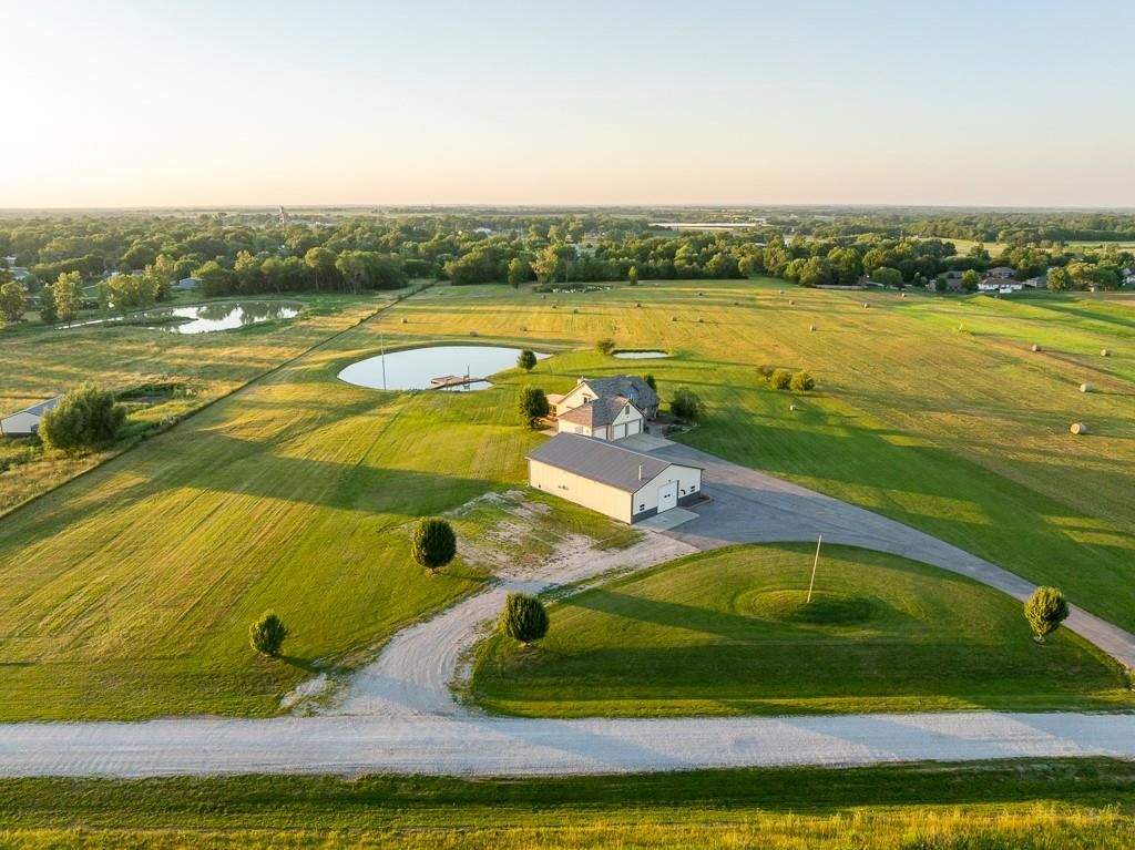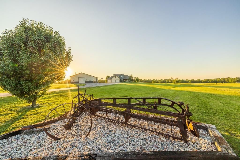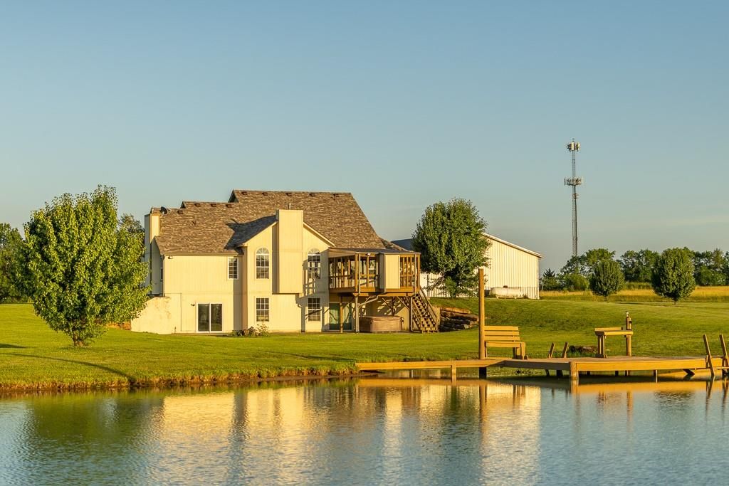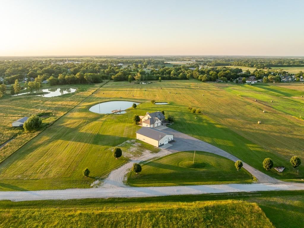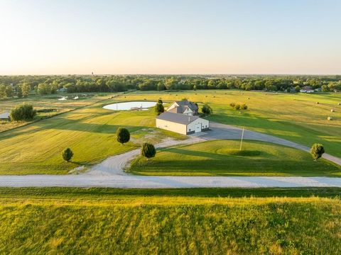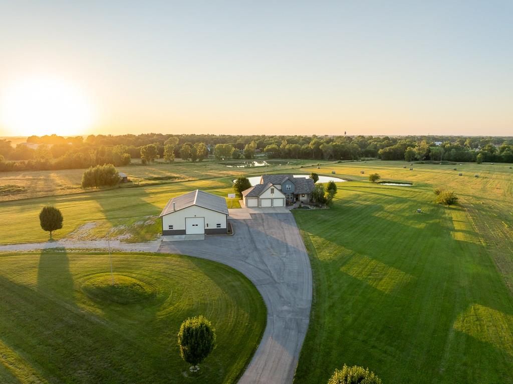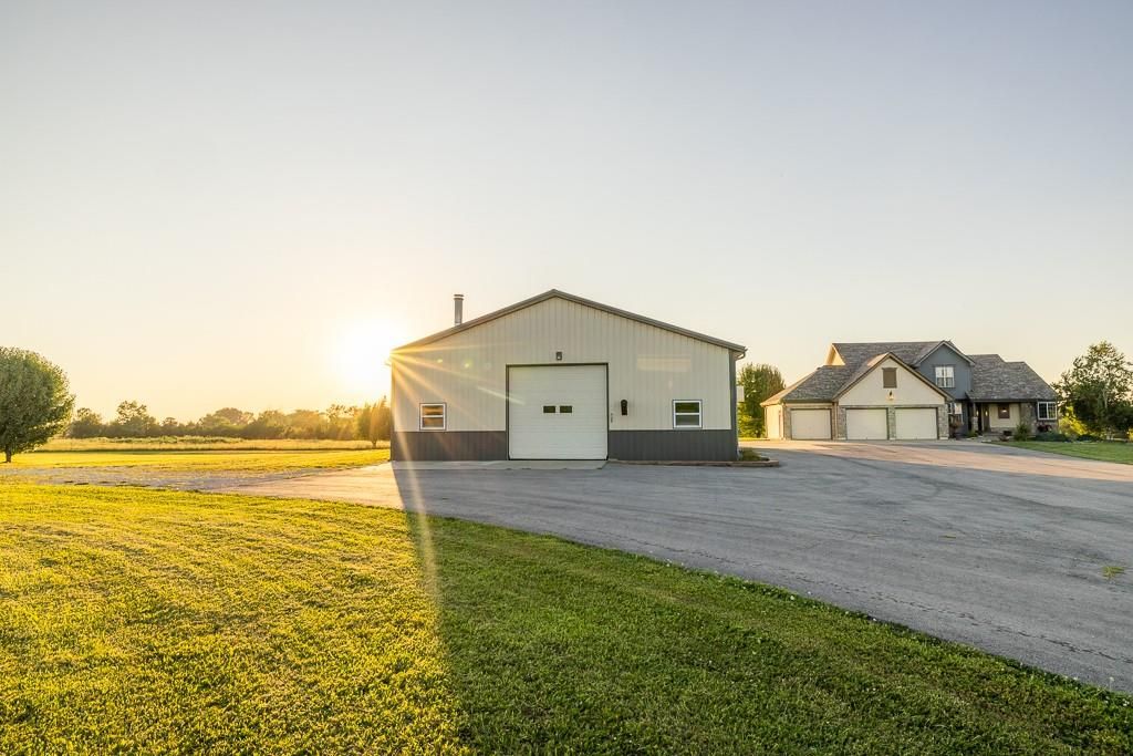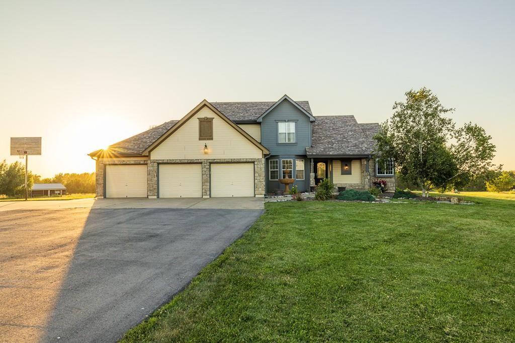 Luxury living awaits on this stunning 10-acre estate! Secluded on a paved deadend road on the south side of Garden City in Southeast Cass County, the move-in-ready, 1.5-story home boasts 3,794 square feet of high-quality living space, featuring 4 bedrooms and 3.5 baths. Premium finishes throughout include granite countertops, rich hardwood floors, new carpet, fresh paint, wide crown molding, and choice light fixtures. Ideal for entertaining, the floorplan contains dining space off the kitchen, a massive great room with 10' ceiling, large fireplace, and surround sound, an elegant formal dining room, as well as a covered deck with an outdoor fireplace and spectacular views. The gorgeous kitchen offers a large island with a gas cooktop and elevated seating, extensive cabinet space, and stainless appliances, including dual ovens. The main-level master suite has vaulted ceilings, a gas fireplace, spacious bathroom with his & her sinks, oversized soaking tub, large walk-in shower, and extensive closet space with laundry. Additional laundry hookups are located in the laundry and/or mudroom between the kitchen and garage. The second floor contains two large bedrooms, a full bath, and large walk-in closet. The finished walkout basement offers a premium bar with sink, game area, living room, fourth bedroom, full bath, and storage space.The exterior of the home has stone accents, a newer roof, charming landscaping, and a large back patio. The 40x60 shop building is loaded with features. The insulated building has a concrete floor, three overhead doors, power, water, heating & cooling, a bathroom, and windows. The grounds feature beautiful scenery, a paved driveway, well-maintained lawn, stocked -acre pond with a dock, and a firepit. The property is located within the Sherwood School District, and is just 40 minutes from the Kansas City metro. The Seller will consider offers on additional acreage.