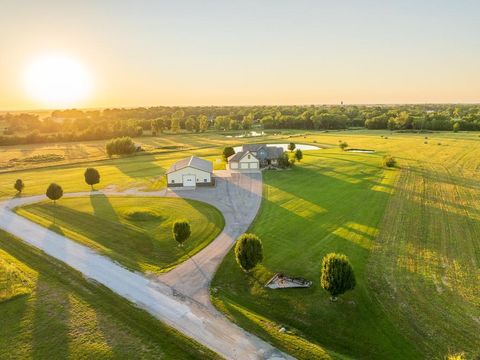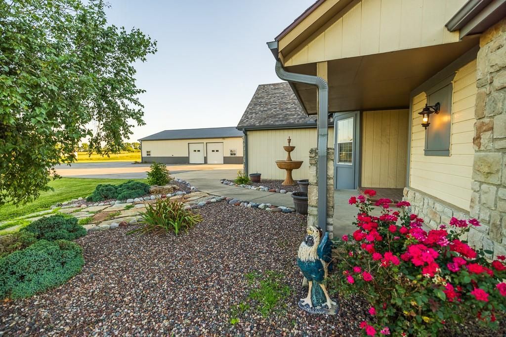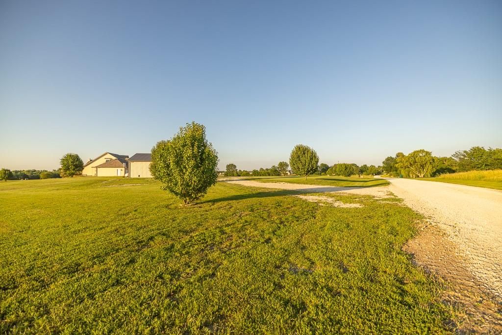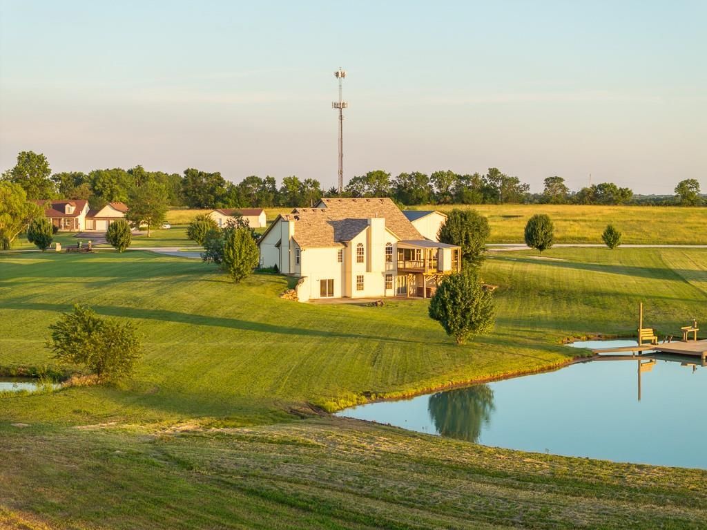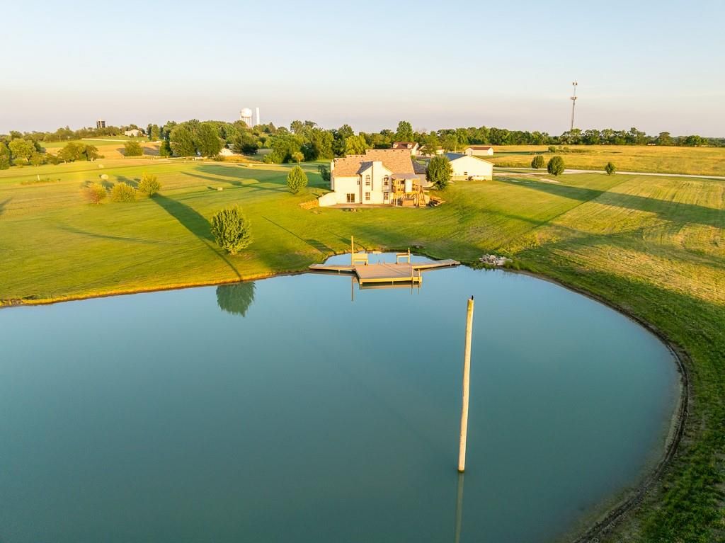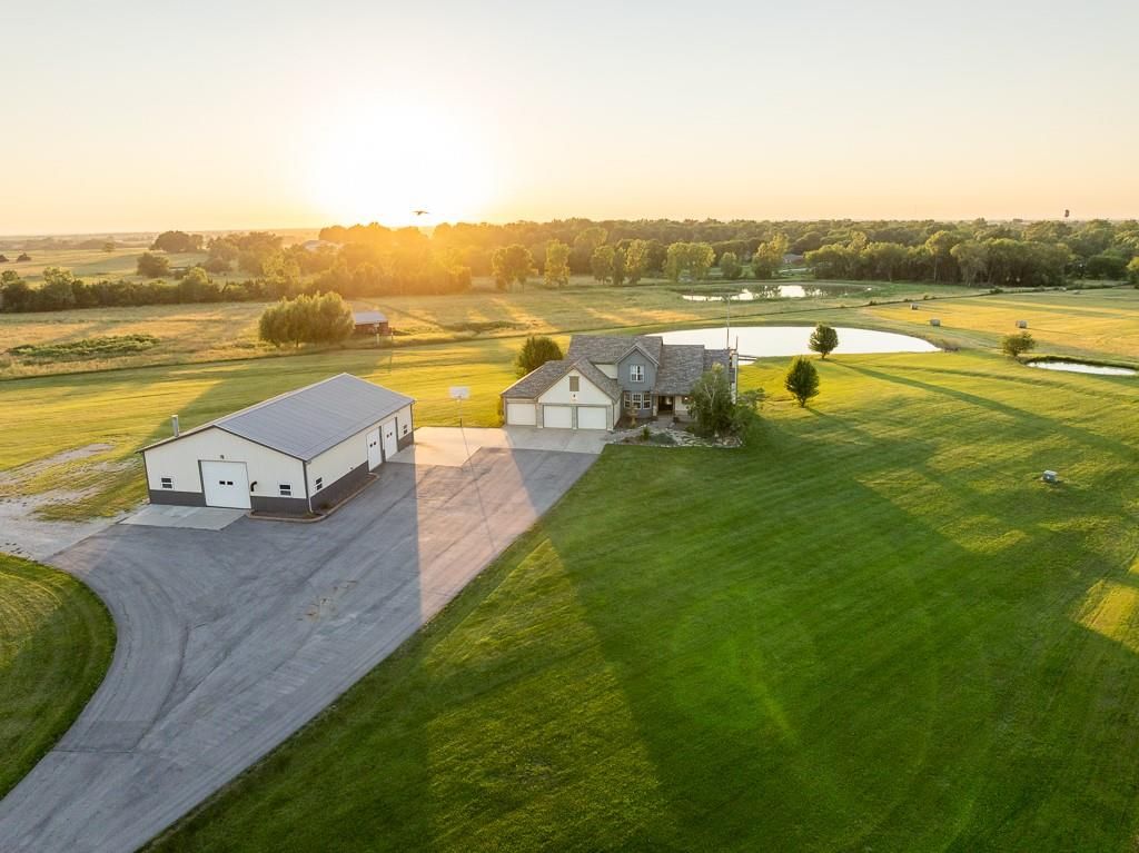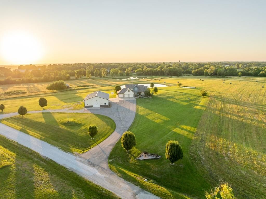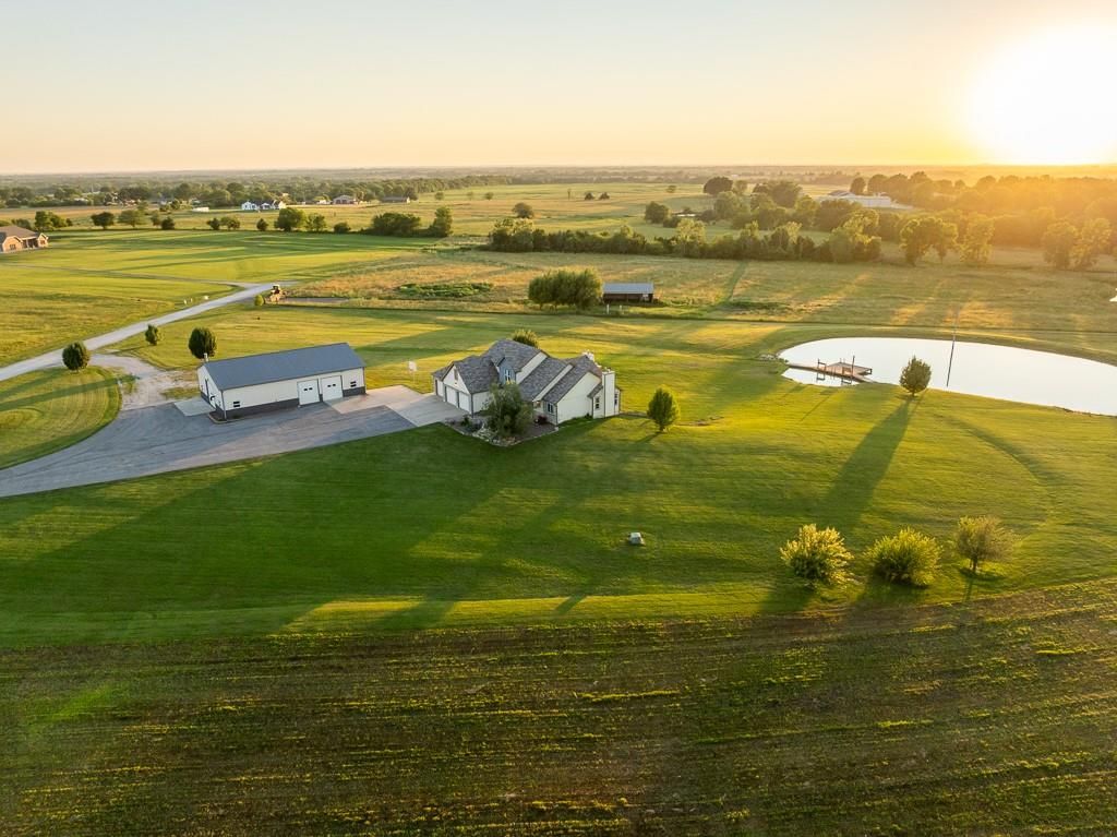 Luxury living awaits on this stunning 10-acre estate! Secluded on a paved deadend road on the south side of Garden City in Southeast Cass County, the move-in-ready, 1.5-story home boasts 3,794 square feet of high-quality living space, featuring 4 bedrooms and 3.5 baths. Premium finishes throughout include granite countertops, rich hardwood floors, new carpet, fresh paint, wide crown molding, and choice light fixtures. Ideal for entertaining, the floorplan contains dining space off the kitchen, a massive great room with 10' ceiling, large fireplace, and surround sound, an elegant formal dining room, as well as a covered deck with an outdoor fireplace and spectacular views. The gorgeous kitchen offers a large island with a gas cooktop and elevated seating, extensive cabinet space, and stainless appliances, including dual ovens. The main-level master suite has vaulted ceilings, a gas fireplace, spacious bathroom with his & her sinks, oversized soaking tub, large walk-in shower, and extensive closet space with laundry. Additional laundry hookups are located in the laundry and/or mudroom between the kitchen and garage. The second floor contains two large bedrooms, a full bath, and large walk-in closet. The finished walkout basement offers a premium bar with sink, game area, living room, fourth bedroom, full bath, and storage space.The exterior of the home has stone accents, a newer roof, charming landscaping, and a large back patio. The 40x60 shop building is loaded with features. The insulated building has a concrete floor, three overhead doors, power, water, heating & cooling, a bathroom, and windows. The grounds feature beautiful scenery, a paved driveway, well-maintained lawn, stocked -acre pond with a dock, and a firepit. The property is located within the Sherwood School District, and is just 40 minutes from the Kansas City metro. The Seller will consider offers on additional acreage.
