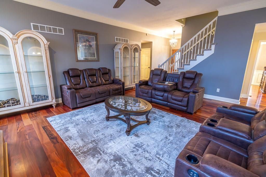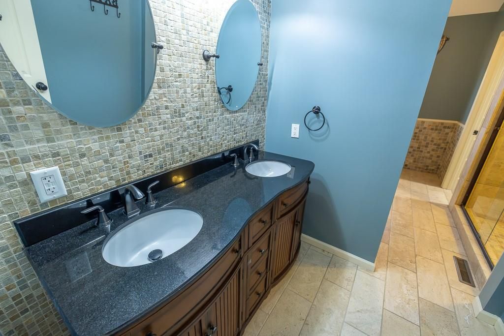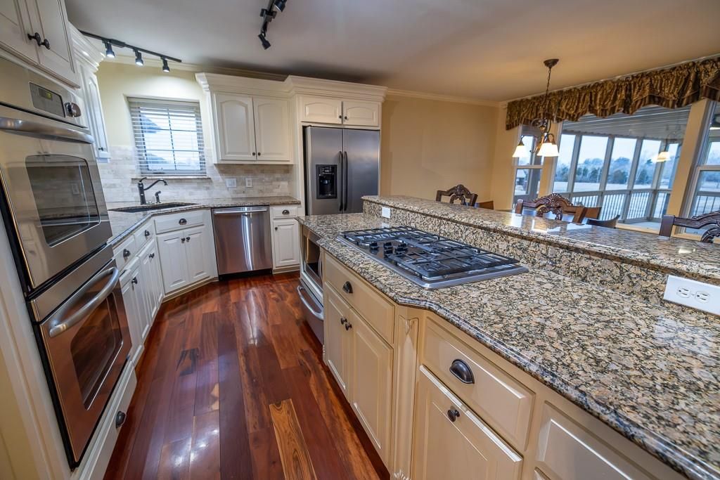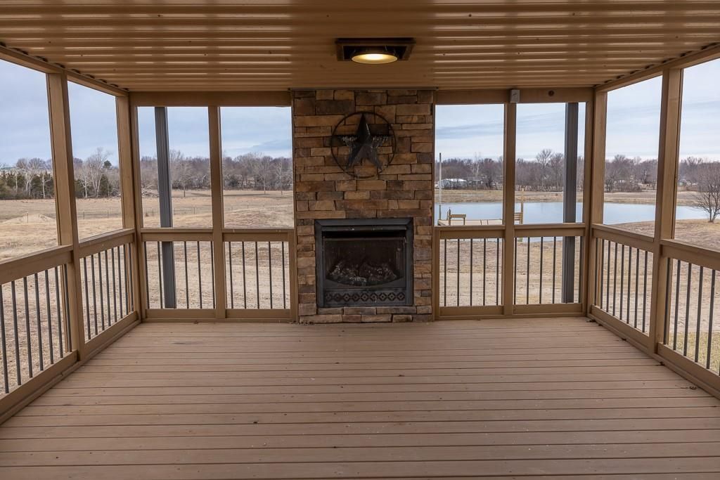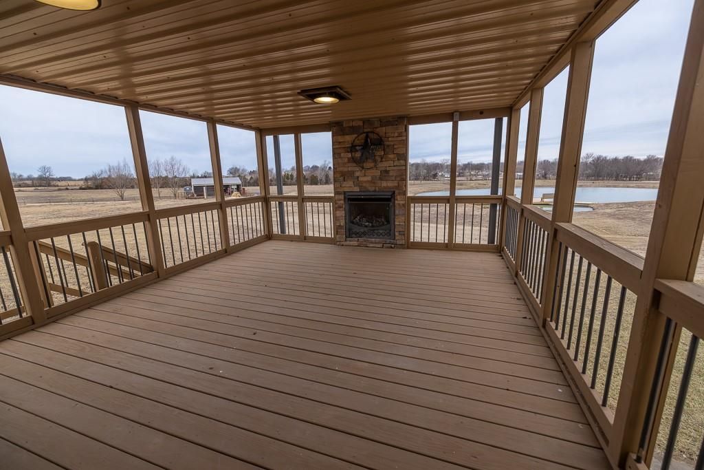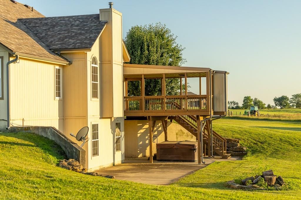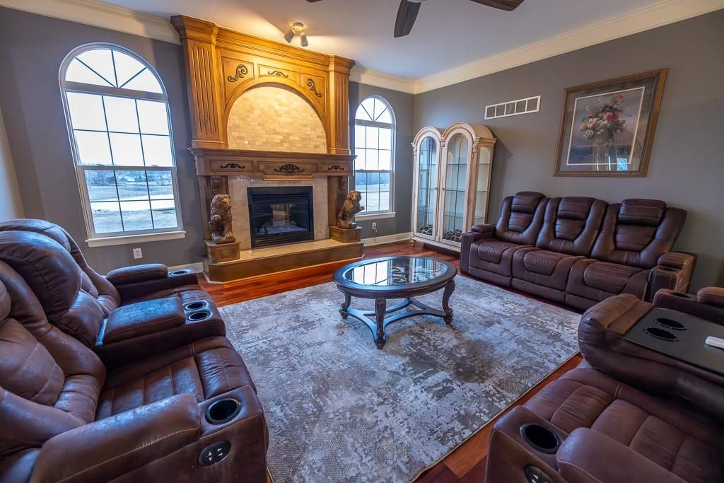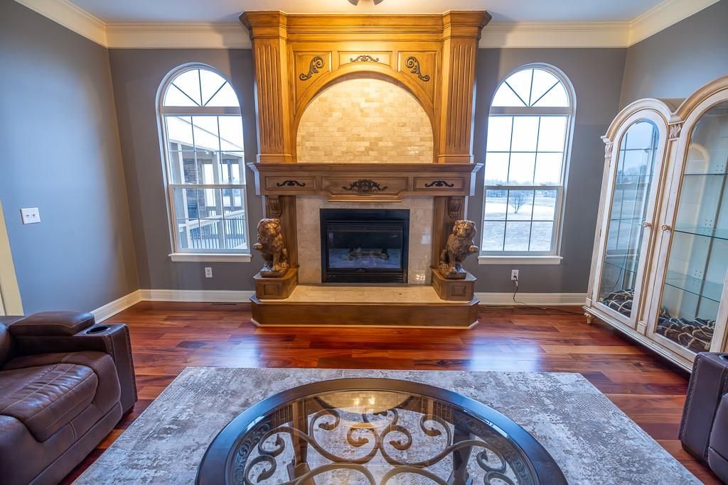Luxury living awaits on this stunning 10-acre estate! Secluded on a paved deadend road on the south side of Garden City in Southeast Cass County, the move-in-ready, 1.5-story home boasts 3,794 square feet of high-quality living space, featuring 4 bedrooms and 3.5 baths. Premium finishes throughout include granite countertops, rich hardwood floors, new carpet, fresh paint, wide crown molding, and choice light fixtures. Ideal for entertaining, the floorplan contains dining space off the kitchen, a massive great room with 10' ceiling, large fireplace, and surround sound, an elegant formal dining room, as well as a covered deck with an outdoor fireplace and spectacular views. The gorgeous kitchen offers a large island with a gas cooktop and elevated seating, extensive cabinet space, and stainless appliances, including dual ovens. The main-level master suite has vaulted ceilings, a gas fireplace, spacious bathroom with his & her sinks, oversized soaking tub, large walk-in shower, and extensive closet space with laundry. Additional laundry hookups are located in the laundry and/or mudroom between the kitchen and garage. The second floor contains two large bedrooms, a full bath, and large walk-in closet. The finished walkout basement offers a premium bar with sink, game area, living room, fourth bedroom, full bath, and storage space.The exterior of the home has stone accents, a newer roof, charming landscaping, and a large back patio. The 40x60 shop building is loaded with features. The insulated building has a concrete floor, three overhead doors, power, water, heating & cooling, a bathroom, and windows. The grounds feature beautiful scenery, a paved driveway, well-maintained lawn, stocked -acre pond with a dock, and a firepit. The property is located within the Sherwood School District, and is just 40 minutes from the Kansas City metro. The Seller will consider offers on additional acreage.