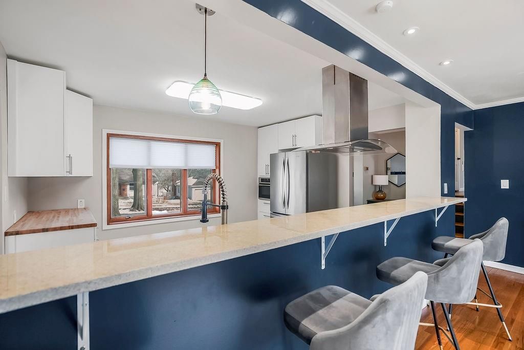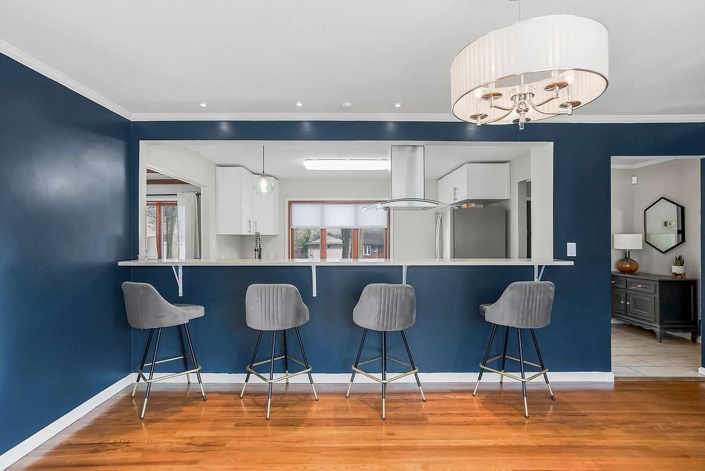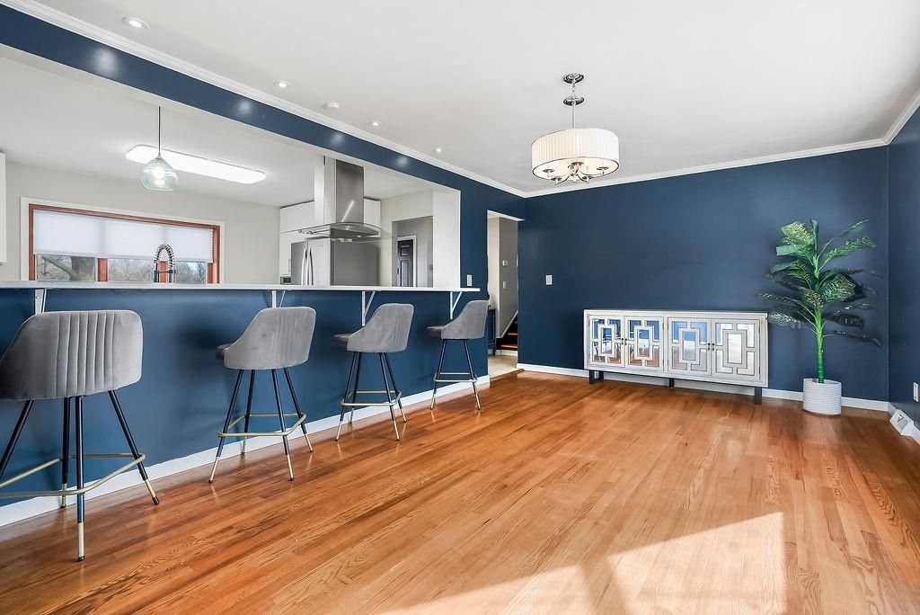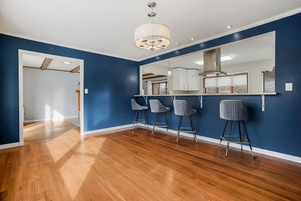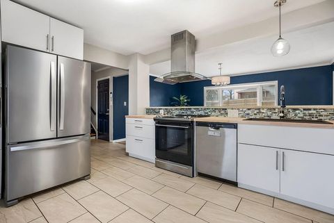 This chic home is ready to welcome you! What a great place to gather friends and family, with its easy flow on the main level from the kitchen to the living room and into the spacious dining room. The dining area features a generous eat-at bar - perfect for casual meals or entertaining. The updated kitchen offers stainless steel appliances, including a French door refrigerator that stays with the home! Step outside to a nice-sized deck, ideal for relaxing or hosting summer get-togethers. Hardwood floors run throughout the living room, dining room, and all three bedrooms, adding warmth and charm. The bathrooms have been tastefully updated, providing a fresh, modern feel. The lower level features a versatile rec room - perfect for a gaming space, family room, movie room, workout space, or whatever fits your lifestyle. There's so much to love about this home!