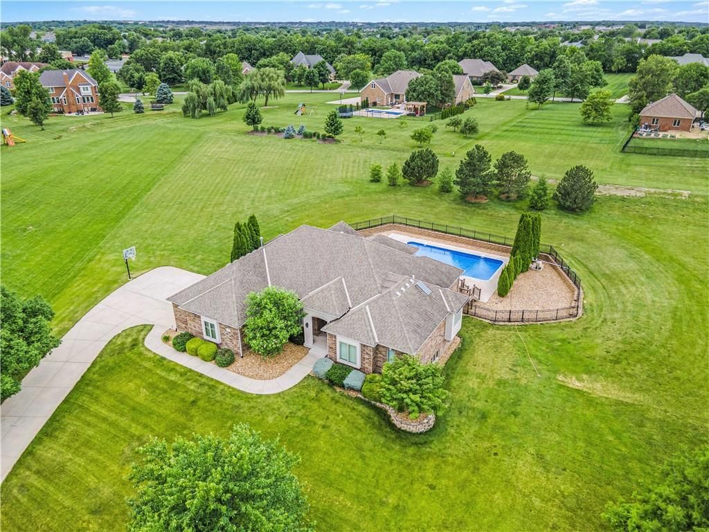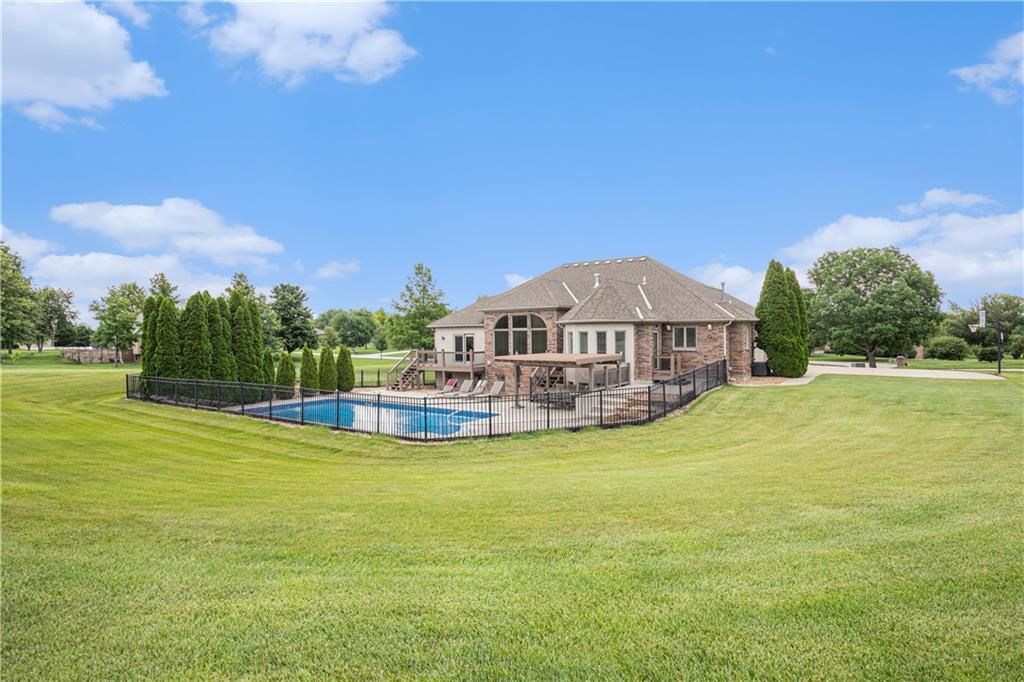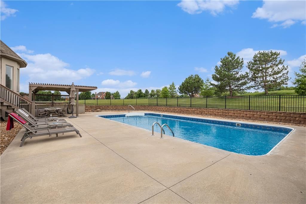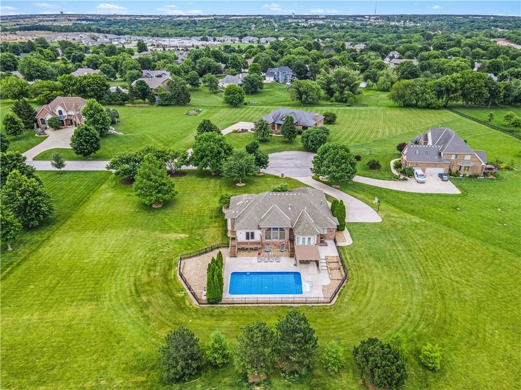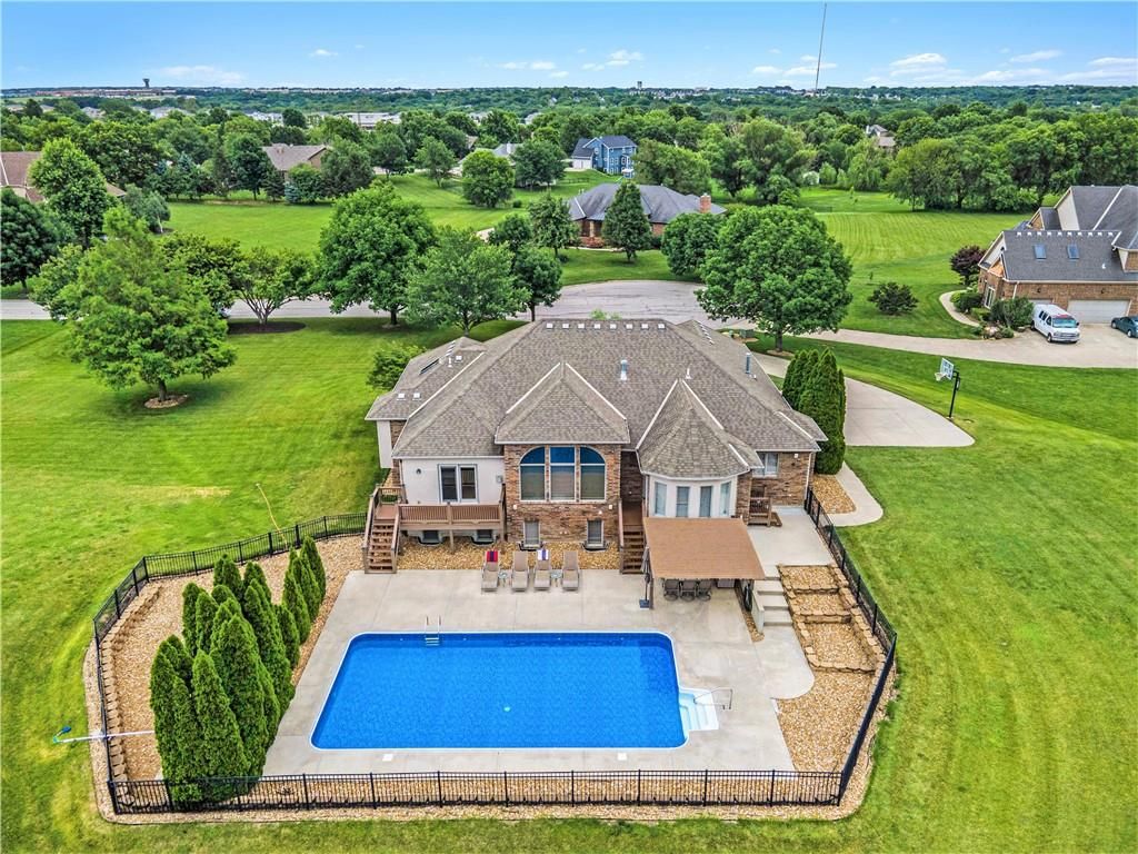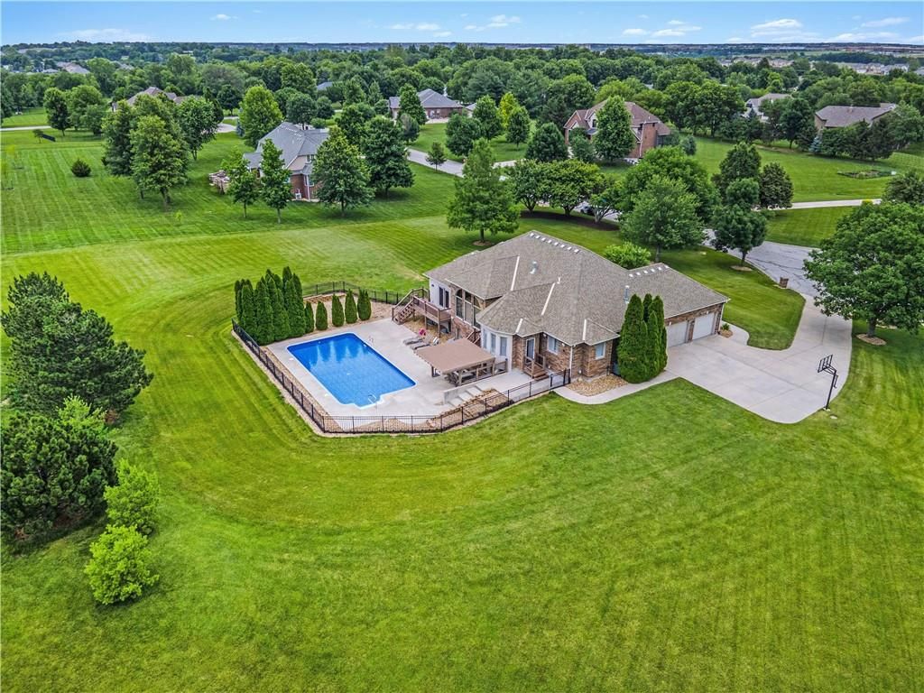 Welcome to this stunning reverse 1.5-story home on a serene 2-acre lot boasting a sparkling pool and an expansive patio with pergola, ideal for outdoor entertaining or quiet relaxation. Step inside and be impressed by the grand entry, where an elegant arched hallway to the left leads into the formal dining room. The main level features an open kitchen with abundant cabinetry, generous counter space, and an eat-in breakfast area that flows into an inviting family room. A separate living room showcases soaring ceilings and walls of windows, filling the space with natural light. The main-level primary suite is a luxurious retreat complete with a cozy fireplace, tray ceiling, and a spa-like en suite offering a double vanity, jetted tub, walk-in shower, and generous walk-in closet. Secondary bedrooms provide flexible options for guests, family, or a home office. Downstairs, the finished lower level delivers even more living space with a wet bar, large recreation area, and an additional gathering room, perfect for movie nights or game days. Combining comfort, functionality, and exceptional outdoor amenities, this home truly has it all.