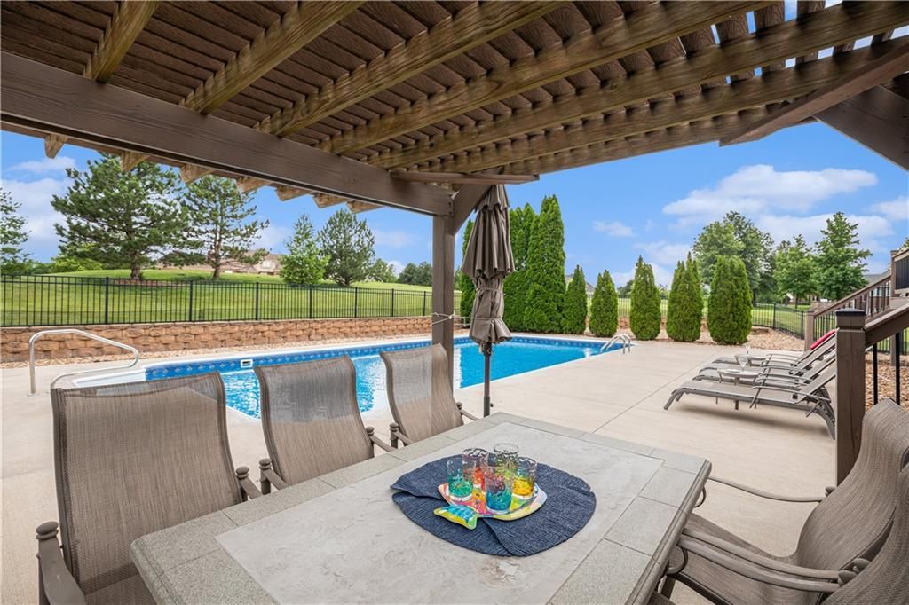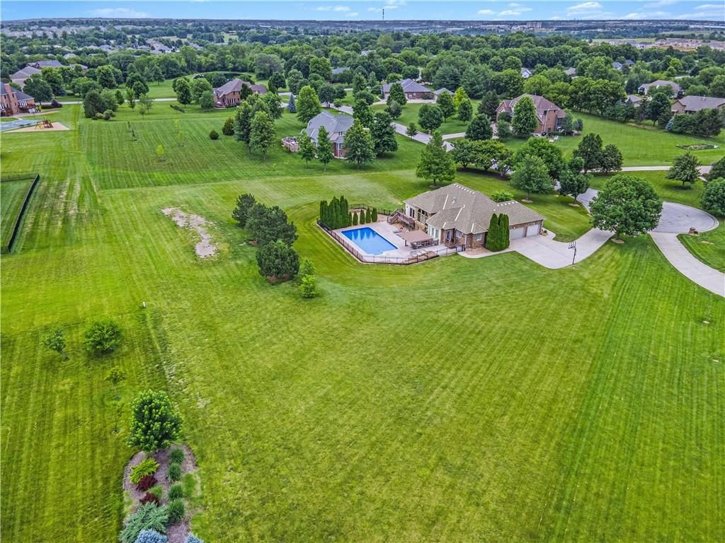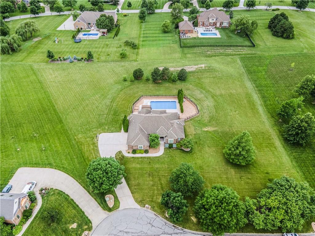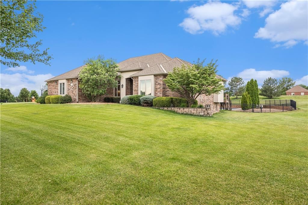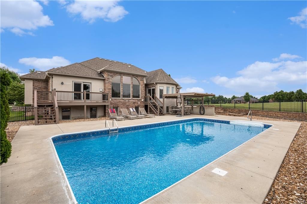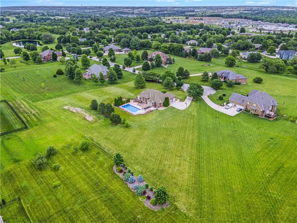 Welcome to this stunning reverse 1.5-story home on a serene 2-acre lot boasting a sparkling pool and an expansive patio with pergola, ideal for outdoor entertaining or quiet relaxation. Step inside and be impressed by the grand entry, where an elegant arched hallway to the left leads into the formal dining room. The main level features an open kitchen with abundant cabinetry, generous counter space, and an eat-in breakfast area that flows into an inviting family room. A separate living room showcases soaring ceilings and walls of windows, filling the space with natural light. The main-level primary suite is a luxurious retreat complete with a cozy fireplace, tray ceiling, and a spa-like en suite offering a double vanity, jetted tub, walk-in shower, and generous walk-in closet. Secondary bedrooms provide flexible options for guests, family, or a home office. Downstairs, the finished lower level delivers even more living space with a wet bar, large recreation area, and an additional gathering room, perfect for movie nights or game days. Combining comfort, functionality, and exceptional outdoor amenities, this home truly has it all.