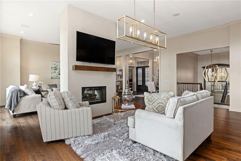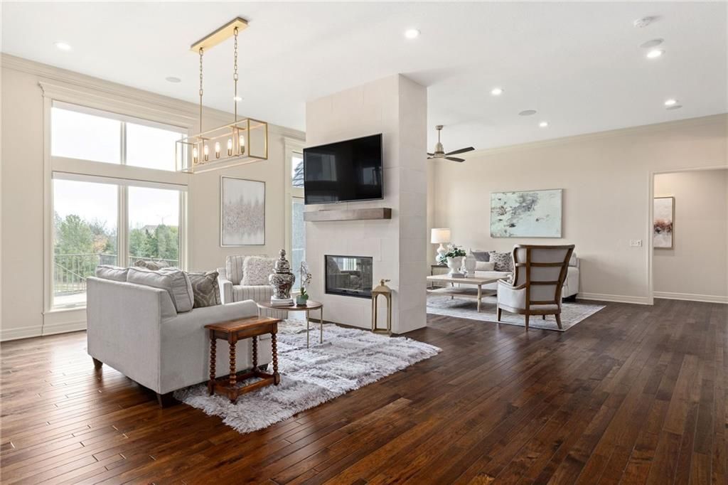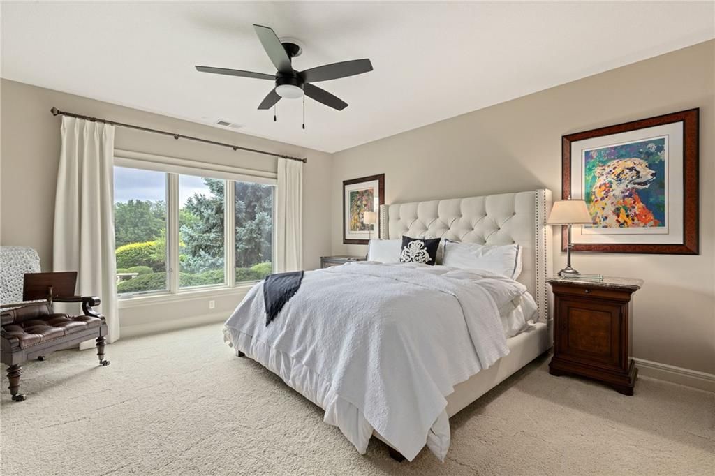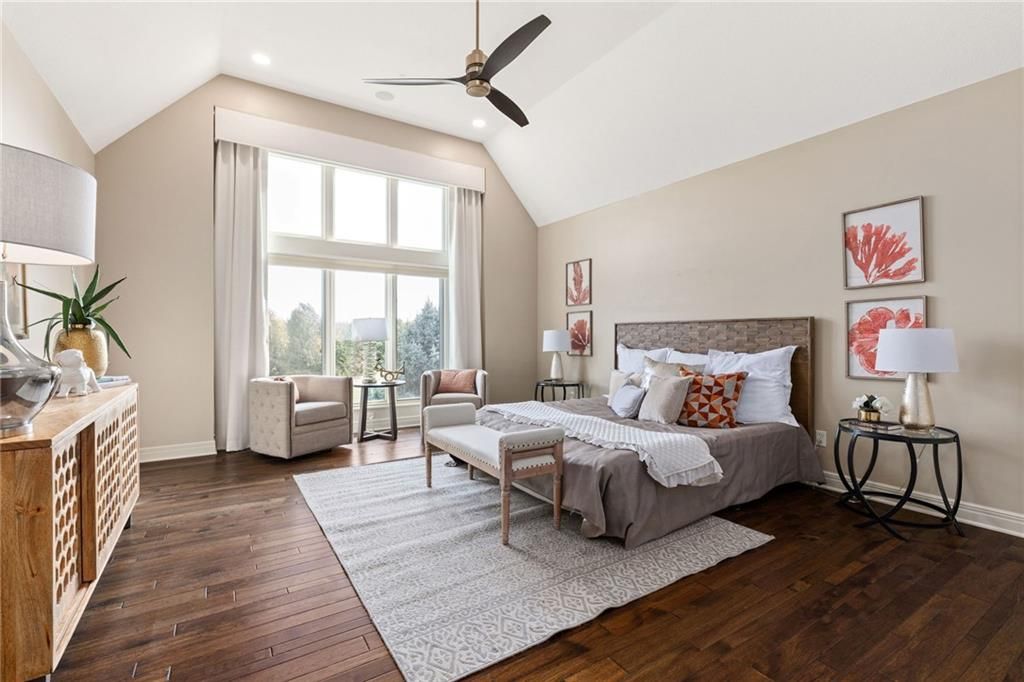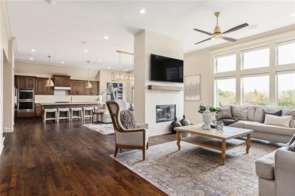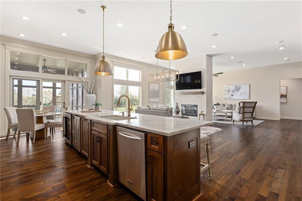 Enjoy the privacy of a gated golf community in this spacious villa overlooking the 4th green of the famed Nicklaus golf course. You'll love the amazing views of the course, fairway and pond from the screened in deck or two patios. The wide open floorplan greets you right inside the door as the front room, great room, dining room and kitchen all flow seamlessly together. Windows all along the back of the home offer a panoramic view of the course and have automatic blinds. A see-through fireplace from great room to dining room creates a warm and elegant ambience, and beautiful new light fixtures in the great room, dining room and kitchen add sophistication. Convenient telescoping TV mounts in Hearth Room and Living Room. The large kitchen is ready to create your culinary masterpieces - featuring a huge island with seating for six, Viking gas range, double ovens, ice maker, wine chiller, and a walk-in pantry custom designed for maximum organization and use of the space. A convenient coffee bar is a fun feature of this great kitchen which is perfect for entertaining or large family gatherings. Enjoy a spacious owner's suite with vaulted ceiling, wood floors a fantastic custom closet and luxurious bathroom. A private office at the front of the home which doubles as a 2nd bedroom on the main level, a half bath, and formal dining room complete the main level. The lower level offers tons of flexible space. Unwind in the comfort of the rec room - ideal for leisure activities with a wet bar and areas for game tables and t.v. viewing. Two spacious bedrooms with ensuite baths, and a laundry room with ample cabinetry complete the lower level. An elevator ensures ease of access to both levels of this magnificent home. Situated on a serene cul-de-sac, this home offers luxury and exclusivity plus a convenient location near the 135th Street corridor and highway access. Lionsgate is a vibrant community with fantastic amenities and social opportunities!