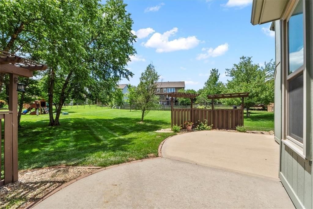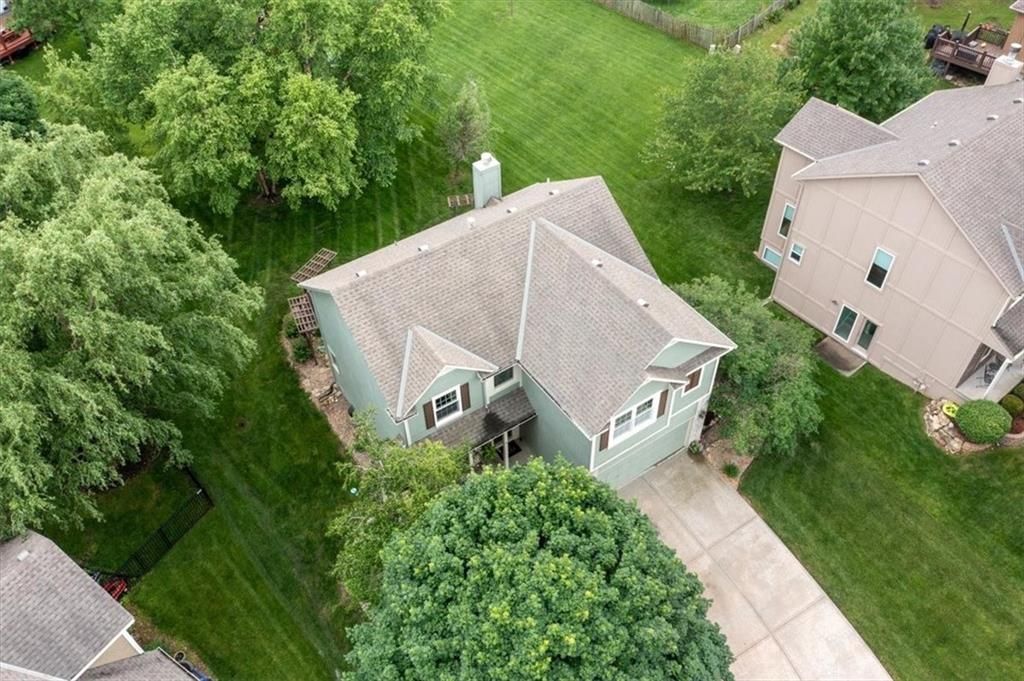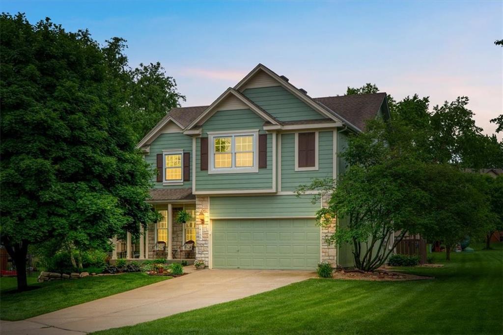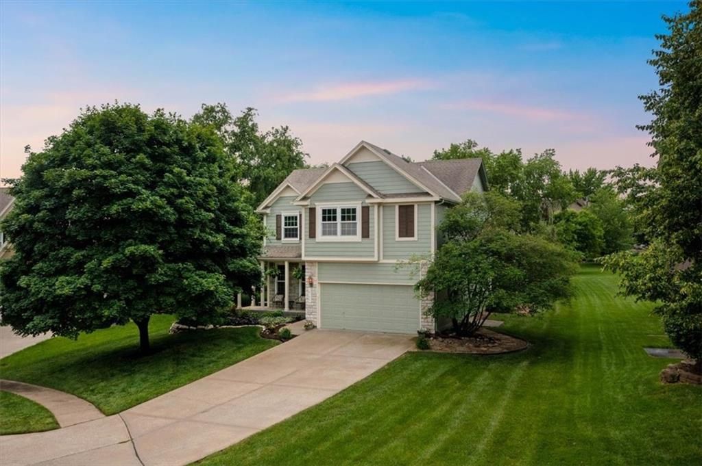 Priced to Sell! Lots of New Updates & $2,000 Towards Closing Costs! This charming 4 Bedroom, 2 Story Home with a Big Backyard is Truly Move-In Ready! Rare opportunity in Parkwood Hills - Blue Valley Schools, Cul-de-Sac Location, Dreamy Front Porch, elementary school located around the corner, as well as trails leading to popular Black Bob Park! Beautiful New granite kitchen countertops with New sink & faucet, New stainless steel range, New 50 gallon hot water heater, New irrigation system panel, New thermal insulated windows in great room that come with a with transferable warranty and Anderson windows throughout other rooms, fresh interior paint, New kitchen and bath plumbing fixtures, freshly cleaned air ducts and dryer vent, new sod in the front yard. This home comes fully equipped with essentials, including a Refrigerator, Washer and Dryer, making it easy to settle in and start enjoying your new space right away! The inviting front porch sets the tone for the perfect morning coffee spot, cozy evening sunsets, and the opportunity to enjoy a touch of nature being surrounded by thoughtful landscaping. The spacious interior features a large primary master suite with vaulted ceilings and walk-in closet with built-ins, laundry on same level as bedrooms, and light and bright kitchen and great room. The large backyard and fantastic patio provide plenty of space for outdoor gatherings, gardening, or simply soaking in the peaceful surroundings.