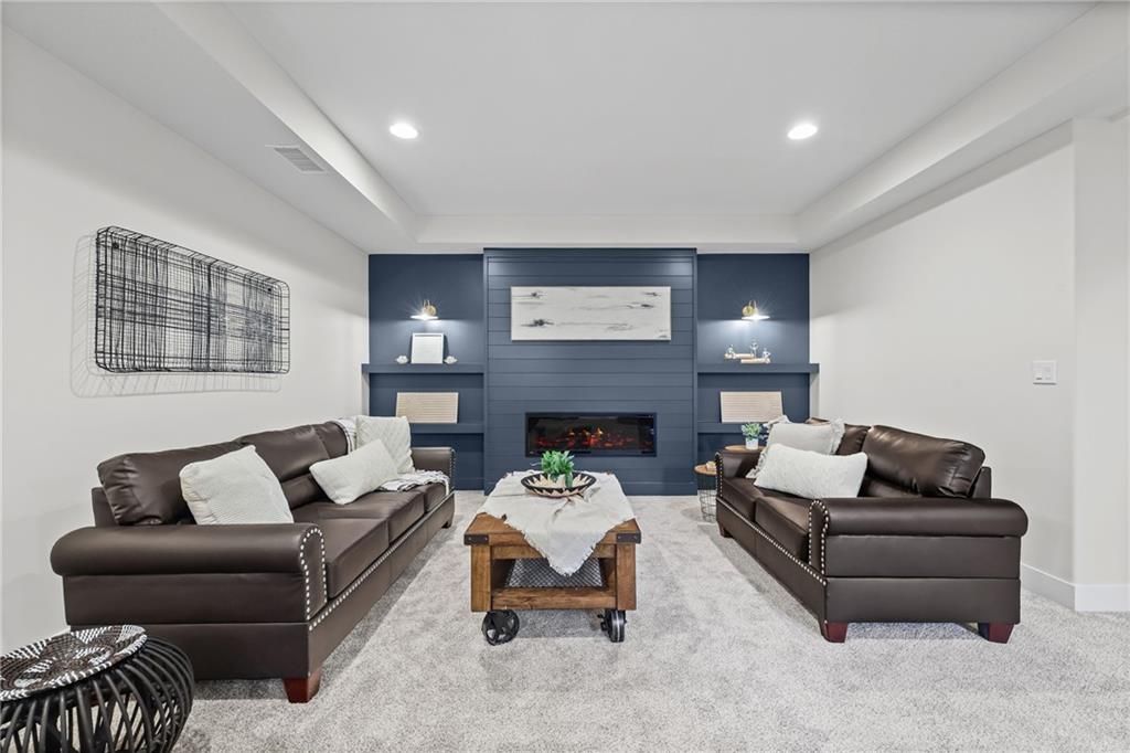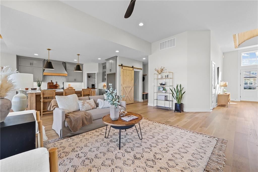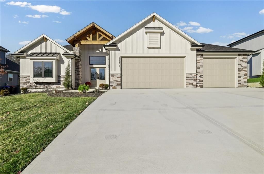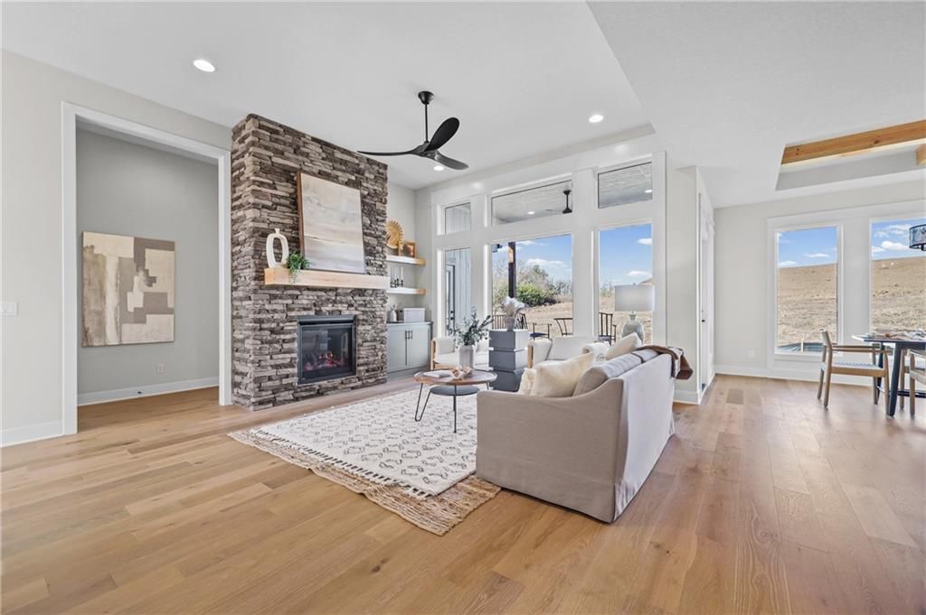 Move-in ready, beautifully designed & built for long-term livability! This exceptional home offers high-end craftsmanship, thoughtful accessibility features & beautiful designer finishes throughout. Located in the highly rated Lee's Summit School District, it's just a short walk to the neighborhood elementary & only minutes from LSW High School! A rare find in today's market, this home offers true ZERO ENTRY access, providing step-free transitions inside for enhanced ADA accessibility, long-term comfort & effortless first floor living. An ENERGY STAR 3.1 rating delivers superior insulation, energy efficient windows & HVAC system=improved indoor comfort & lower utility bills! Outside: beautiful board & batten siding w/stone accents, cedar trusses & covered front entry. Inside: classic-modern design makes a striking first impression w/soaring ceilings, rich engineered wood floors & an open, airy layout. The foyer features a stunning wood-accent barrel ceiling & custom wall trim that sets an elevated tone. An impressive floor-to-ceiling stone fireplace graces the family room & a wall of windows drench the main level in natural light, contributing to the seamless flow into the kitchen & dining area. The designer kitchen is a true showstopper, featuring an oversized quartz island & premium custom cabinets that perfectly complement the wood accent range hood. A gas cooktop & stainless appliances=chef's delight, w/a walk-in pantry providing super storage space for grocery staples. The primary suite is a true retreat, featuring a spacious bedroom w/tray ceiling & large windows plus a spa-like bath w/dual vanities & an oversized walk-in tile shower. A large secondary bedroom, full bathroom, a pocket office & spacious laundry room round out the main floor. Downstairs, you'll find a large WOW FACTOR Rec Room w/floor to ceiling fireplace, a gaming area, wet bar, 2 additional spacious bedrooms serviced by a 3rd full bathroom & a 1/2 bath (with urinal!) - perfect for poker night!