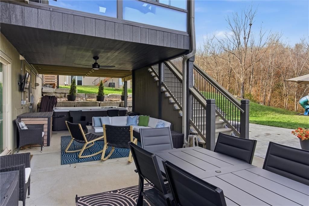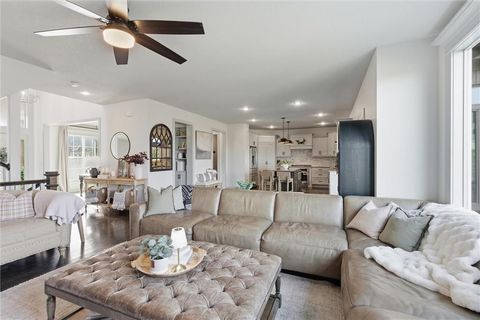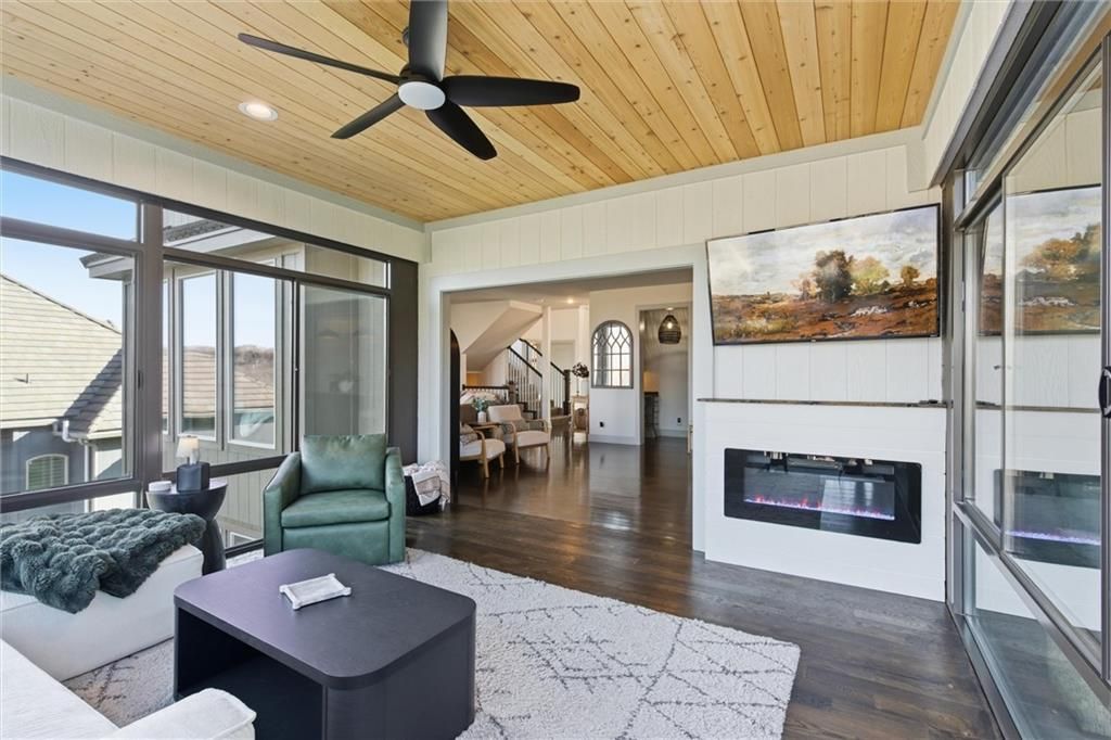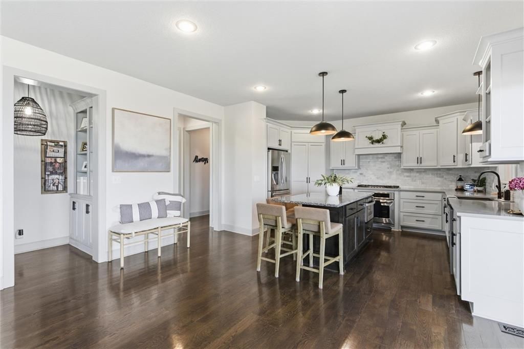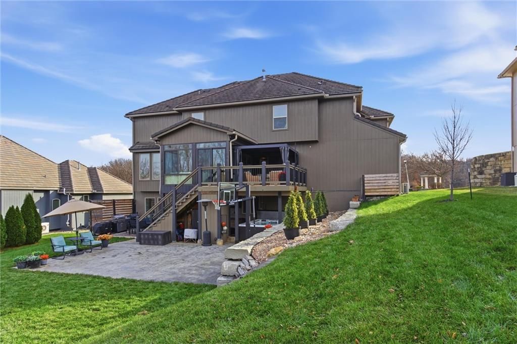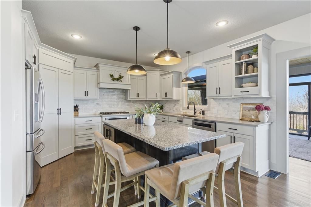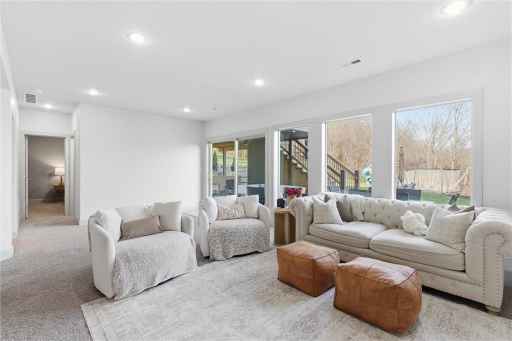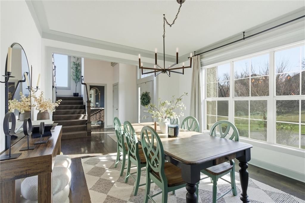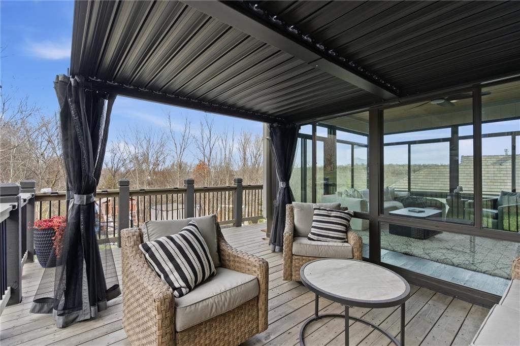 This stunning luxury home is located in one of Lenexa's most desirable communities, Woodland Reserve on over half an acre. This six bedroom, two story home features an open, light filled layout with a gourmet kitchen and high end finishes, dining room with custom cabinets, half bath, spacious living room, and an absolutely amazing sun room on the main floor. Perfect for coffee in the mornings, working from home, or entertaining. The large primary suite offers a spa-like bath, two generous walk in closets, and an office nook. Laundry is conveniently located on this level. There are four secondary bedrooms on the second level, all with large closets. The walk out basement offers a large finished living space, a dedicated office, a fun kids play area under the stairs, a 6th bedroom with an egress window and walk in closet, a full bathroom, plenty of storage space and a dedicated storm shelter. Walk out to a beautiful stamped concrete patio, a basketball court, playsets, in ground trampoline and a half acre treed lot to explore. And finally, do not miss the garage! This four car tandom garage has plenty of extra space for a workshop, workout space, possible kitchen expansion, or even a fifth car. The garage is heated and cooled with plenty of built in storage, electrical plug in for an electric car, and is 42 feet deep in the double garage door space. This home is wonderfully located close to the neighborhood swimming pool, trails and stocked fishing pond. Easy highway access, and short distance to Lenexa City Center and amazing parks make this a must see home!