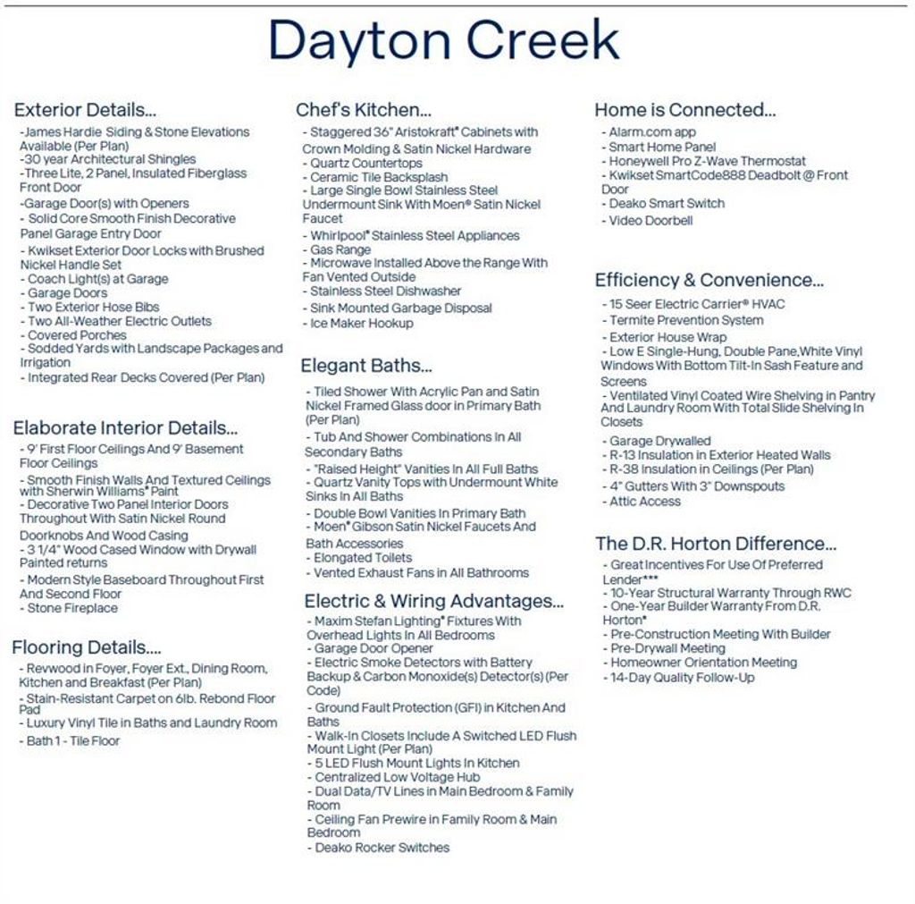 Experience modern elegance in Dayton Creek with this D.R. Horton home. This home is equipped with a 3-car garage, James Hardie siding with stone accents, 9' ceilings, and RevWood flooring throughout the main living areas. The chef's kitchen features quartz countertops, tile backsplash, and Whirlpool stainless steel appliances. Retreat to a luxurious primary suite with tiled shower and double quartz vanity. Cutting-edge Smart Home technology makes daily living effortless. Energy-efficient systems, garage door openers and a covered porch with landscaped yard make this home the perfect blend of comfort, technology, and style. With D.R. Horton, you get a home warranty, the most recent building codes, more energy efficiency and lower maintenance. Community amenities include playground, fitness center, pool, splash pad, pickleball court, basketball court, putting green, and walking trails. Don't forget to ask about current incentives! Photos, renderings, and 3D Walkthrough's maybe of a different home but on the same floor plan to show finish quality only.** Don't miss your chance - schedule a tour today and see why this home is the perfect mix of luxury and convenience!