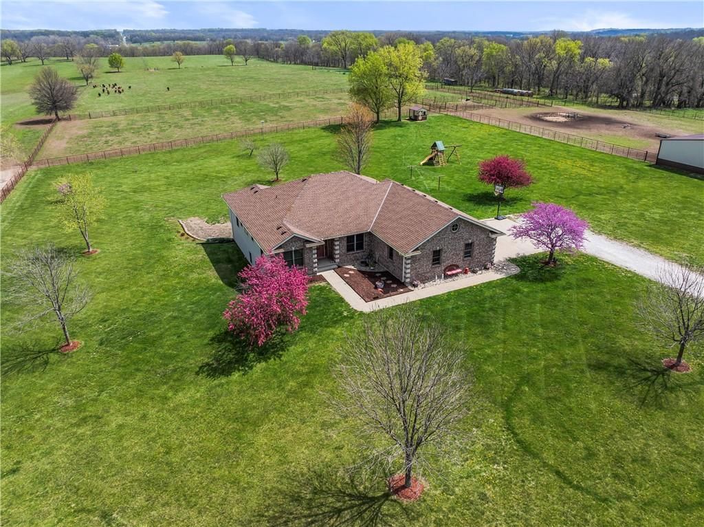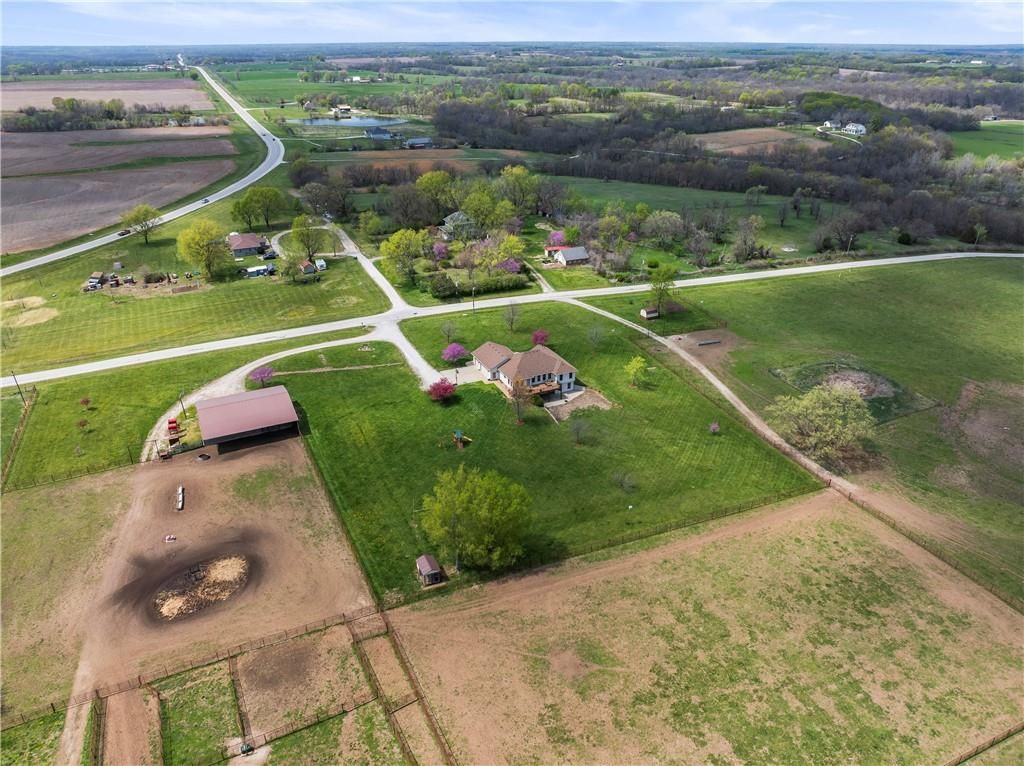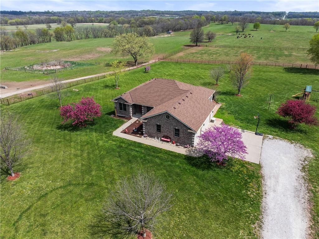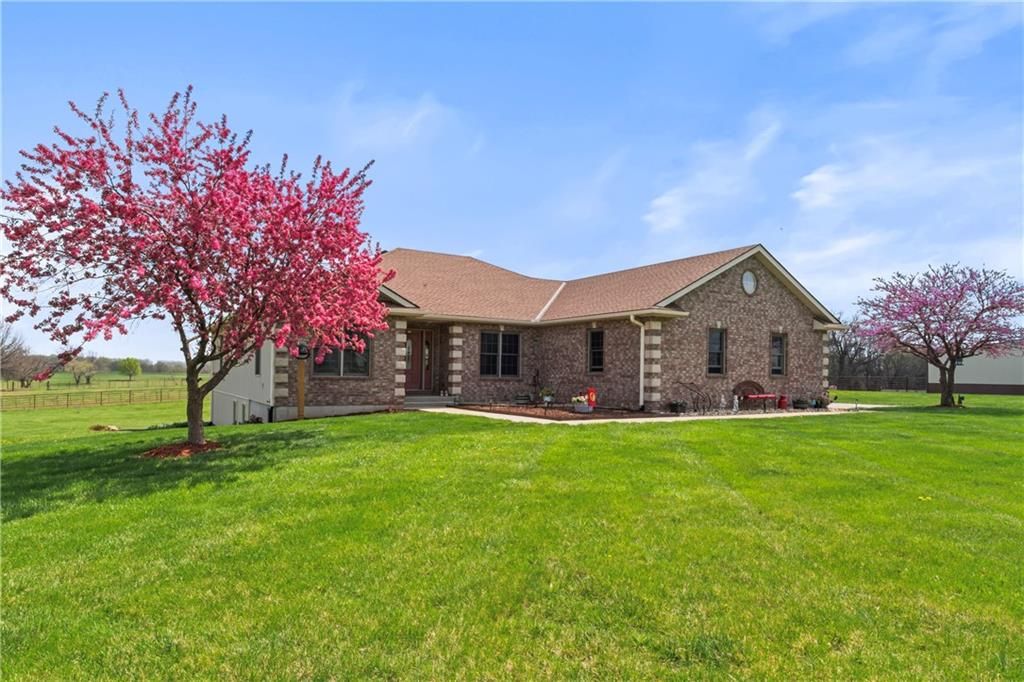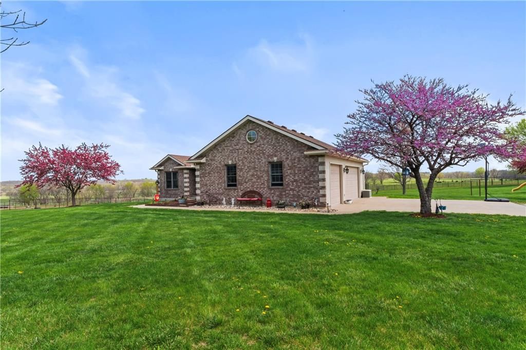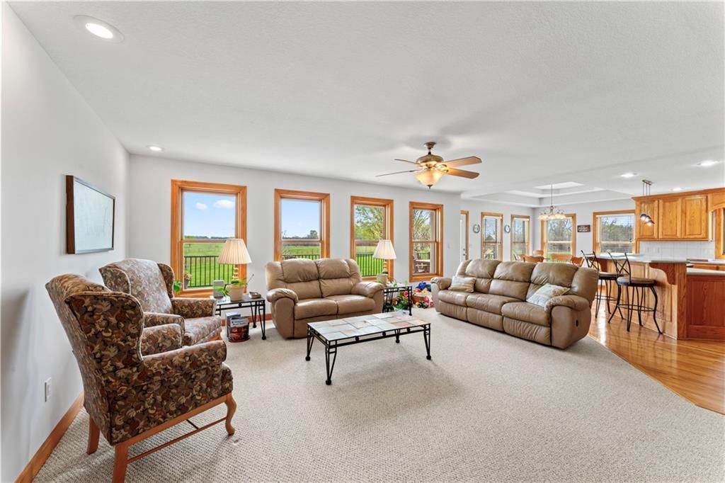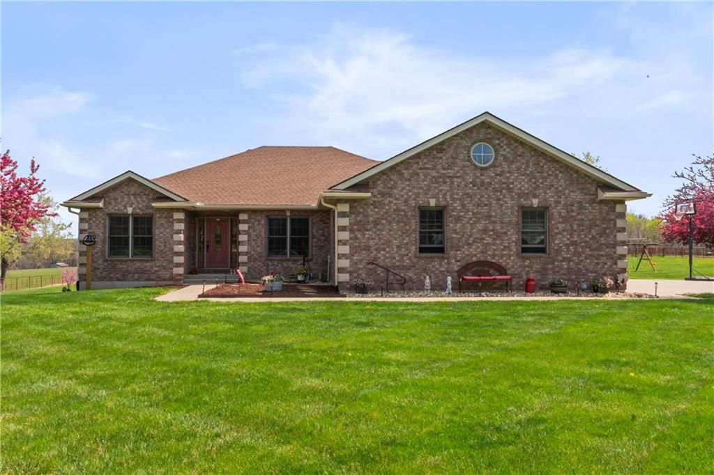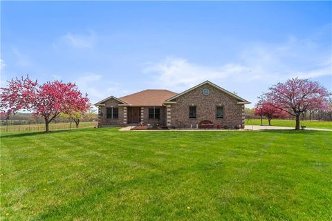 Welcome to this stunning one-owner estate, where quality craftsmanship meets peaceful country living. Built in 2006 with durability and comfort in mind, this home features Anderson windows, solid wood doors, 6 exterior walls, and coordinated countertops. An open-concept layout connects the spacious living area to a kitchen complete with a large island and all appliances included. Ceiling fans throughout the home provide year-round comfort, and two laundry rooms - one on each level - add everyday convenience. The full finished basement offers a wet bar and kitchenette ideal for entertaining or multigenerational living. Step outside to enjoy a 10x35 composite deck with a wrought iron railing and sweeping views of the countryside. A 3-car oversized garage offers ample storage. Equestrian or livestock enthusiasts will appreciate the pipe corral with pens, four automatic waterers, perimeter and cross fencing (mostly updated since 2006), and a 40x60 barn with a 14' lean-to, 16x12 overhead door, RV outlet, commercial opener, keypad entry, 100 amp electric, 220 outlets, and water access. The land features two productive hay fields (18 and 24 acres), a serene pond, and Grand River frontage along part of the east boundary. There are so many recreational and hunting opportunities available, so whether you're seeking a working property or a private retreat with upscale finishes and room to roam, this one-of-a-kind estate delivers on every level.