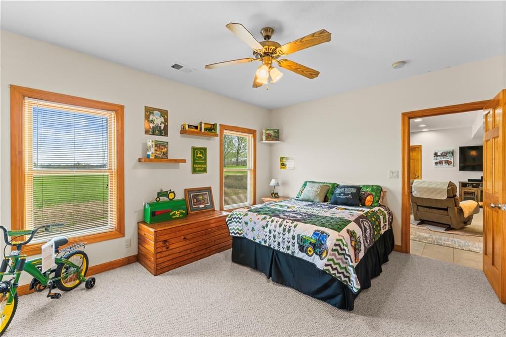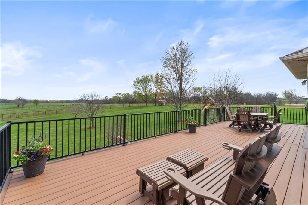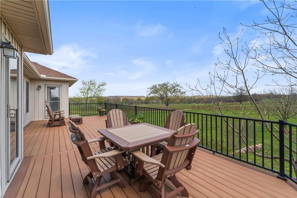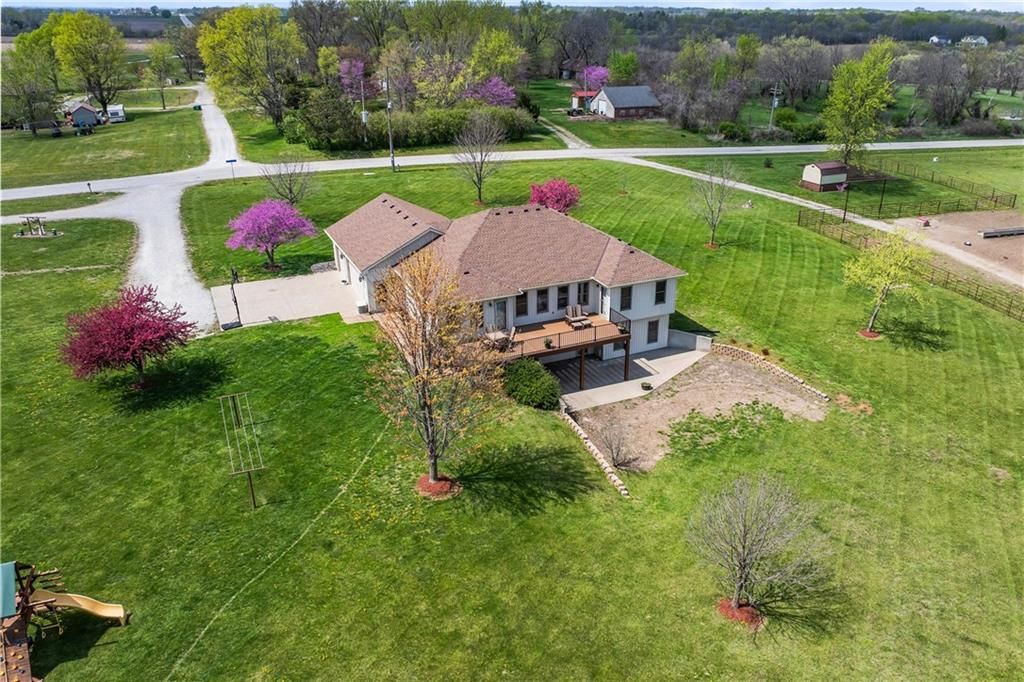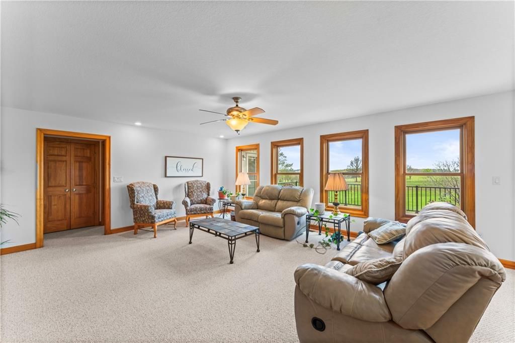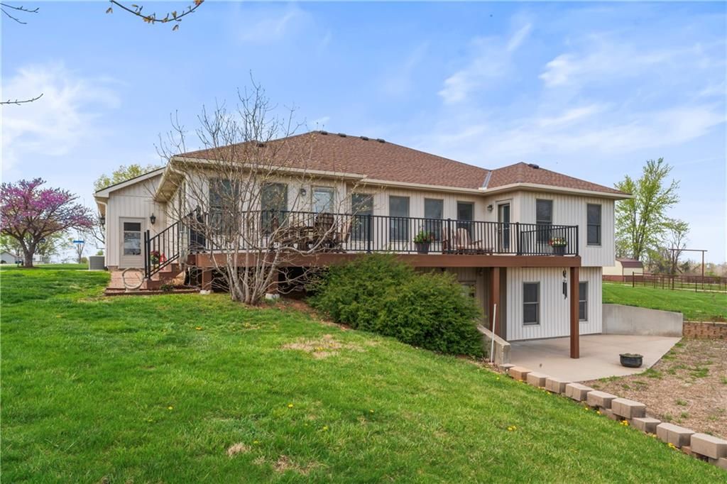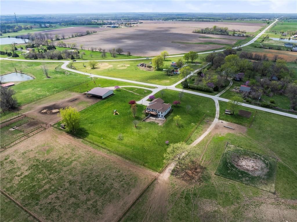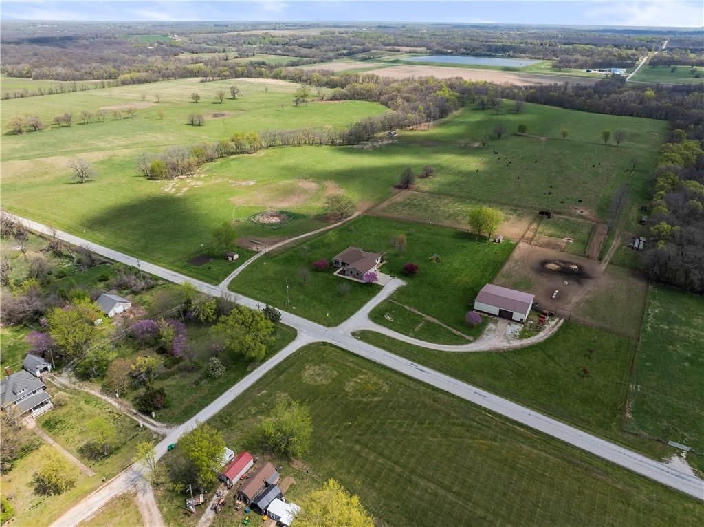 Welcome to this stunning one-owner estate, where quality craftsmanship meets peaceful country living. Built in 2006 with durability and comfort in mind, this home features Anderson windows, solid wood doors, 6 exterior walls, and coordinated countertops. An open-concept layout connects the spacious living area to a kitchen complete with a large island and all appliances included. Ceiling fans throughout the home provide year-round comfort, and two laundry rooms - one on each level - add everyday convenience. The full finished basement offers a wet bar and kitchenette ideal for entertaining or multigenerational living. Step outside to enjoy a 10x35 composite deck with a wrought iron railing and sweeping views of the countryside. A 3-car oversized garage offers ample storage. Equestrian or livestock enthusiasts will appreciate the pipe corral with pens, four automatic waterers, perimeter and cross fencing (mostly updated since 2006), and a 40x60 barn with a 14' lean-to, 16x12 overhead door, RV outlet, commercial opener, keypad entry, 100 amp electric, 220 outlets, and water access. The land features two productive hay fields (18 and 24 acres), a serene pond, and Grand River frontage along part of the east boundary. There are so many recreational and hunting opportunities available, so whether you're seeking a working property or a private retreat with upscale finishes and room to roam, this one-of-a-kind estate delivers on every level.