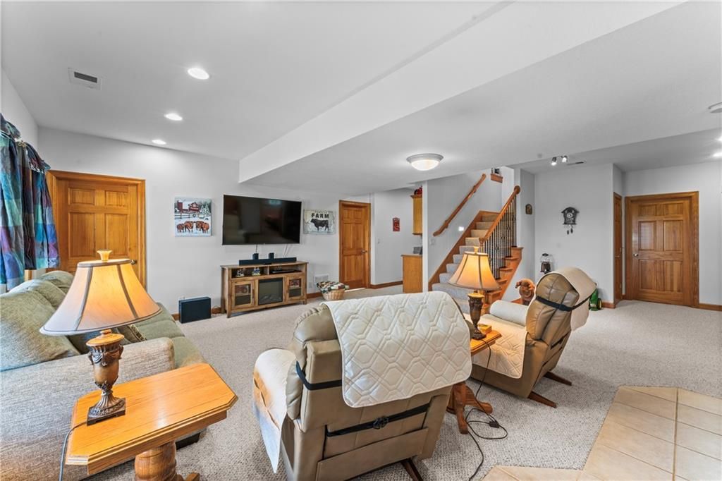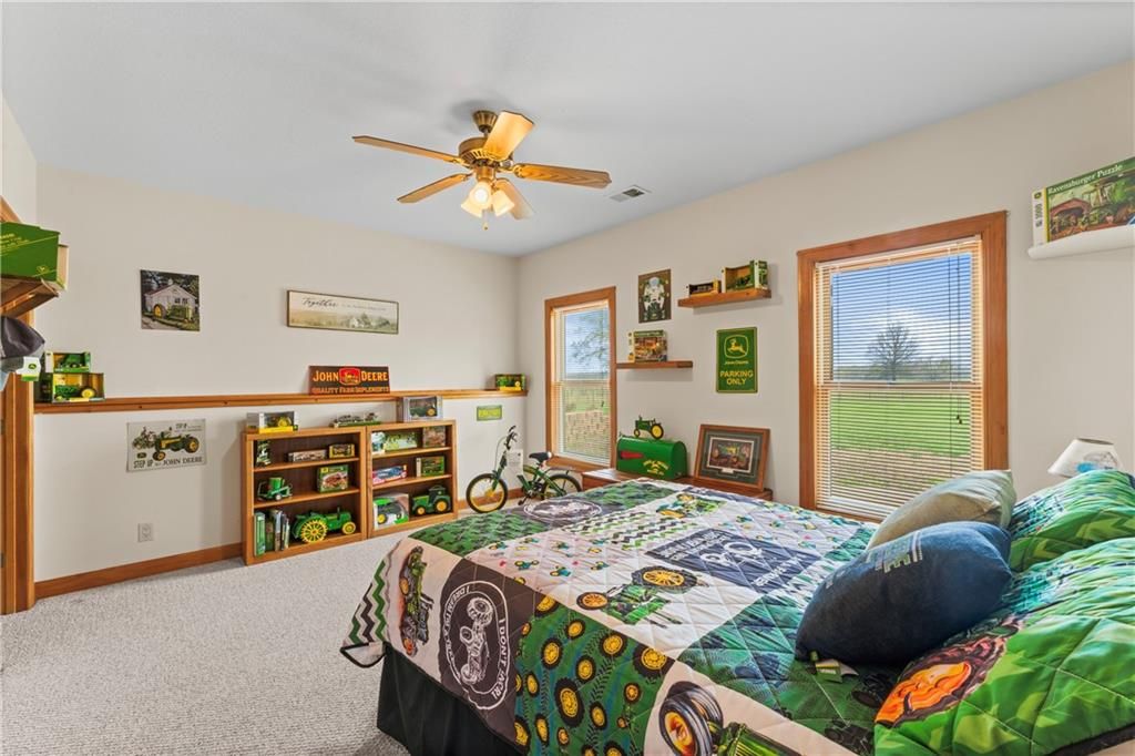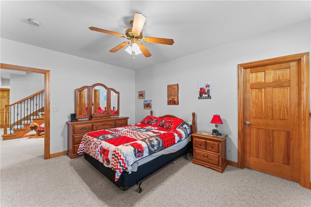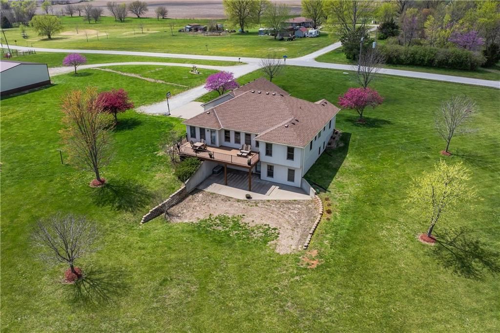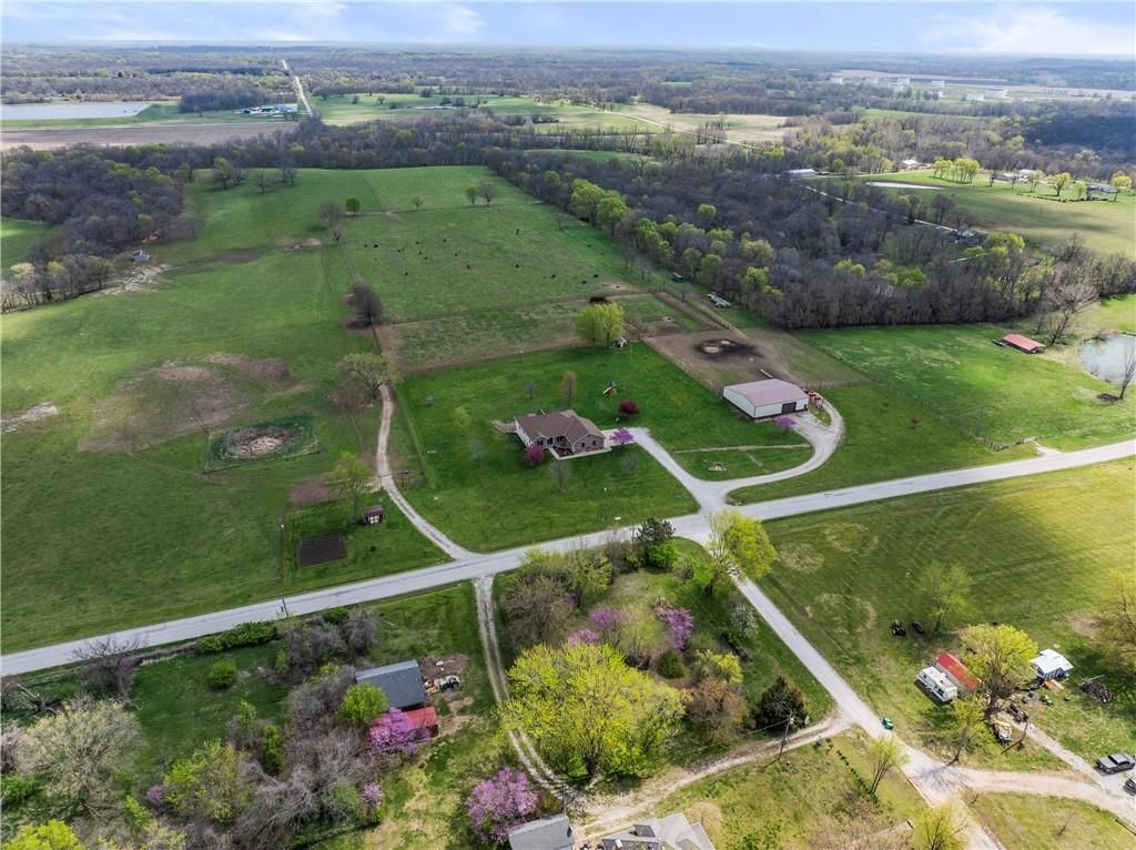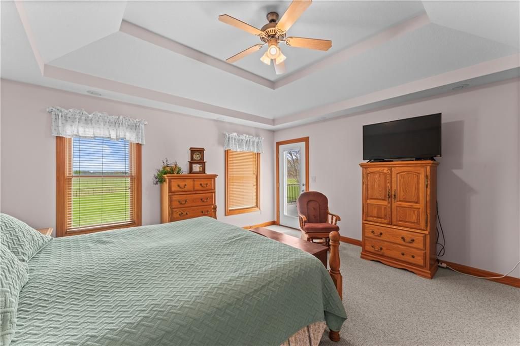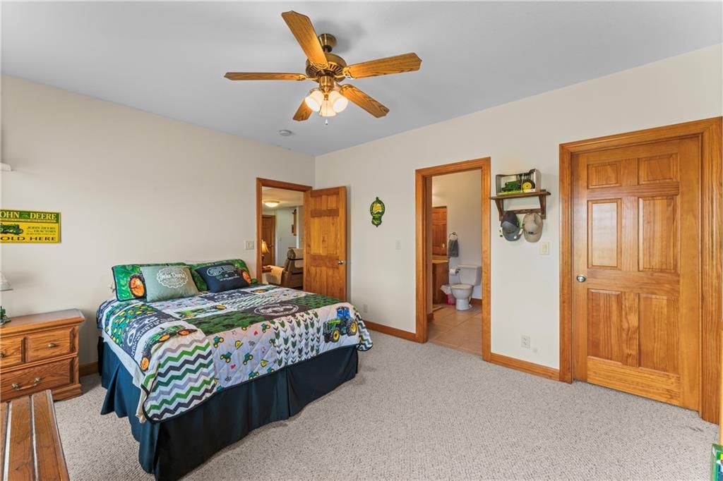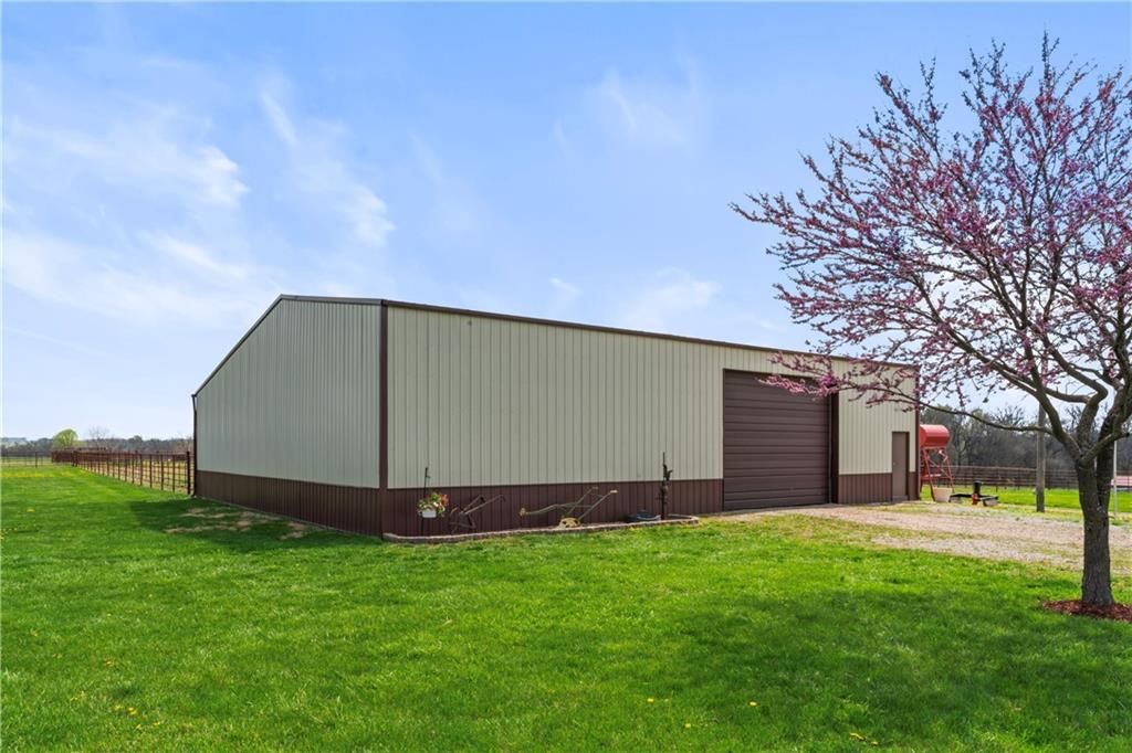 Welcome to this stunning one-owner estate, where quality craftsmanship meets peaceful country living. Built in 2006 with durability and comfort in mind, this home features Anderson windows, solid wood doors, 6 exterior walls, and coordinated countertops. An open-concept layout connects the spacious living area to a kitchen complete with a large island and all appliances included. Ceiling fans throughout the home provide year-round comfort, and two laundry rooms - one on each level - add everyday convenience. The full finished basement offers a wet bar and kitchenette ideal for entertaining or multigenerational living. Step outside to enjoy a 10x35 composite deck with a wrought iron railing and sweeping views of the countryside. A 3-car oversized garage offers ample storage. Equestrian or livestock enthusiasts will appreciate the pipe corral with pens, four automatic waterers, perimeter and cross fencing (mostly updated since 2006), and a 40x60 barn with a 14' lean-to, 16x12 overhead door, RV outlet, commercial opener, keypad entry, 100 amp electric, 220 outlets, and water access. The land features two productive hay fields (18 and 24 acres), a serene pond, and Grand River frontage along part of the east boundary. There are so many recreational and hunting opportunities available, so whether you're seeking a working property or a private retreat with upscale finishes and room to roam, this one-of-a-kind estate delivers on every level.