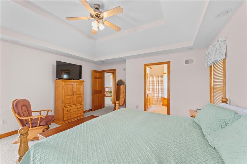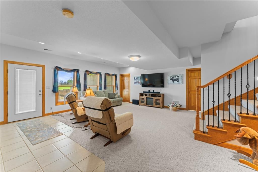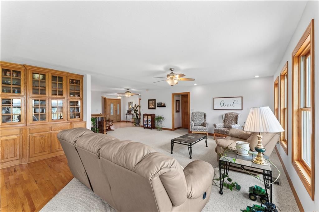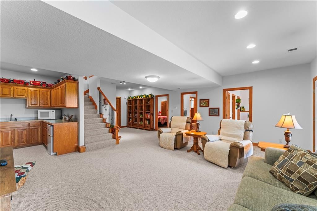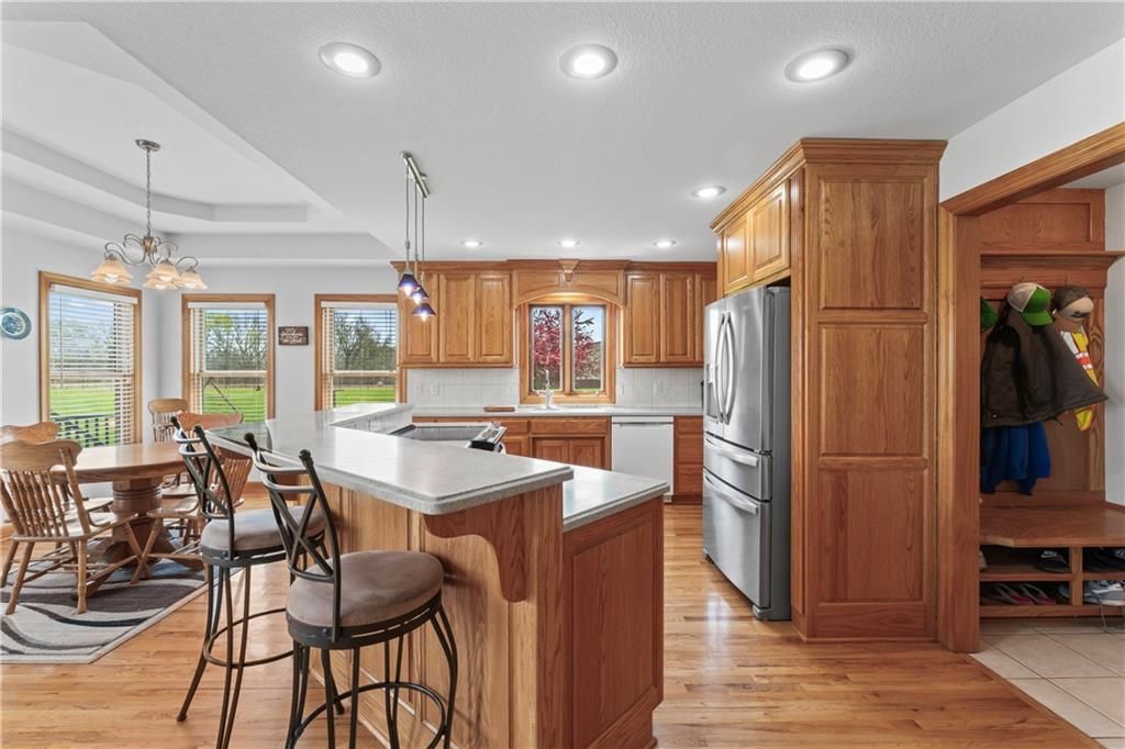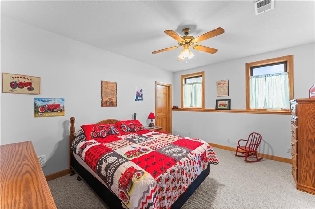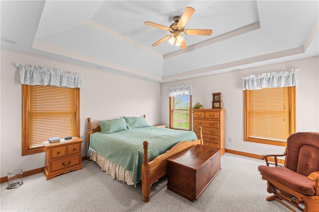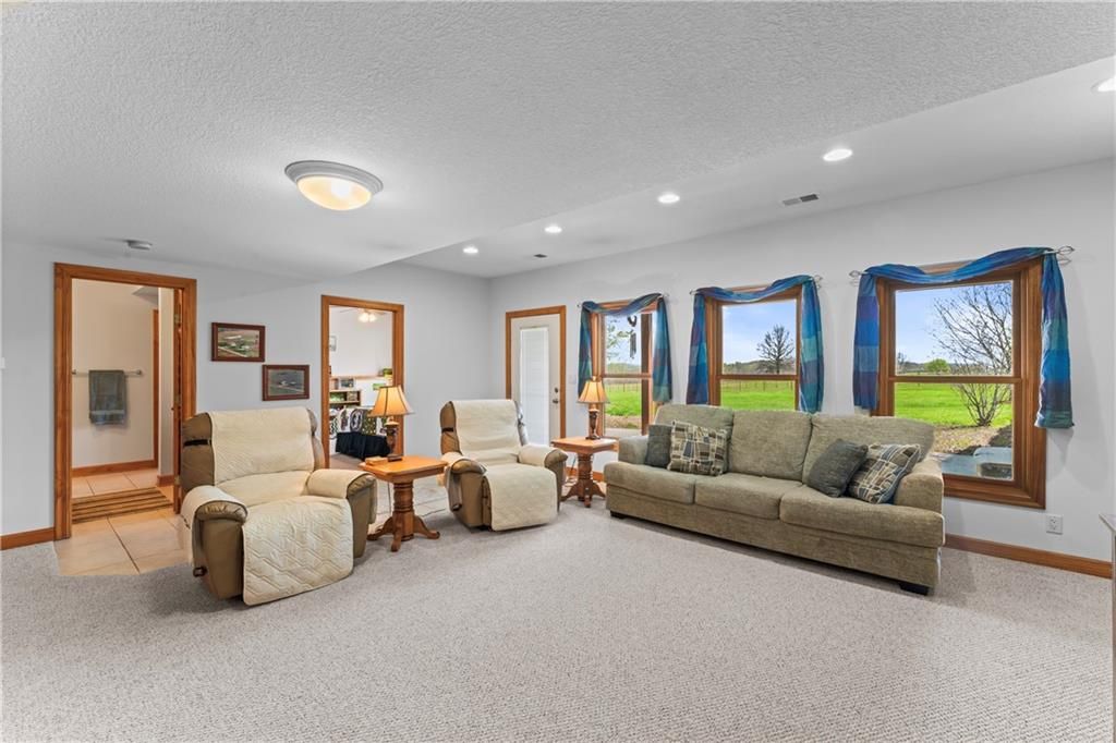 Welcome to this stunning one-owner estate, where quality craftsmanship meets peaceful country living. Built in 2006 with durability and comfort in mind, this home features Anderson windows, solid wood doors, 6 exterior walls, and coordinated countertops. An open-concept layout connects the spacious living area to a kitchen complete with a large island and all appliances included. Ceiling fans throughout the home provide year-round comfort, and two laundry rooms - one on each level - add everyday convenience. The full finished basement offers a wet bar and kitchenette ideal for entertaining or multigenerational living. Step outside to enjoy a 10x35 composite deck with a wrought iron railing and sweeping views of the countryside. A 3-car oversized garage offers ample storage. Equestrian or livestock enthusiasts will appreciate the pipe corral with pens, four automatic waterers, perimeter and cross fencing (mostly updated since 2006), and a 40x60 barn with a 14' lean-to, 16x12 overhead door, RV outlet, commercial opener, keypad entry, 100 amp electric, 220 outlets, and water access. The land features two productive hay fields (18 and 24 acres), a serene pond, and Grand River frontage along part of the east boundary. There are so many recreational and hunting opportunities available, so whether you're seeking a working property or a private retreat with upscale finishes and room to roam, this one-of-a-kind estate delivers on every level.