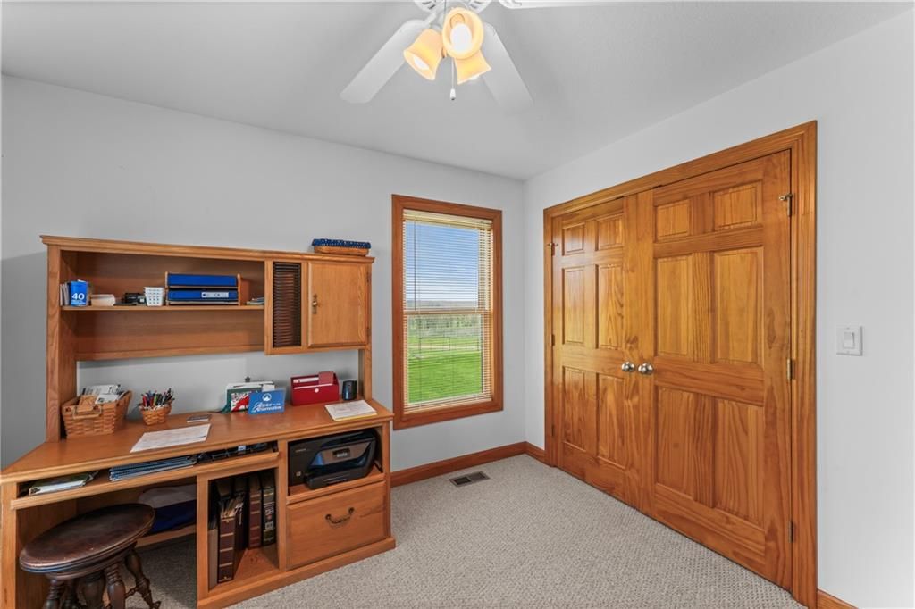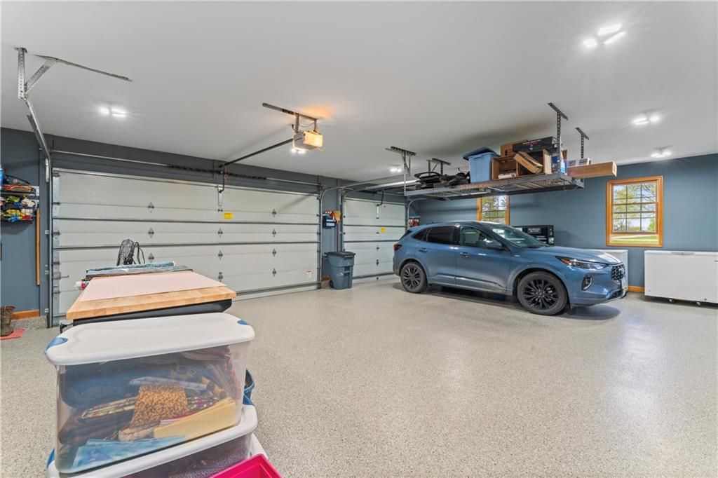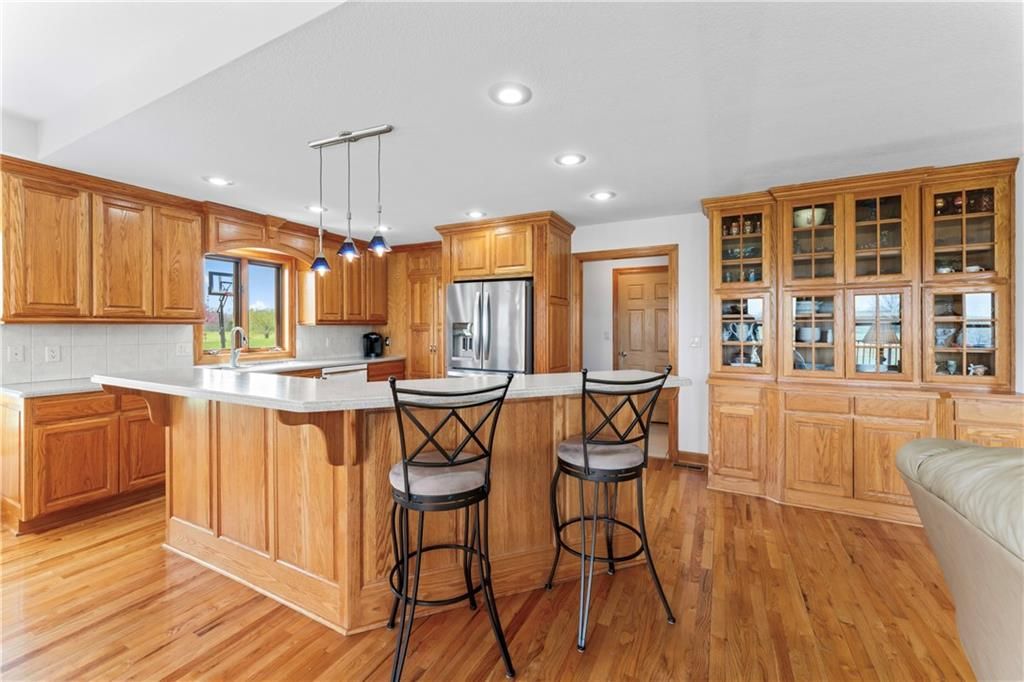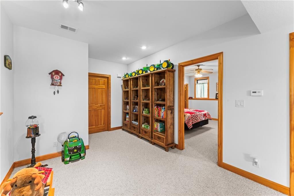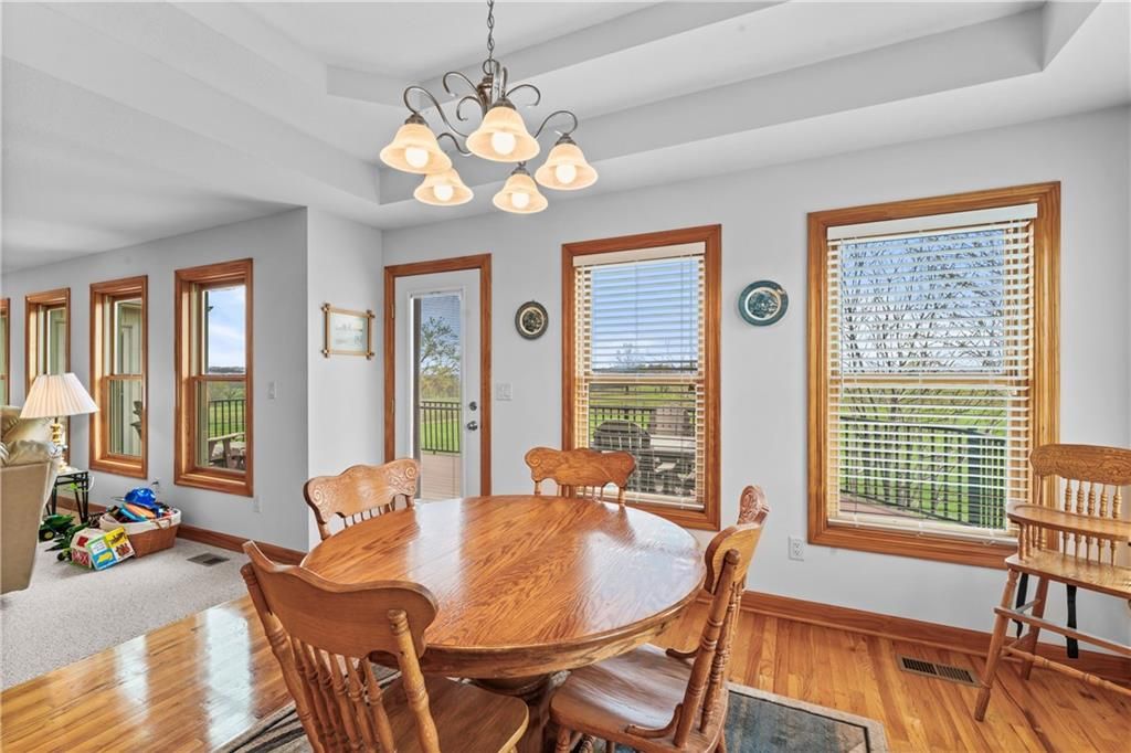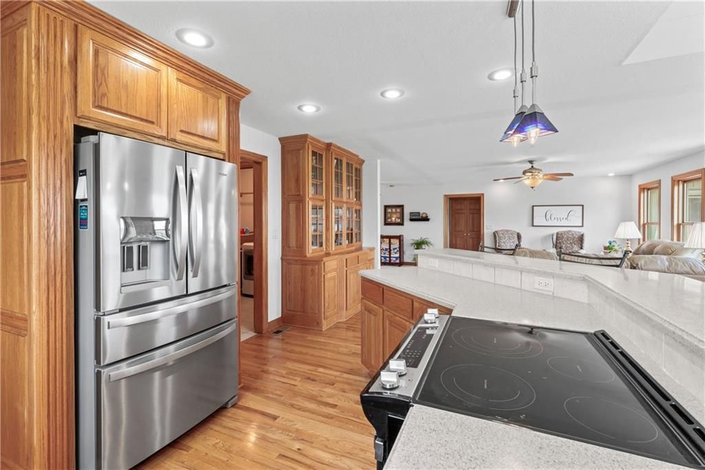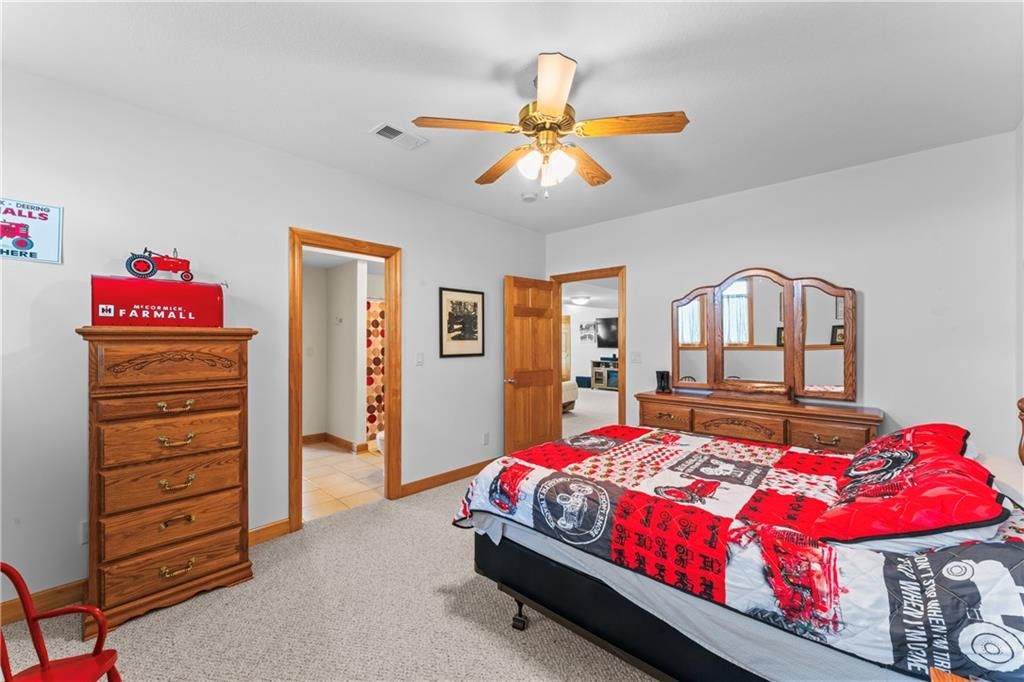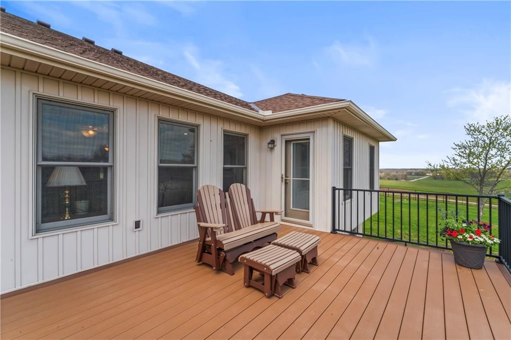Welcome to this stunning one-owner estate, where quality craftsmanship meets peaceful country living. Built in 2006 with durability and comfort in mind, this home features Anderson windows, solid wood doors, 6 exterior walls, and coordinated countertops. An open-concept layout connects the spacious living area to a kitchen complete with a large island and all appliances included. Ceiling fans throughout the home provide year-round comfort, and two laundry rooms - one on each level - add everyday convenience. The full finished basement offers a wet bar and kitchenette ideal for entertaining or multigenerational living. Step outside to enjoy a 10x35 composite deck with a wrought iron railing and sweeping views of the countryside. A 3-car oversized garage offers ample storage. Equestrian or livestock enthusiasts will appreciate the pipe corral with pens, four automatic waterers, perimeter and cross fencing (mostly updated since 2006), and a 40x60 barn with a 14' lean-to, 16x12 overhead door, RV outlet, commercial opener, keypad entry, 100 amp electric, 220 outlets, and water access. The land features two productive hay fields (18 and 24 acres), a serene pond, and Grand River frontage along part of the east boundary. There are so many recreational and hunting opportunities available, so whether you're seeking a working property or a private retreat with upscale finishes and room to roam, this one-of-a-kind estate delivers on every level.
