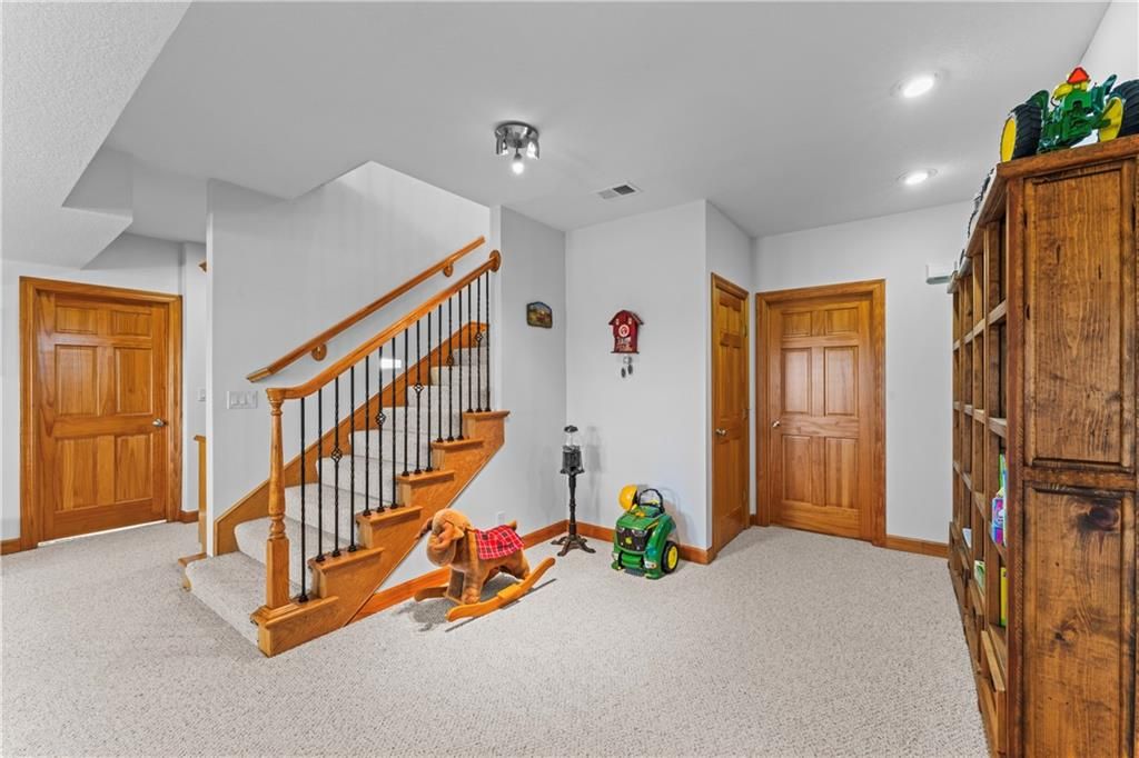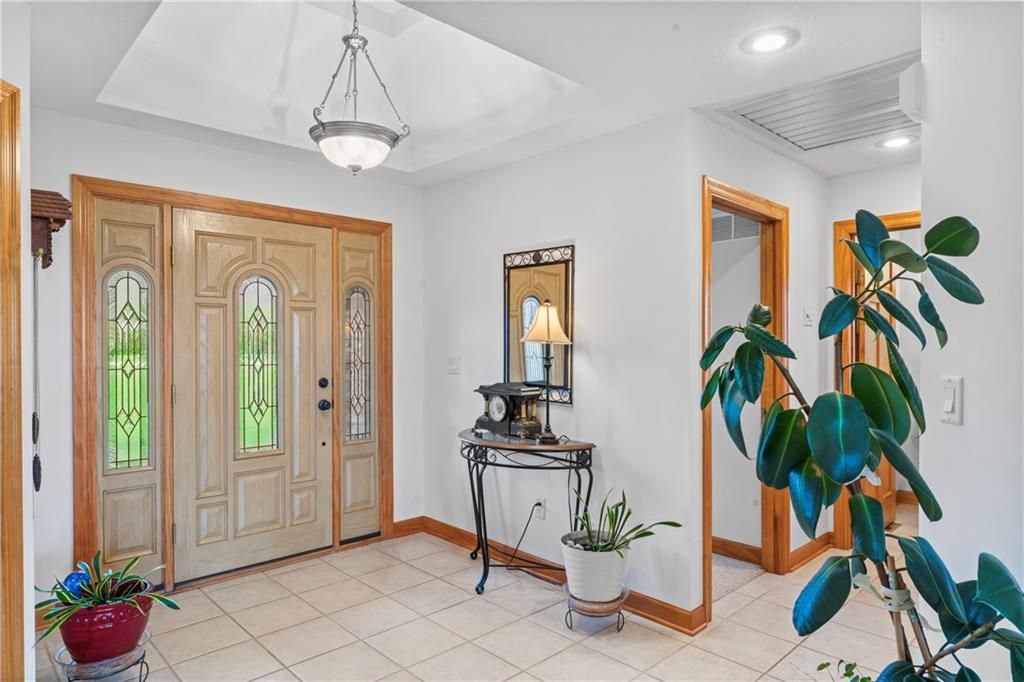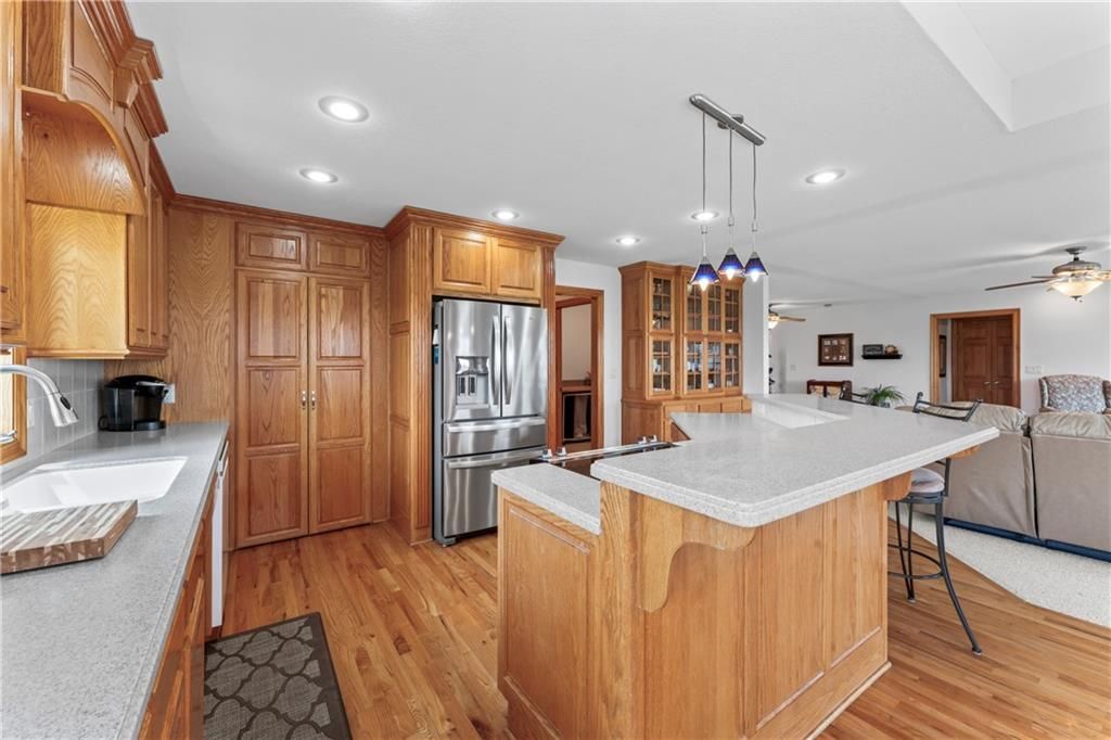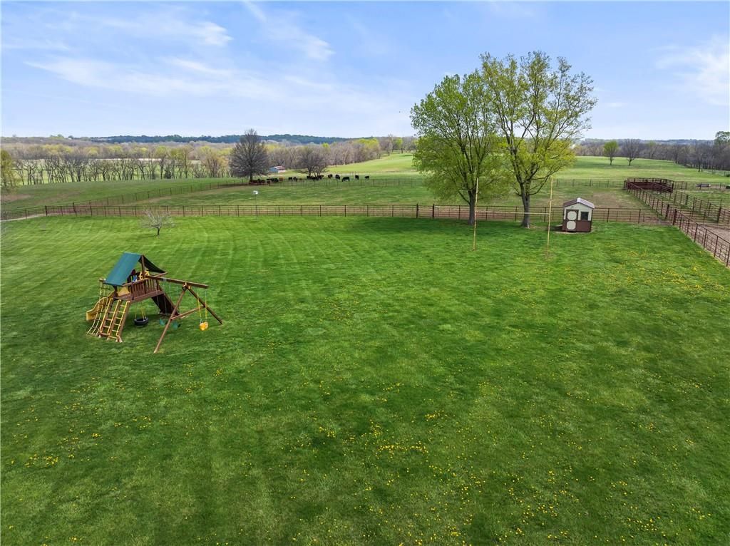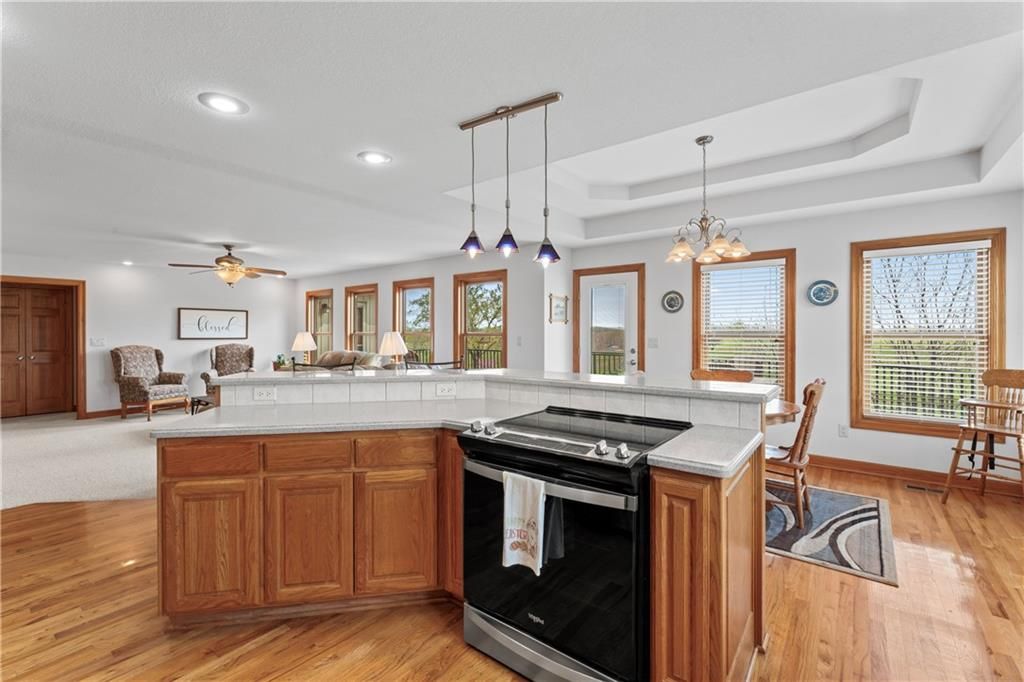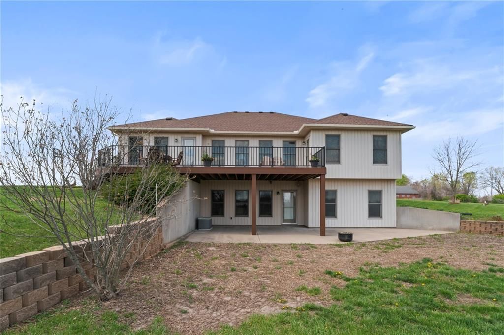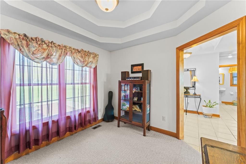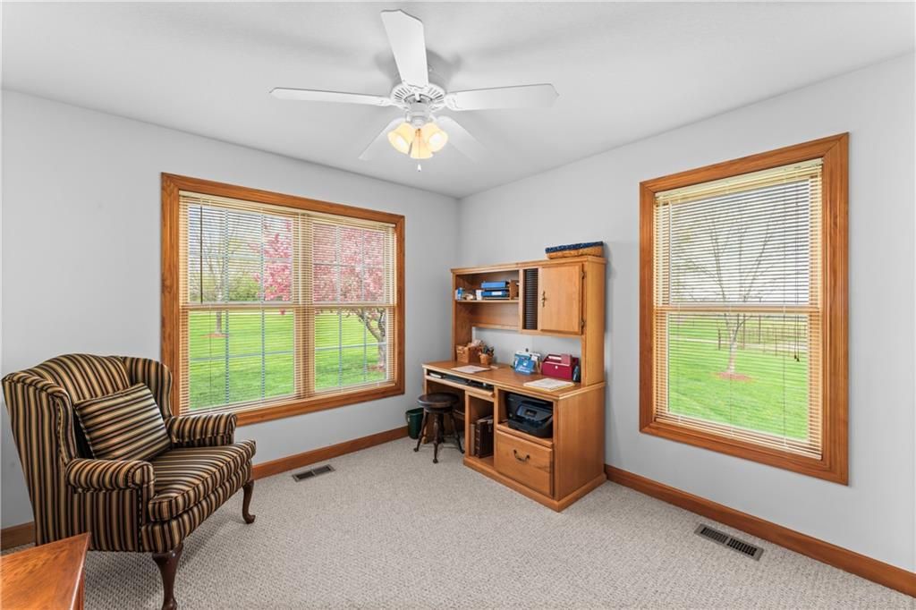 Welcome to this stunning one-owner estate, where quality craftsmanship meets peaceful country living. Built in 2006 with durability and comfort in mind, this home features Anderson windows, solid wood doors, 6 exterior walls, and coordinated countertops. An open-concept layout connects the spacious living area to a kitchen complete with a large island and all appliances included. Ceiling fans throughout the home provide year-round comfort, and two laundry rooms - one on each level - add everyday convenience. The full finished basement offers a wet bar and kitchenette ideal for entertaining or multigenerational living. Step outside to enjoy a 10x35 composite deck with a wrought iron railing and sweeping views of the countryside. A 3-car oversized garage offers ample storage. Equestrian or livestock enthusiasts will appreciate the pipe corral with pens, four automatic waterers, perimeter and cross fencing (mostly updated since 2006), and a 40x60 barn with a 14' lean-to, 16x12 overhead door, RV outlet, commercial opener, keypad entry, 100 amp electric, 220 outlets, and water access. The land features two productive hay fields (18 and 24 acres), a serene pond, and Grand River frontage along part of the east boundary. There are so many recreational and hunting opportunities available, so whether you're seeking a working property or a private retreat with upscale finishes and room to roam, this one-of-a-kind estate delivers on every level.