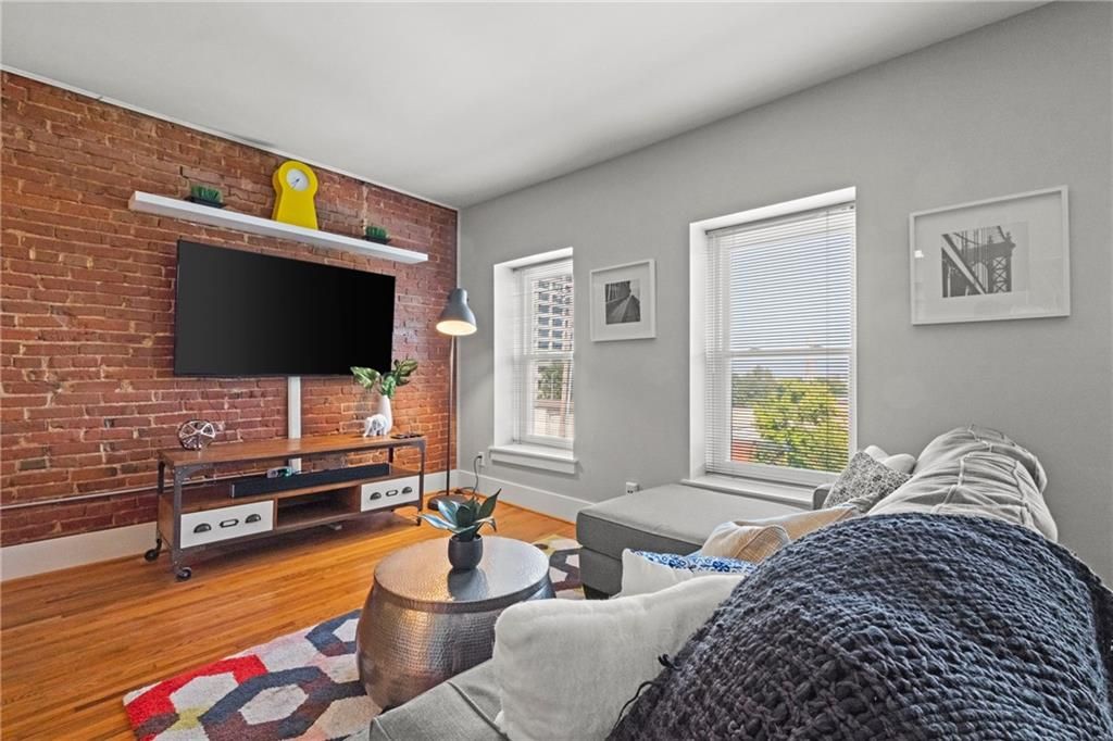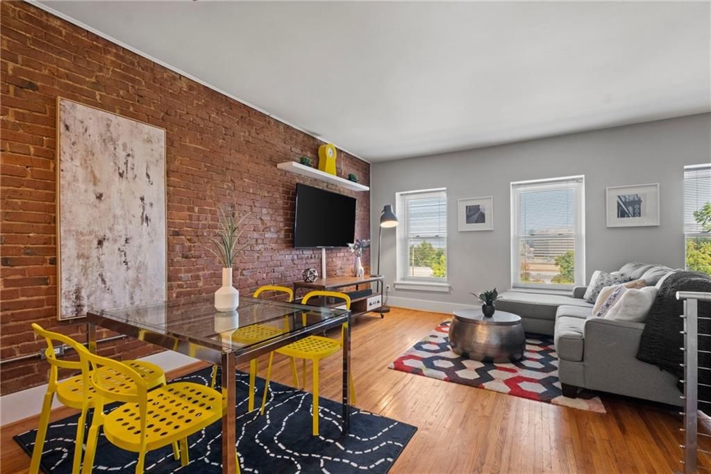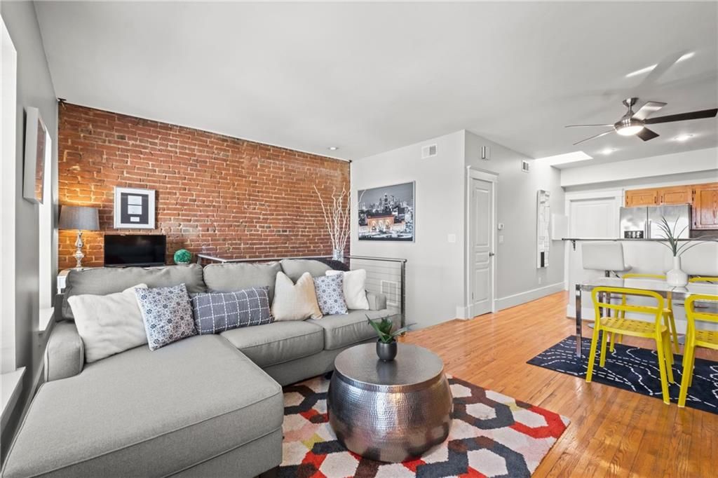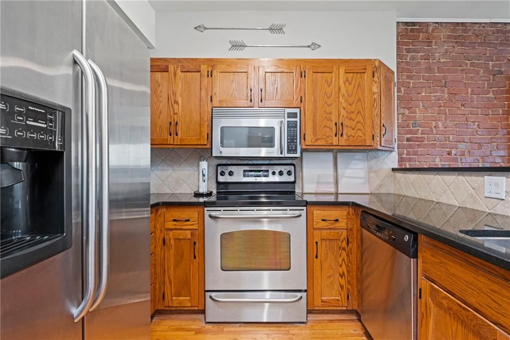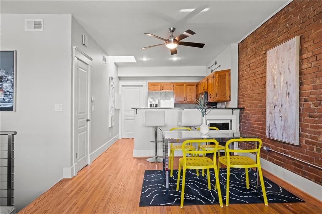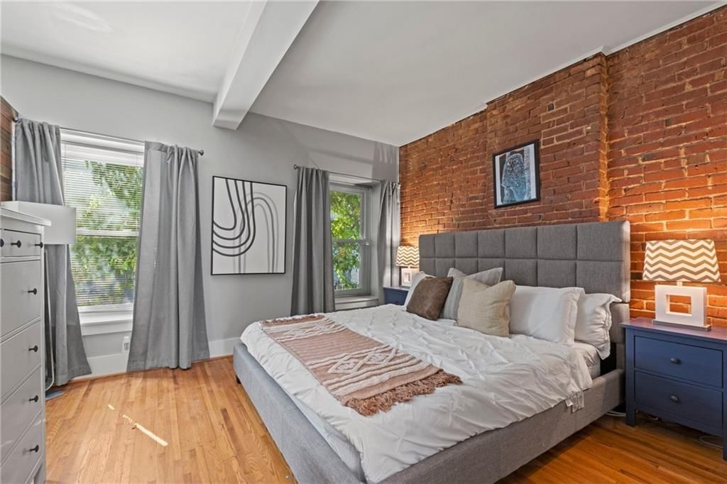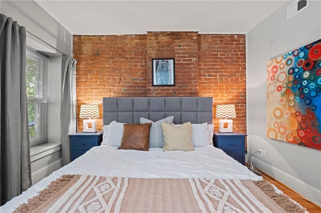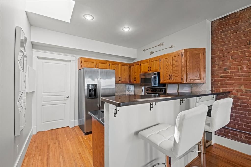 Don't miss out on this exceptional chance to own a one-of-a-kind 2-story loft style condo in the historic Union Hill District with stunning views of Kansas City's downtown skyline! Beautiful exposed brick is a showstopper, designer renovated bathroom, horizontal industrial spindles, beautiful reclaimed hardwood floors from downtown KC, a skylight, custom tile, and quartz countertops. Added large closet in primary bedroom w/ wardrobe. All stainless steel appliances, including a built-in wine refrigerator. Newer vinyl windows and all electric. It also comes with one secured/gated parking spot and direct access to the Streetcar stop for transportation through the gated lot! With low HOA covers exterior snow removal, landscaping, and trash. Located in the Historic Union Hill District of Downtown Kansas City - walking distance within minutes to Liberty Memorial, martini corner, local Restaurants, nightlife, shopping, hotels, Union Station, dog parks, and coffee shops! Perfect Close Proximity to UMKC School of Medicine, UMKC School of Dentistry, and Truman Medical Center in Hospital Hill!