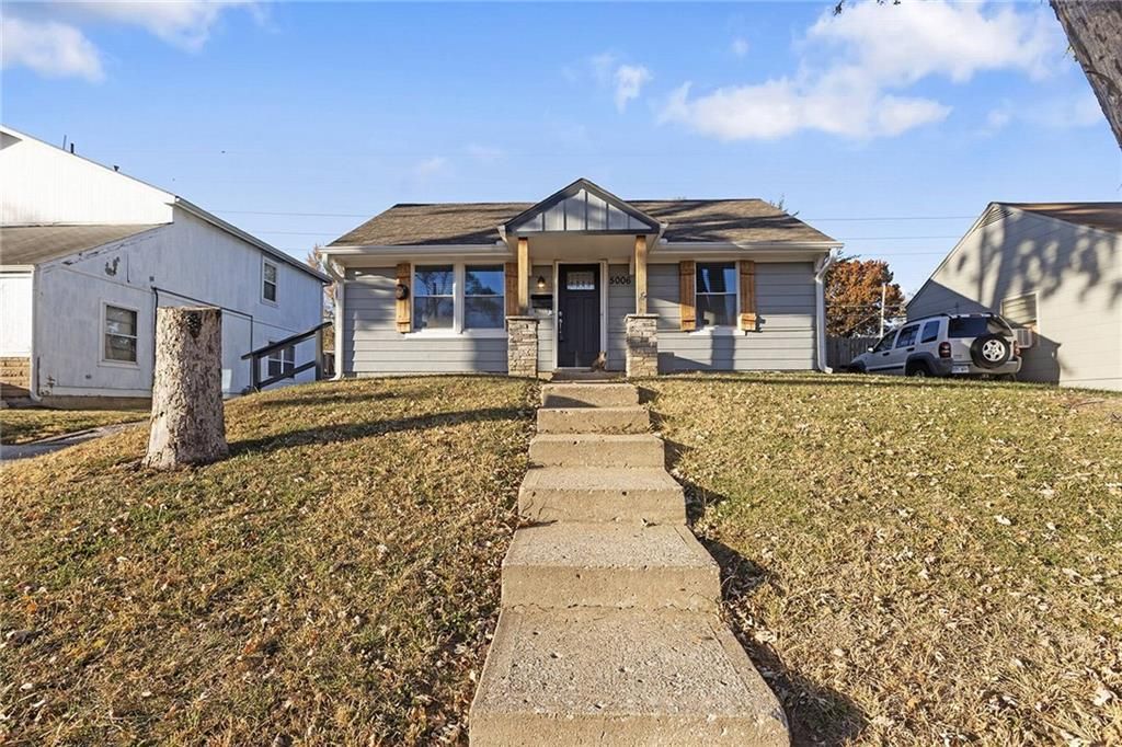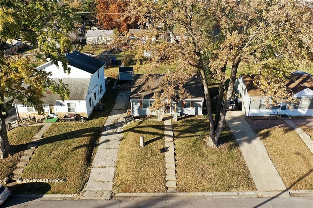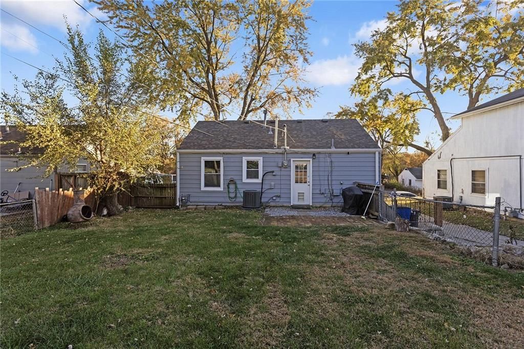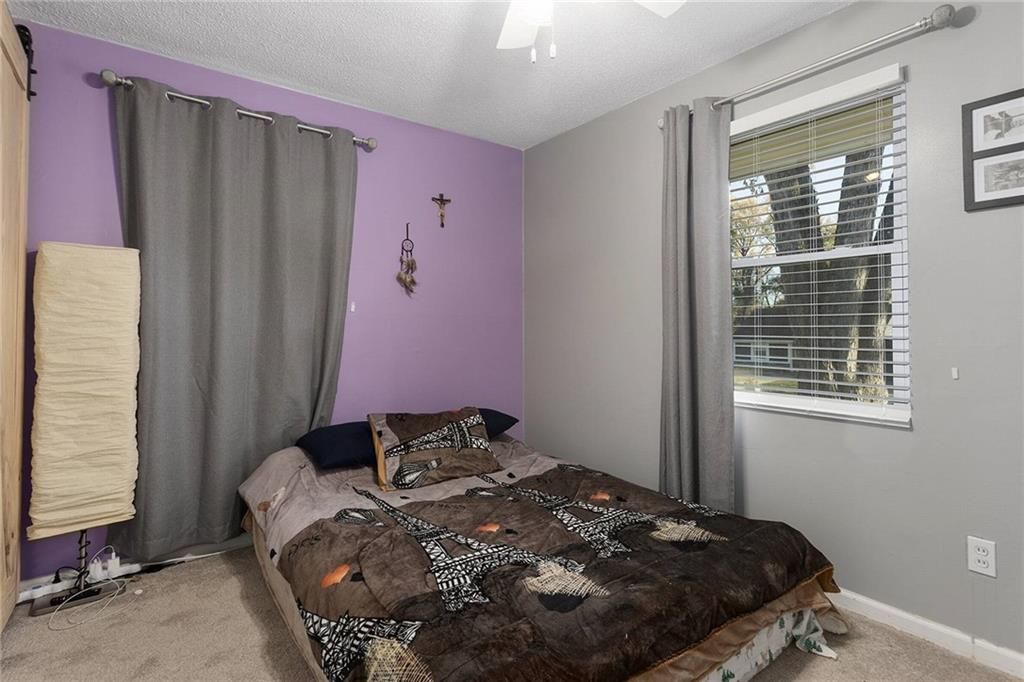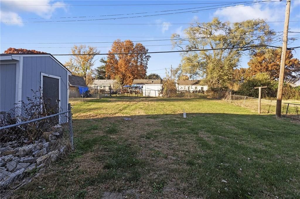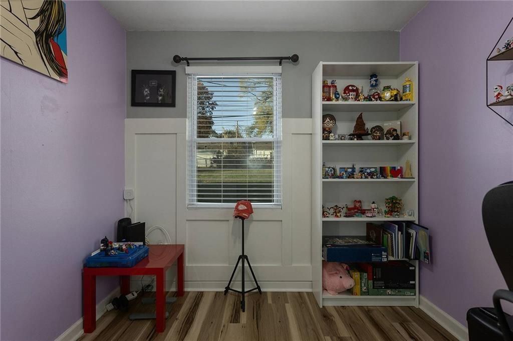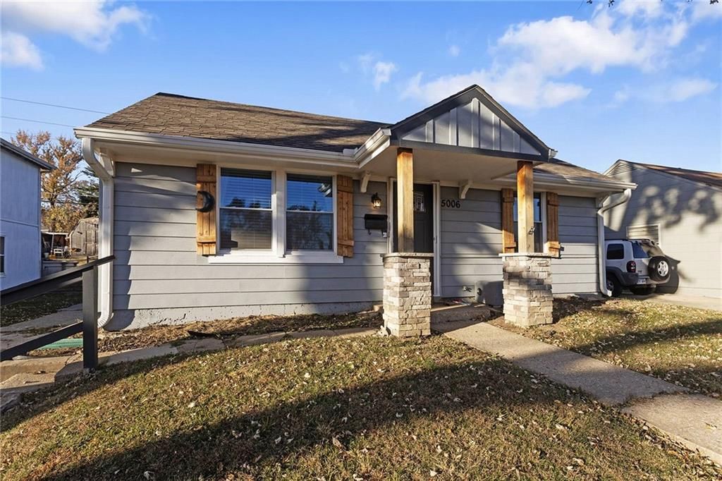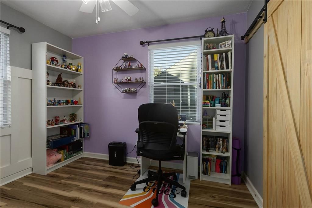 CHARMING! Truly a gem! Painted in a lovely gray with unique wooden shutters, this home stands out. Stone half-pillars mark the entrance. The living room greets you with a bright, light space with updated flooring and a ceiling fan. There is also stylish wainscotting. The kitchen shines with its unique d cor and again, charming features! Open shelving, stained glass window, AND wall feature. Black appliances with contrasting light wood cabinetry, including impressive decorative hardware. This kitchen is stocked with what you need: a pot rack, an island table, and a beautiful linoleum floor with a tile-like look. Peek out the back door to the LARGE backyard just ready to be cultivated. Off the living room is a hallway leading to a bright, white bathroom with a shower-over-tub, a pedestal sink, another stained-glass window, and some storage. Three doors to the Hallway are Art Deco Doors. Hall closet and two bedrooms are also down the hall. Both bedrooms have two windows, a ceiling fan, and barn-door (space savers!) closets with shelving and hanging space. All the windows are thermal and have nice two-inch blinds. The attic space is carpeted and finished, simply slide the barn door to the left all the way and then you can pull down the attic stairs. This home is just waiting for someone to come in and enjoy all of its style and uniqueness! Drop in soon!