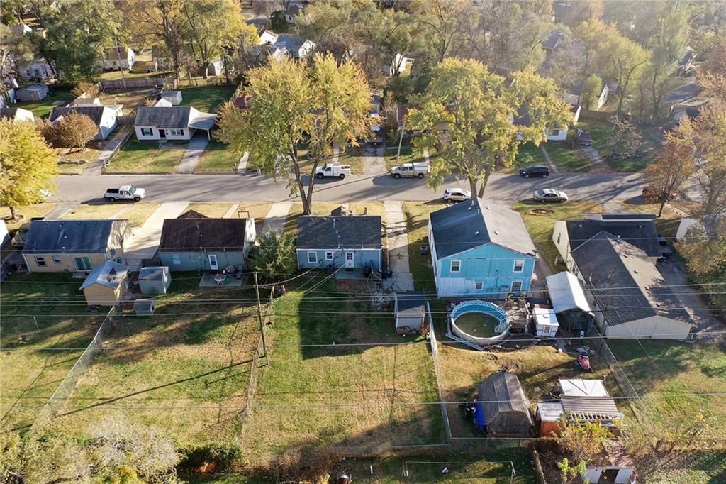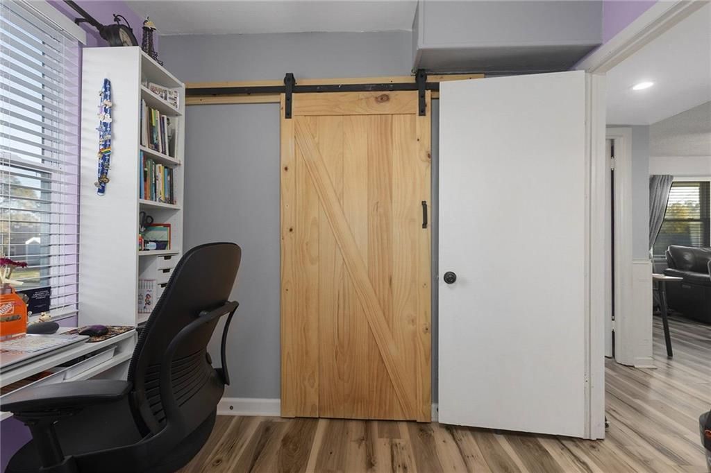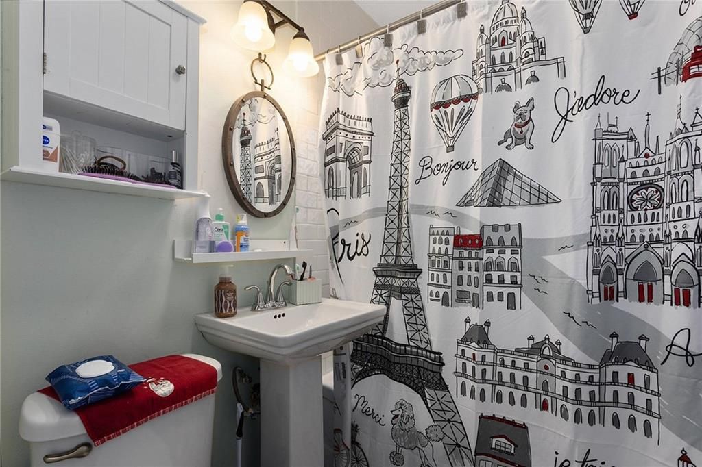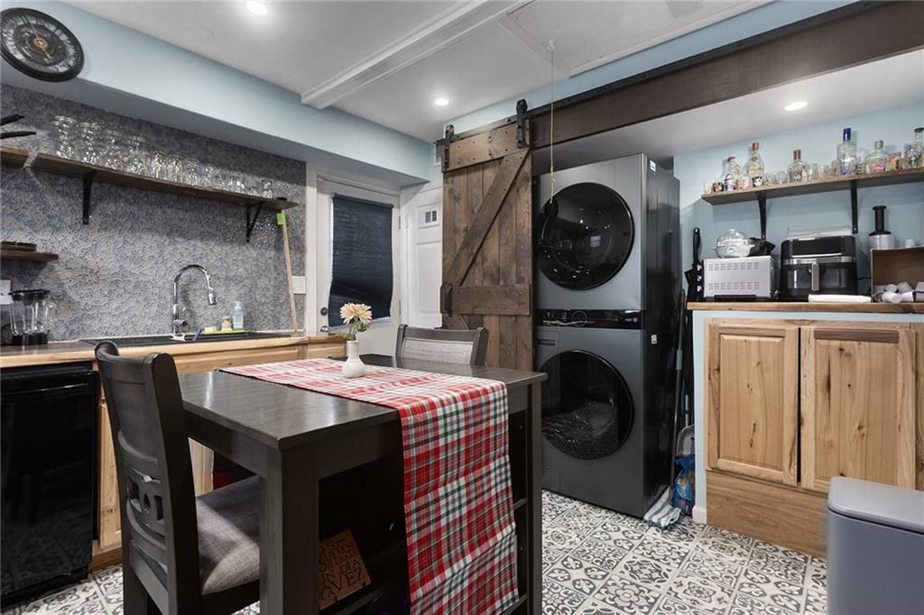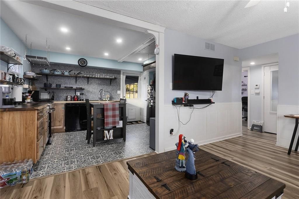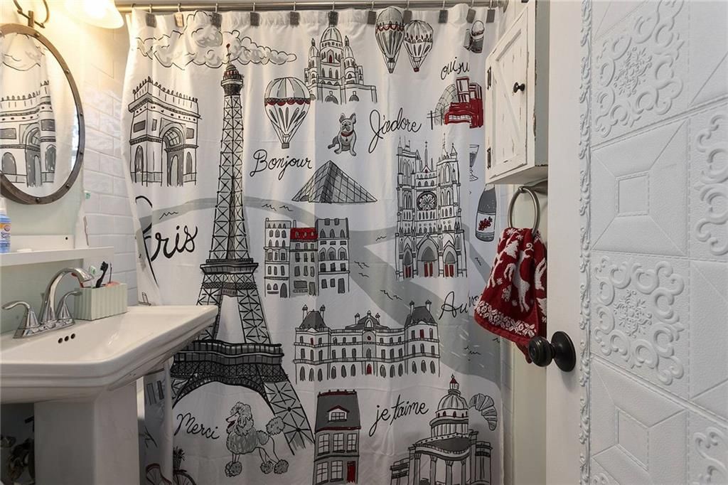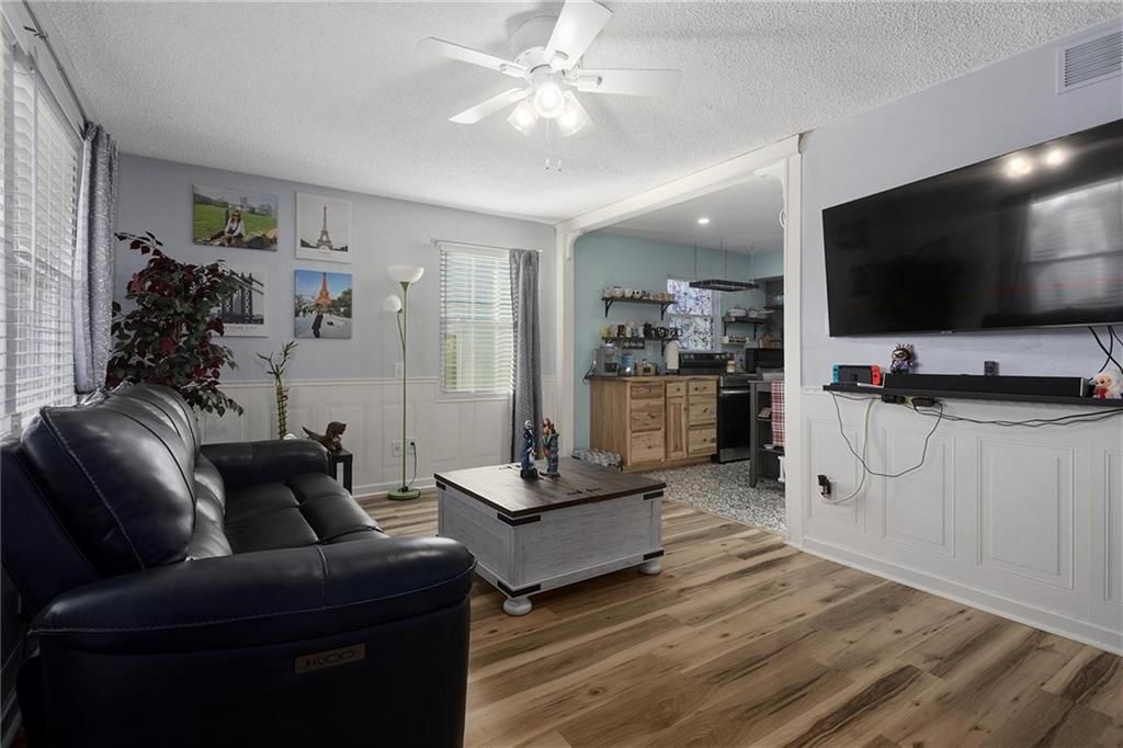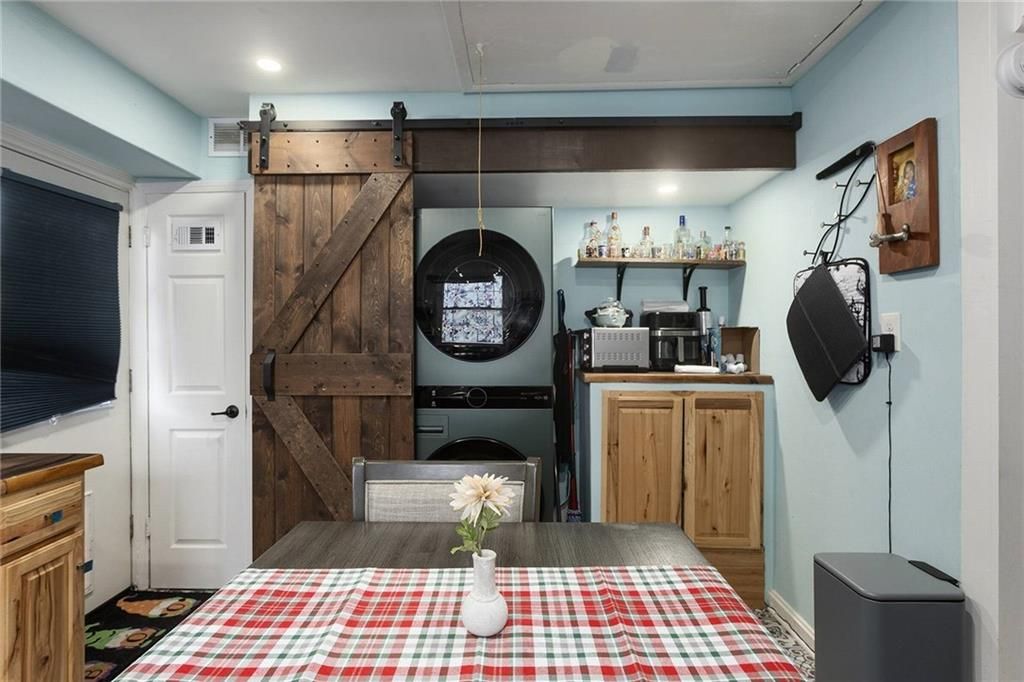 CHARMING! Truly a gem! Painted in a lovely gray with unique wooden shutters, this home stands out. Stone half-pillars mark the entrance. The living room greets you with a bright, light space with updated flooring and a ceiling fan. There is also stylish wainscotting. The kitchen shines with its unique d cor and again, charming features! Open shelving, stained glass window, AND wall feature. Black appliances with contrasting light wood cabinetry, including impressive decorative hardware. This kitchen is stocked with what you need: a pot rack, an island table, and a beautiful linoleum floor with a tile-like look. Peek out the back door to the LARGE backyard just ready to be cultivated. Off the living room is a hallway leading to a bright, white bathroom with a shower-over-tub, a pedestal sink, another stained-glass window, and some storage. Three doors to the Hallway are Art Deco Doors. Hall closet and two bedrooms are also down the hall. Both bedrooms have two windows, a ceiling fan, and barn-door (space savers!) closets with shelving and hanging space. All the windows are thermal and have nice two-inch blinds. The attic space is carpeted and finished, simply slide the barn door to the left all the way and then you can pull down the attic stairs. This home is just waiting for someone to come in and enjoy all of its style and uniqueness! Drop in soon!