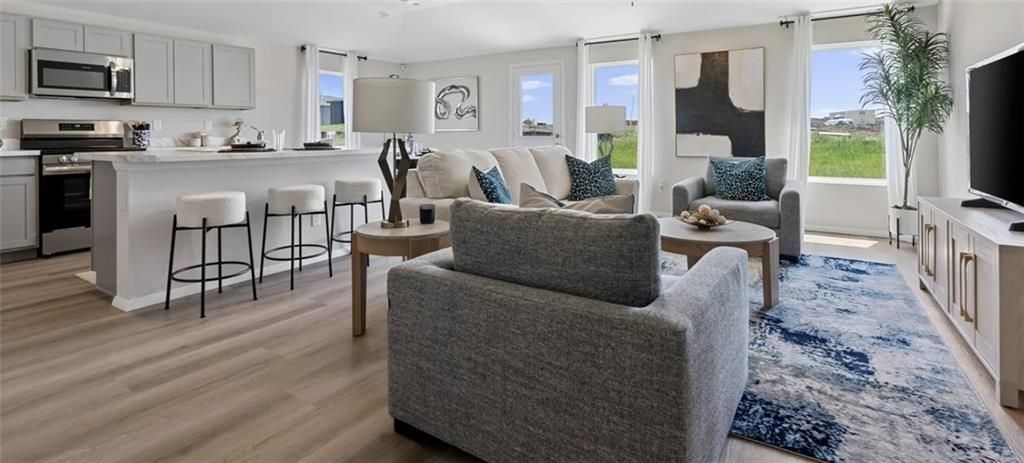 Designed with both style and functionality in mind, this single-level home showcases an open-concept layout where the kitchen, living, and dining areas come together and extend effortlessly to an outdoor patio. The private bedroom wing includes three bedrooms, highlighted by a serene owner's suite at the rear of the home featuring a full bath and walk-in closet. Photos are of a completed home. The color samples are what was chosen for this home's finishes. LEVEL, CORNER HOMESITE BACKING TO TREES!