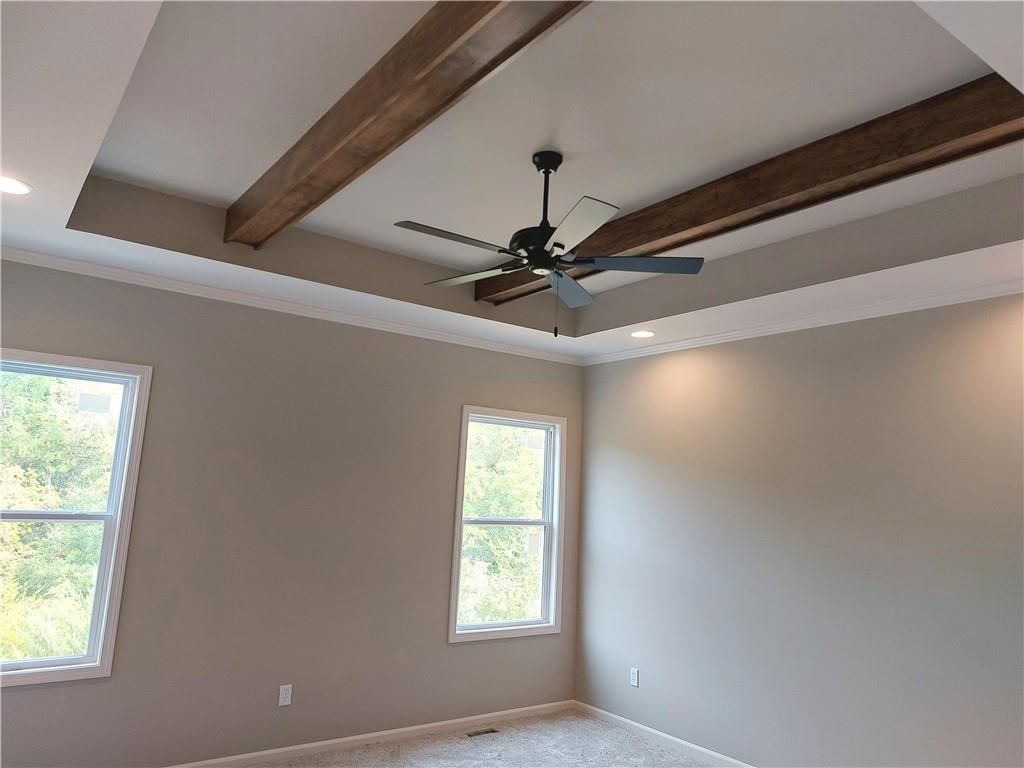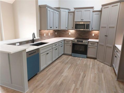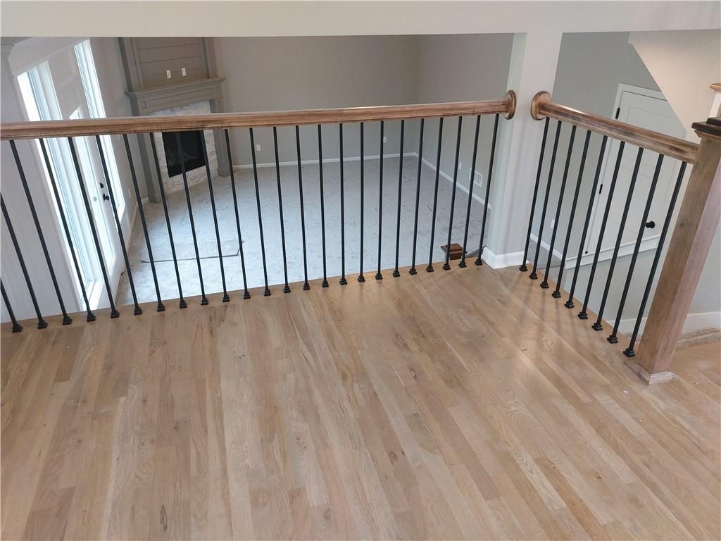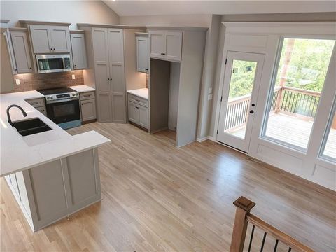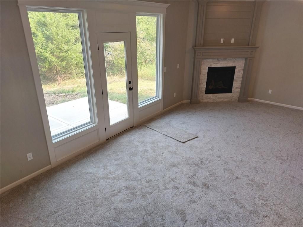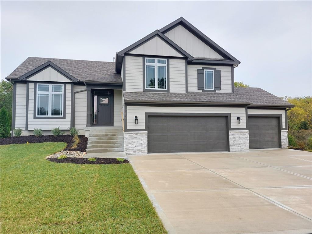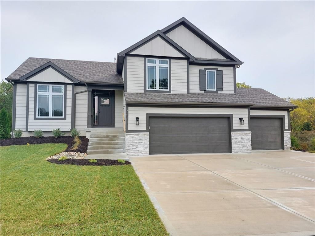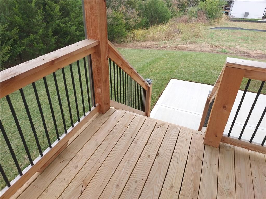 Ready for paint touch-up and final clean! This same floor plan is on Lot 137. Nestled on a private cul-de-sac and backing to serene trees and green space, this home offers both privacy and natural beauty. Located in the county - **no KCMO E tax** - you'll enjoy added savings while still being close to everything. The 12x12 covered deck includes stairs leading down to a spacious patio, perfect for outdoor entertaining. Inside, the open-concept layout features solid hardwood flooring throughout the main level, and stunning granite and quartz countertops in all kitchens and baths. The finished walk-out lower level includes a spacious family room that opens to the patio. The primary suite boasts a box-vault ceiling with gorgeous stained beams and a large walk-in closet. Additional highlights include a walk-in pantry, rounded drywall corners, and an ultra-quiet dishwasher.