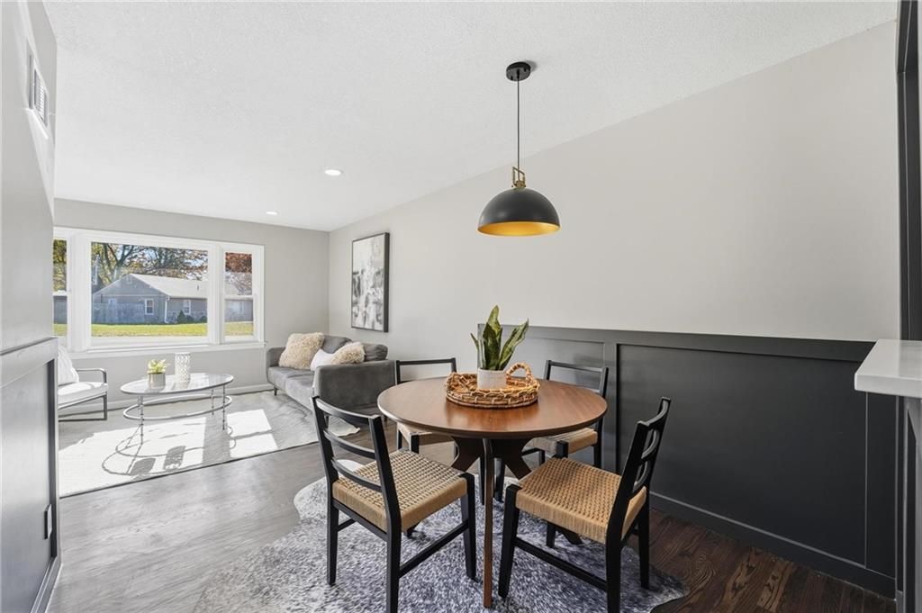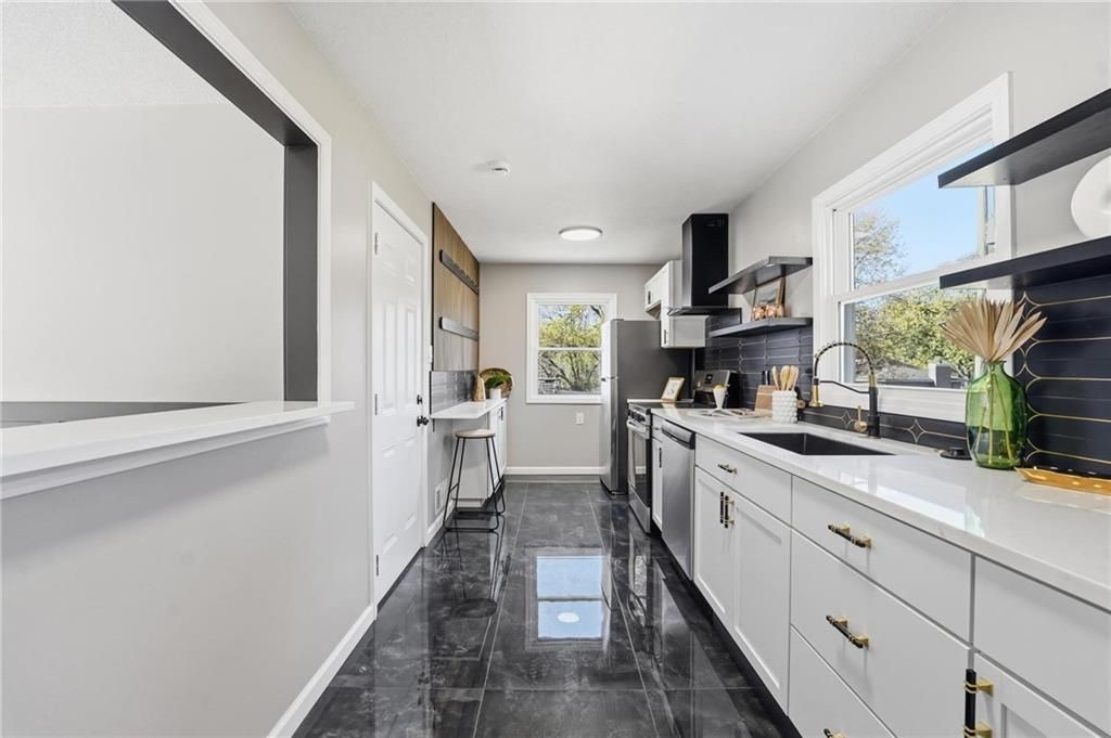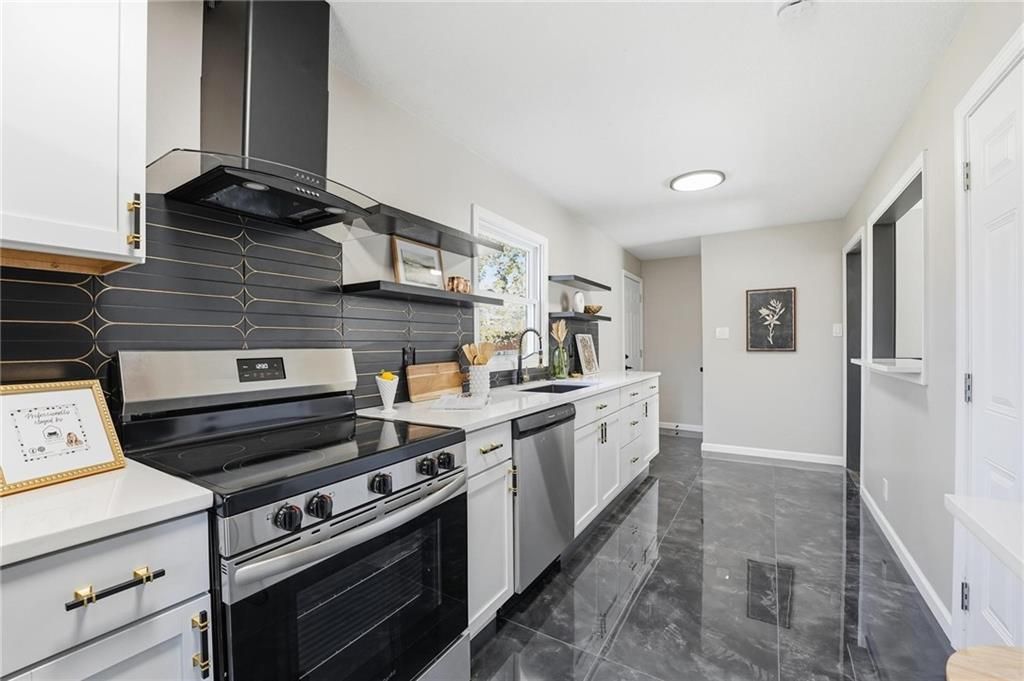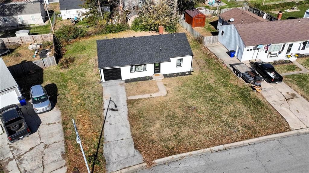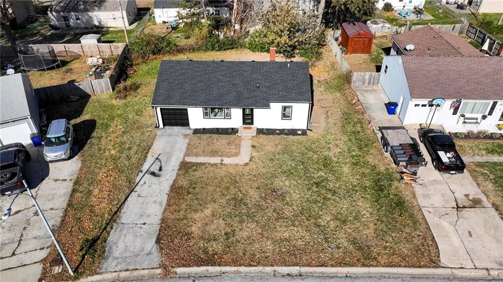Beautifully Renovated Ranch in the Heart of the Northland! This fully updated 3-bedroom, 2-bathroom ranch-style home offering modern finishes, timeless design, and unbeatable convenience in Kansas City's Northland. Recent exterior improvements include new siding, new windows, and a new roof, providing long-term peace of mind and excellent curb appeal. Inside, a bright and inviting living space features refinished hardwood floors, fresh neutral paint, and updated trim and hardware for a clean, cohesive feel. The stunning designer kitchen serves as the centerpiece of the home, showcasing sleek black tile accents with gold detailing, quartz countertops, open shelving, new stainless steel appliances, and upgraded cabinets and hardware. The dining area sits just off the kitchen for easy everyday living and entertaining. Both bathrooms have been fully remodeled, featuring modern tilework, stylish lighting, and high-quality fixtures. All three bedrooms offer comfortable space with updated finishes throughout. The expansive unfinished basement is freshly painted and ready for storage, a workshop, or future expansion. A one-car garage and large driveway provide convenient off-street parking. Outside, the freshly painted concrete patio offers a perfect spot for outdoor dining and relaxation. Located minutes from dining, shopping, schools, and major highways, this home blends style, comfort, and location into one incredible opportunity. Don't miss your chance to own this beautifully updated Northland ranch!