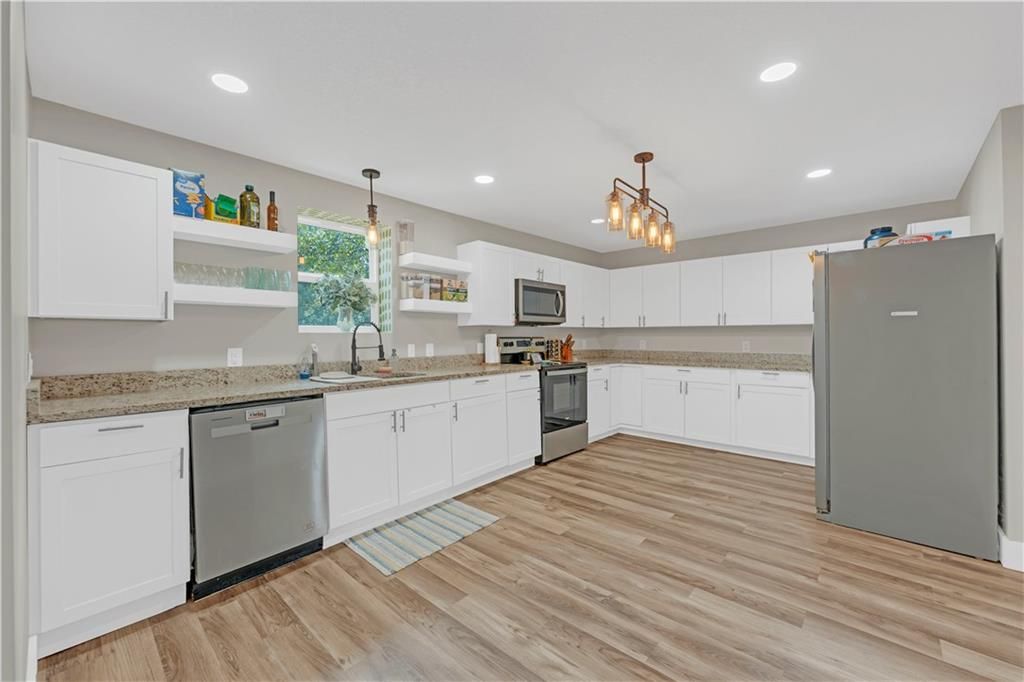 Don't miss your chance to see this gorgeous 1910 built two story home. It features large rooms and tall ceilings. The beauty undertook a complete remodel in 2022/2023. Enjoy a beverage on you huge wrap around front porch. As you step into the home, you are welcomed into a beautiful foyer. Then step into the open concept living room, dining room, and huge kitchen. The living room/dining room combination leaves you with options for your dining table placement and includes an electric fireplace and shiplap mantle. And this bright white kitchen with appliances is a dream come true with all the cabinets for storage, countertops for prepping, and space left over for you to add an island. The main floor includes two bedrooms along with one full bathroom which includes a bathtub. All 5 bedroom closets have closet organizers! The second floor includes the massive primary bedroom, walk in closet, and en suite bath with double vanity and private water closet. The other two bedrooms are also very spacious and have a full bath with walk in shower.So much new...Roof, HVAC, siding, windows, drywall, flooring, light fixtures, kitchen appliances, cabinets, countertops, vanities, toilets, etc, etc.