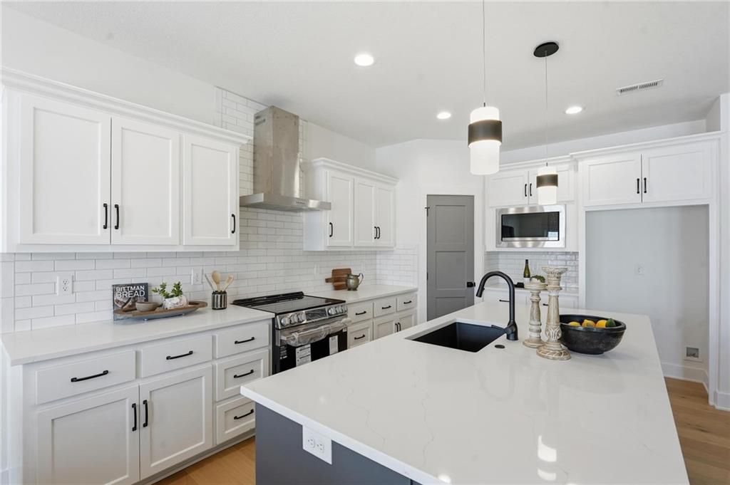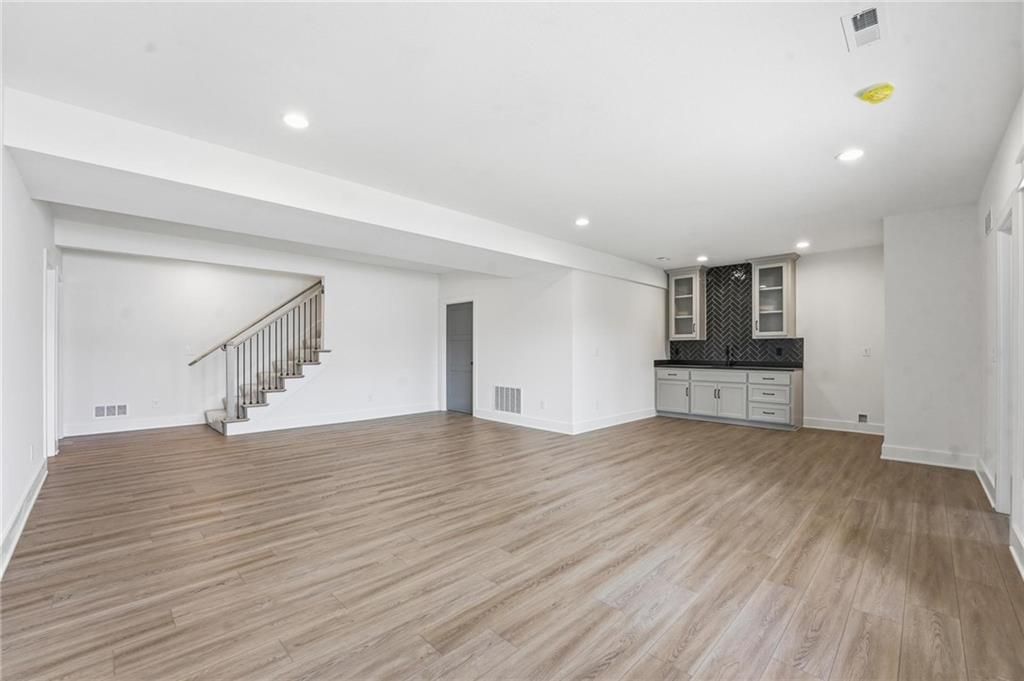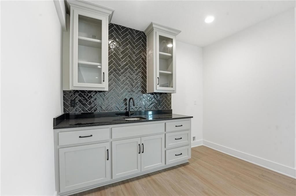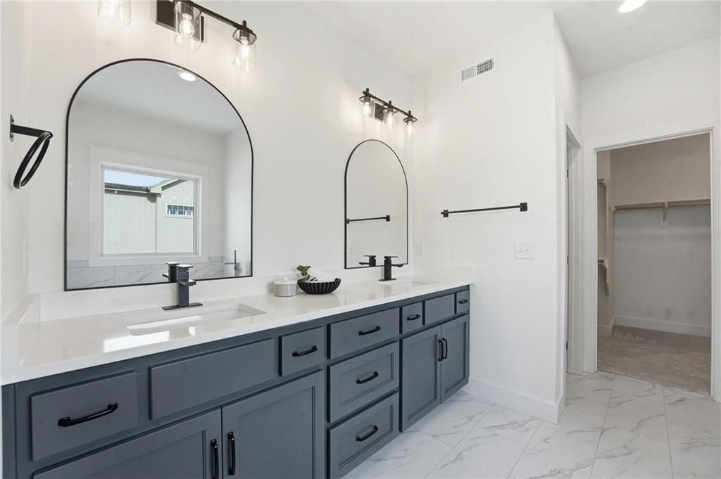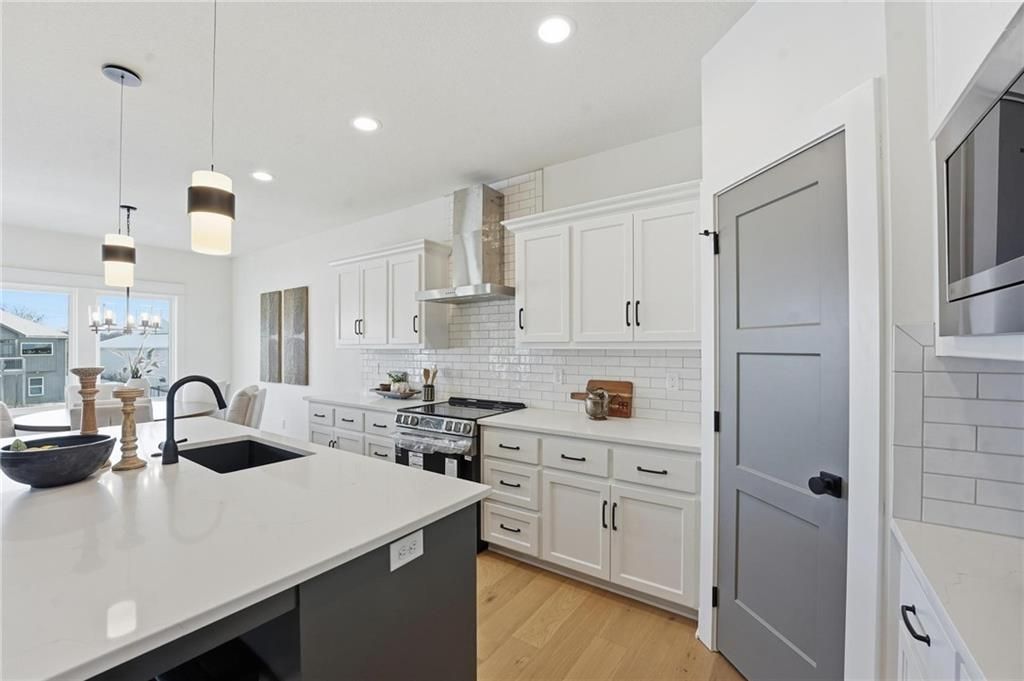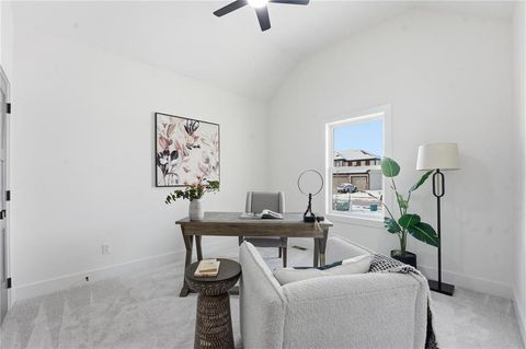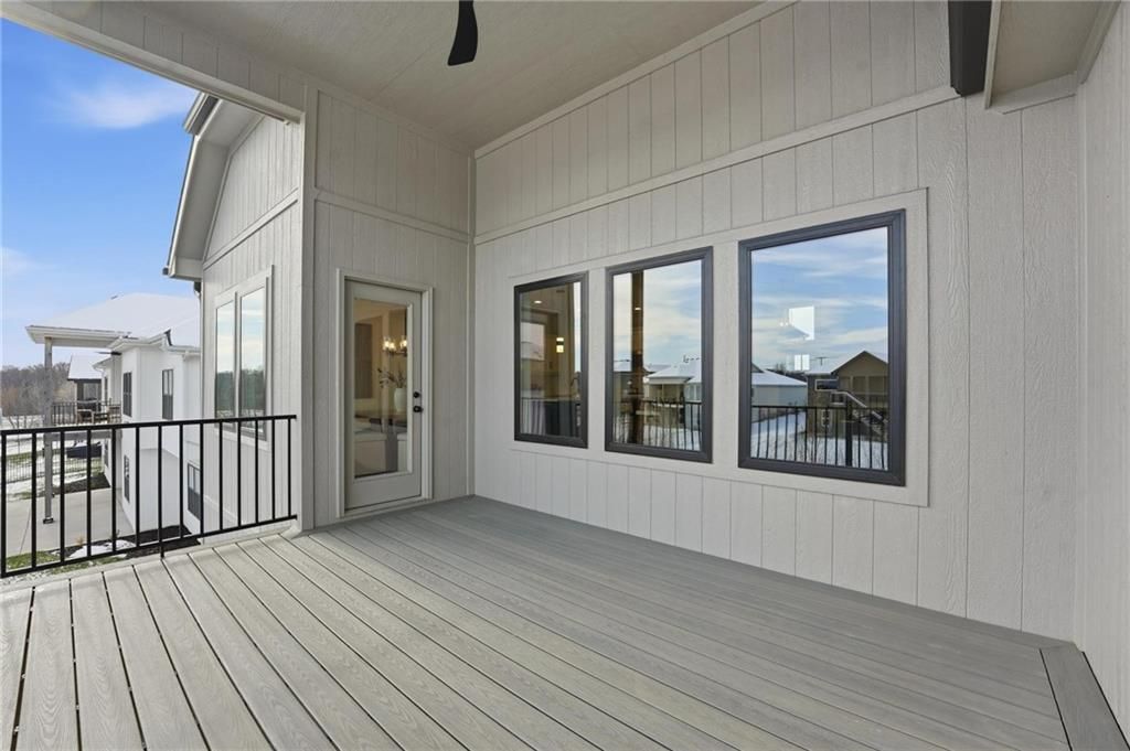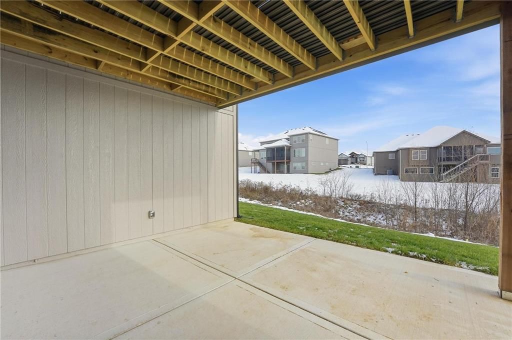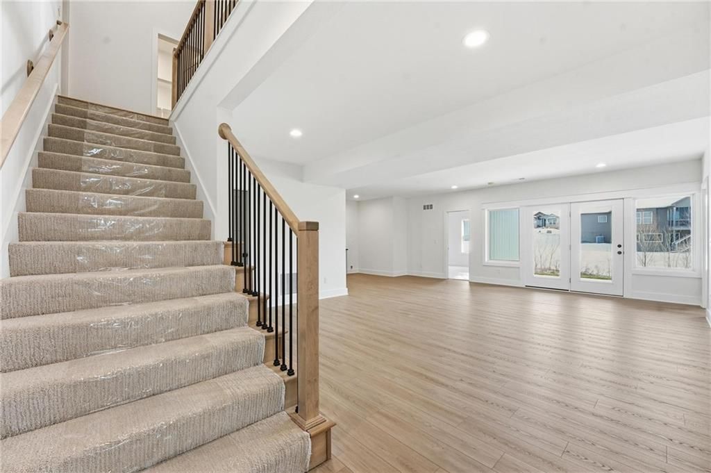 Come explore this recently finished reverse 1.5-story in Riverstone, perfectly situated to back to tranquil common space. With 3,028 sq ft, this home offers 5 bedrooms, 3 full baths, and a 3-car garage - a spacious design that blends comfort and style. Main Level Living: The primary suite and a versatile guest bedroom (currently staged as an office) anchor the main floor. Expansive windows line the back of the home, filling the great room and kitchen with natural light. Step out onto the covered deck to enjoy peaceful views. Lower-Level Retreat: A recreation room with wet bar, three additional bedrooms, and a full bath provide plenty of space for media, gaming, or entertaining. Exterior & Efficiency: Smart siding with stone accents enhances curb appeal, while the builder's attention to energy efficiency ensures lasting value. This home combines modern design with functional living, offering room for guests, and gatherings. Don't miss the opportunity to own a property that balances design, efficiency, and community living in one of Kansas City's most desirable neighborhoods. Taxes, measurements, and square footage are estimated.