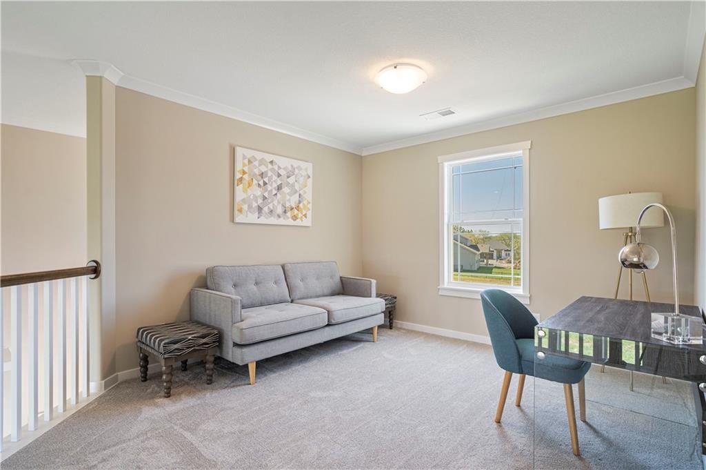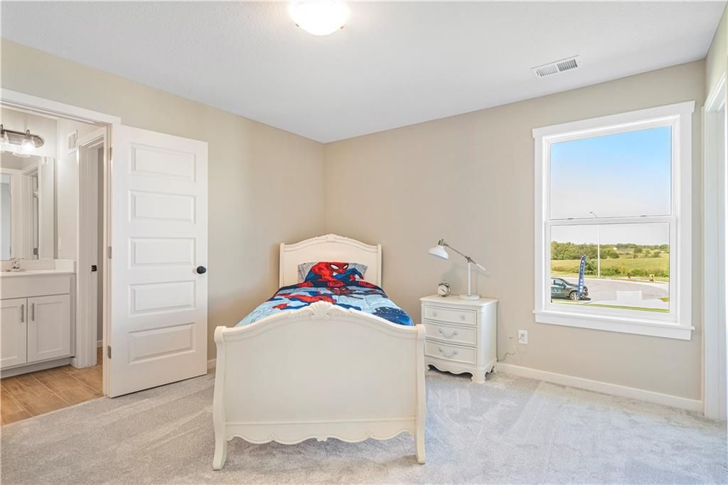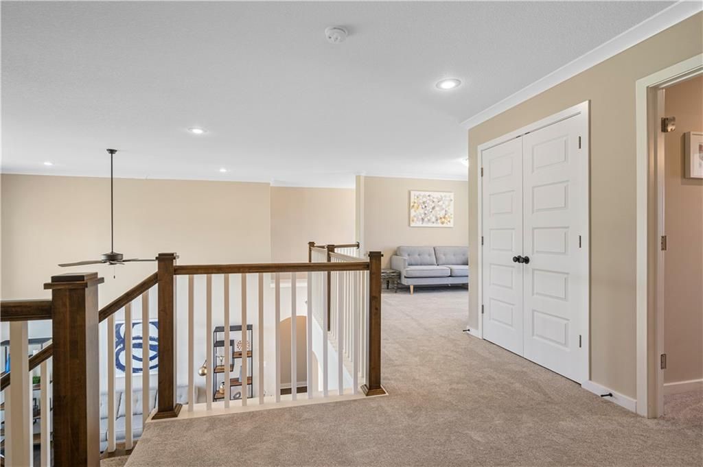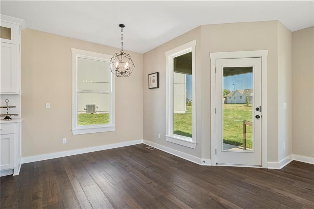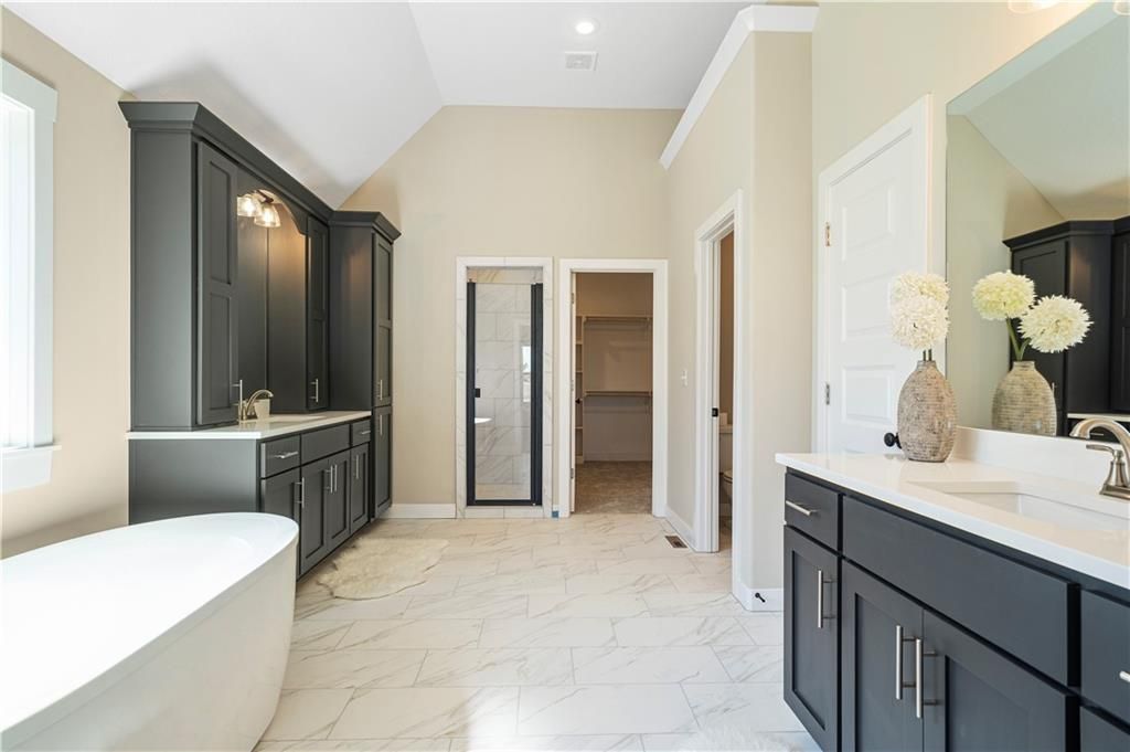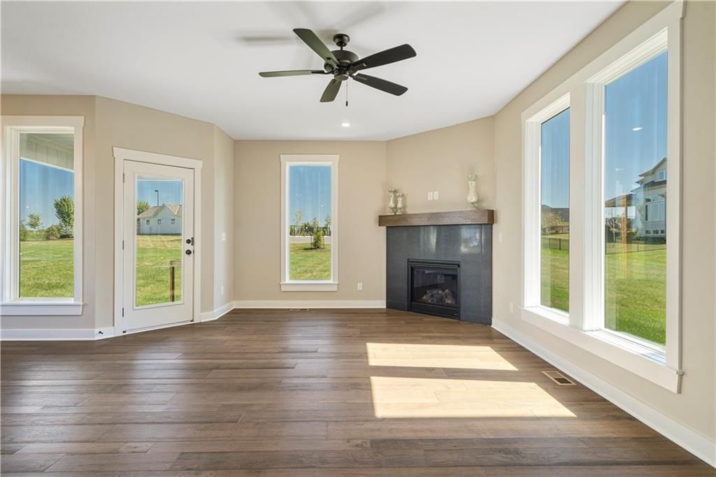 Stunning 1.5-story home by McFarland Custom Builders, the last new construction home in the desirable Woodneath Farms community. This gorgeous property backs to lush greenspace, offering tranquility and privacy. The impressive great room features a two-story wall of windows that floods the space with natural light, while the cozy hearth room with fireplace provides a perfect spot for relaxation. Enjoy both a formal dining room and a separate breakfast room for versatile dining options. The large kitchen island, stainless steel appliances including a double oven, and spacious walk-in pantry make this a chef's dream. Main floor laundry includes a convenient desk area. The luxurious primary bedroom suite offers a freestanding tub, separate shower, double vanities, and a walk-in closet. Upstairs, you'll find three generously sized bedrooms with walk-in closets, two full bathrooms, and a loft overlooking the great room. A covered deck adds even more outdoor living space. Don't miss out on this unique opportunity! Taxes & room sizes estimated. Great Hunt Midwest Community w/ competition sized pool, tennis court, walking trails, playground, picnic pavilion & more. Est. completion 30-45 days. Actual photos 11-16-25 with simulated photos of a completed model. Details and selections may vary.