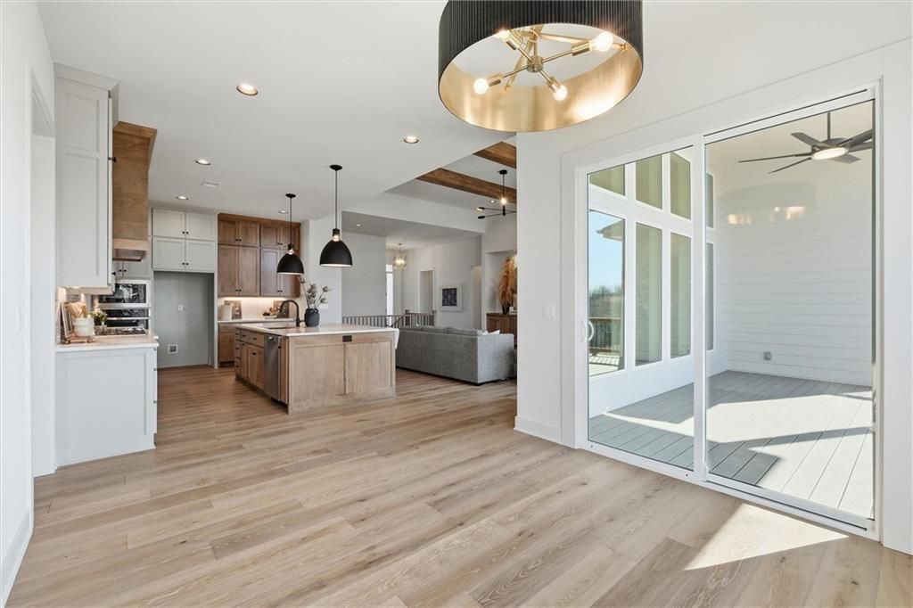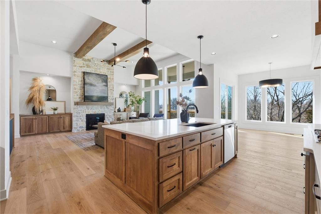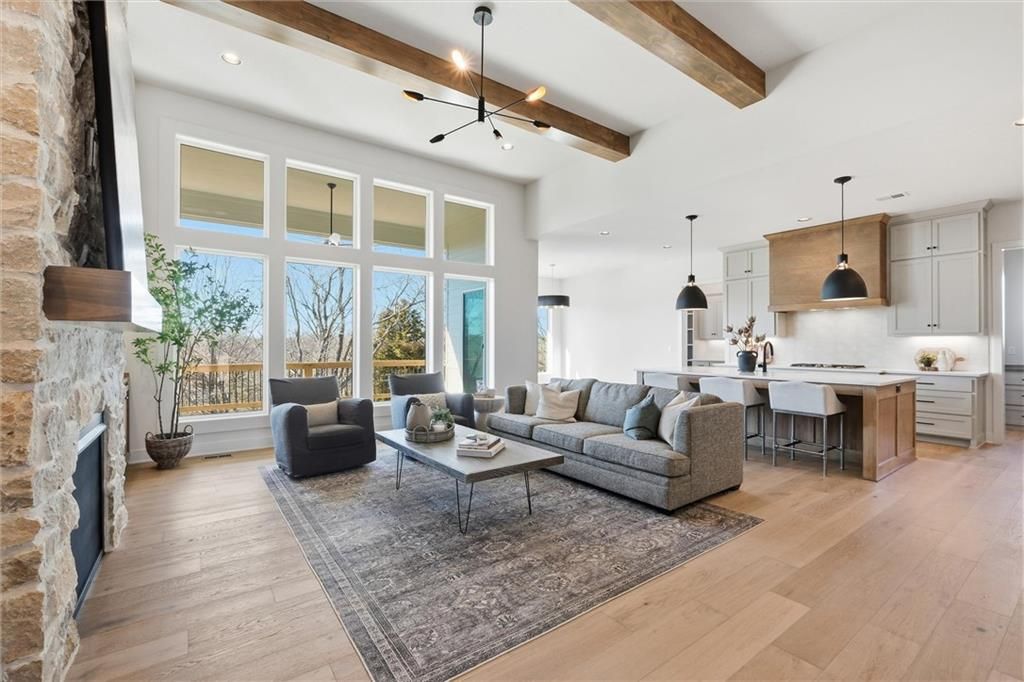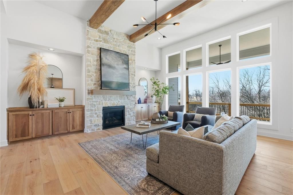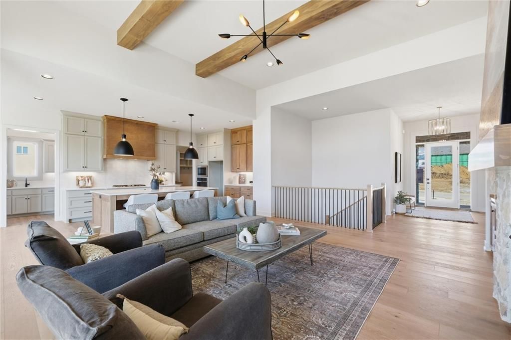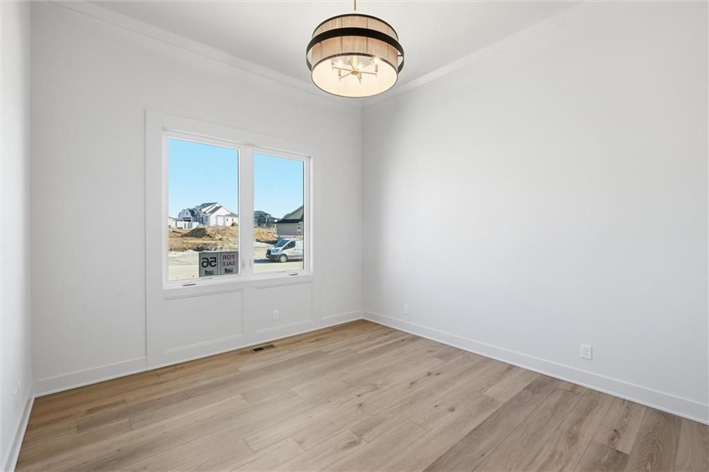 MOVE-IN READY! Introducing the NEW Oakmont reverse 1.5-story by Bickimer Homes, thoughtfully designed for elevated everyday living and effortless entertaining. Situated on a picturesque wooded walk-out homesite, this 4-bedroom, 4.5-bath home with a 3-car garage showcases refined finishes and intentional design throughout. The main level offers two bedrooms and two-and-a-half baths, including a flexible front bedroom ideal for a private home office or guest suite with full bath access. At the heart of the home, a stunning kitchen with oversized island anchors the open-concept layout, flowing seamlessly into the vaulted great room featuring exposed beams, custom built-ins, and a striking floor-to-ceiling stone fireplace. A spacious dining area is surrounded by large windows capturing serene treed views. Designed with entertaining in mind, the kitchen is complemented by a walk-through prep pantry with cabinetry, counter space, and sink, connecting directly to the grilling deck - perfect for hosting and everyday convenience. Outdoor living continues with a covered deck and covered patio, creating multiple spaces to relax and gather while overlooking the wooded greenspace. The walk-out lower level expands the living space with a generous recreation room, large windows for natural light, two additional bedrooms with en-suite baths, and ample storage. Located on Lot 56 in Enclave at Manchester Park, this home is tucked among mature trees in a quiet yet conveniently located community.