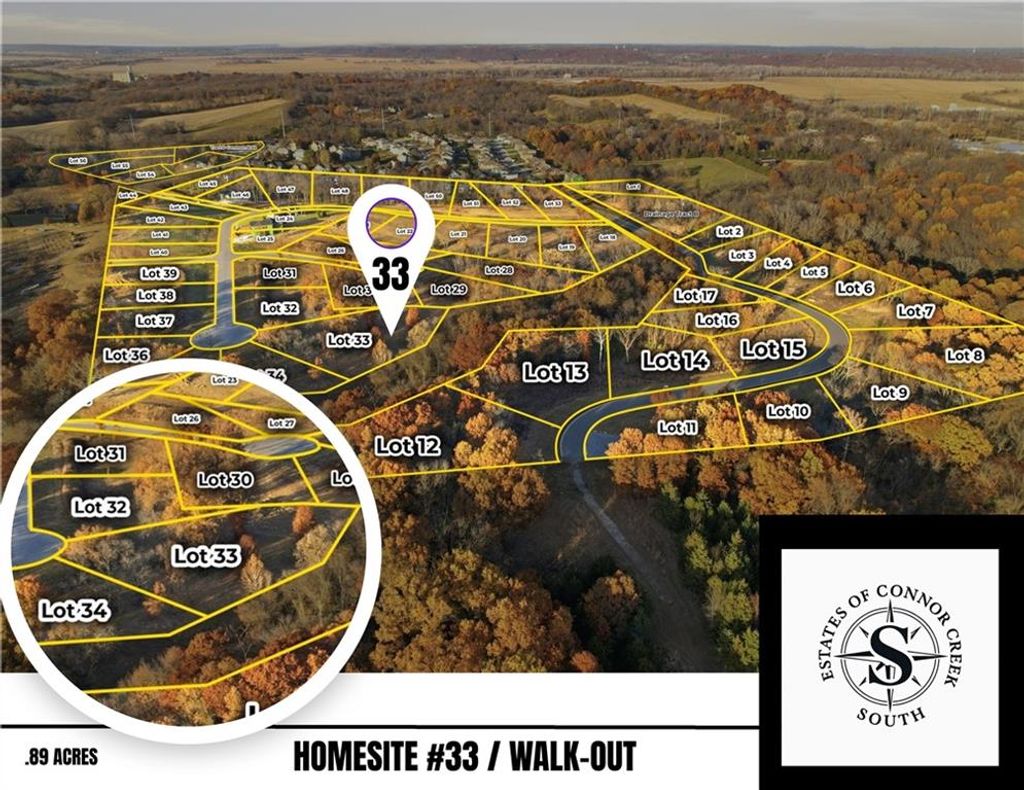 JUST UNDER 1 ACRE, CUL-DE-SAC, WALK OUT "BUILD READY" HOME SITE #33 = Where Luxury Breathes & Dreams Break Ground! A place where the horizon stretches wider, the air feels lighter & the promise of your future home begins long before the foundation is poured. On the edge of Kansas City, a new community set apart featuring a rare collection of homesites that have been carved into the rolling landscape just beyond the Legends in Kansas City, KS! A mix of sprawling .5+ acre to 1+ acre estate lots that invite you to design a residence worthy of your dreams. Each homesite offers sweeping views, surrounded by mature trees, open skies, and the quiet rhythm of nature - all set along winding paved streets with curbs, gutters + city sewer! Where countryside serenity meets effortless access in the award-winning Piper School District. A premier location just 20 minutes from KCI International Airport, the historic charm of Weston, the riverfront elegance of Parkville, the vibrant culture of Lawrence & the stability of Fort Leavenworth. You're also around the corner from The Legends premier shopping, elite dining, endless entertainment and sporting events and venues! Championship golf courses, natural sanctuary of WYCO Lake w/ chart-topping musical performances at Azura Amphitheater. Finally, convenience is within reach - yet life feels wonderfully private. Existing Amenities help set the tone for elevated living w/o the wait. Those seeking guidance. Our ONSITE preferred custom builder stands READY to collaborate OR help you find the right builder & turn your dreams into reality! This is not simply a place to build a home, it is the beginning of your story! Take a scenic drive & preview this EXCLUSIVE collection of 56 beautiful homesites, each tucked into the reserved hills of this BRAND-NEW community, where your estate begins with a dream & rises into a life lived beautifully in the heart of Kansas City, KS.